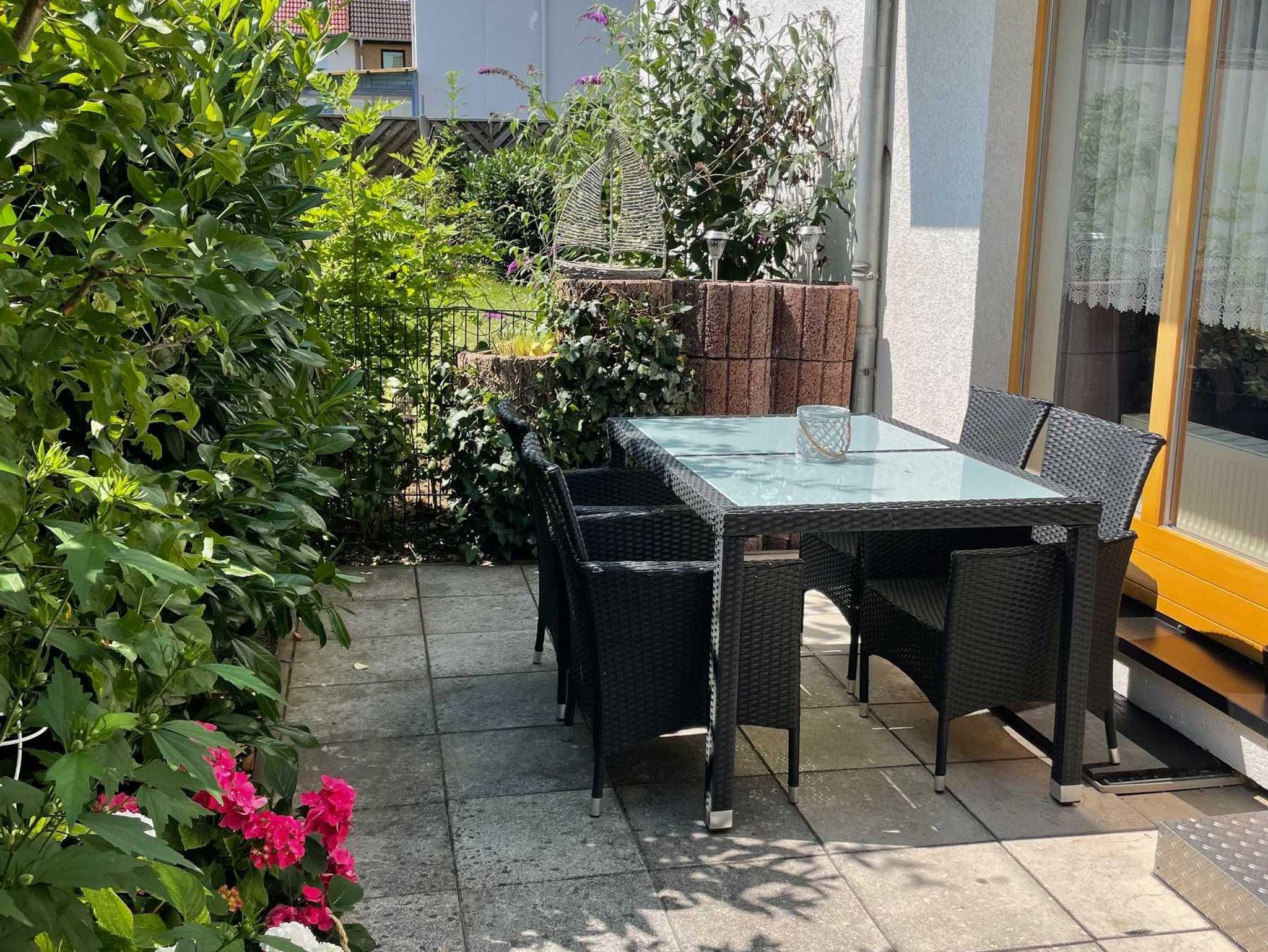 Die Terrasse ist mit einer Liege und Gartenmöbel ausgestattet.