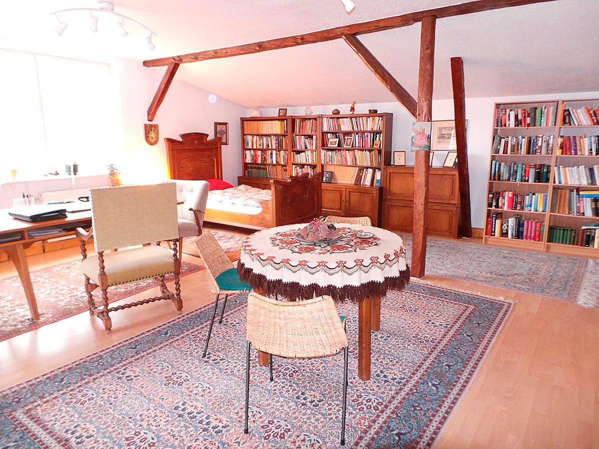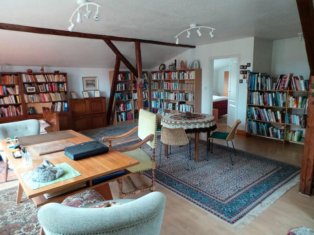 Das Obergeschoss glänzt mit dem großen Wohnzimmer mit riesiger Bibliothek. Entspannen Sie sich und stöbern Sie in einem unserer vielen Bücher. Hier befindet sich außerdem ein Einzelbett, auf dem eine weitere Person prima träumen kann.
