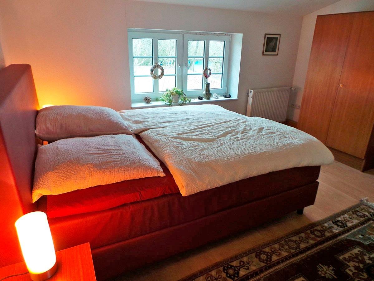 Das Schlafzimmer ist auch mit einem Doppelbett (Boxspringbrett) ausgestattet, die Solarium-Liege lädt außerdem zum Entspannen ein. Das Bad im OG verfügt, genauso wie das Bad im EG, über eine komfortable Dusche, ein Waschbecken mit Spiegel sowie über eine Toilette. Hier befindet sich außerdem der Zugang zur 6-Personen Sauna, die Sie gegen einen kleinen Aufpreis pro Nutzung nutzen können.