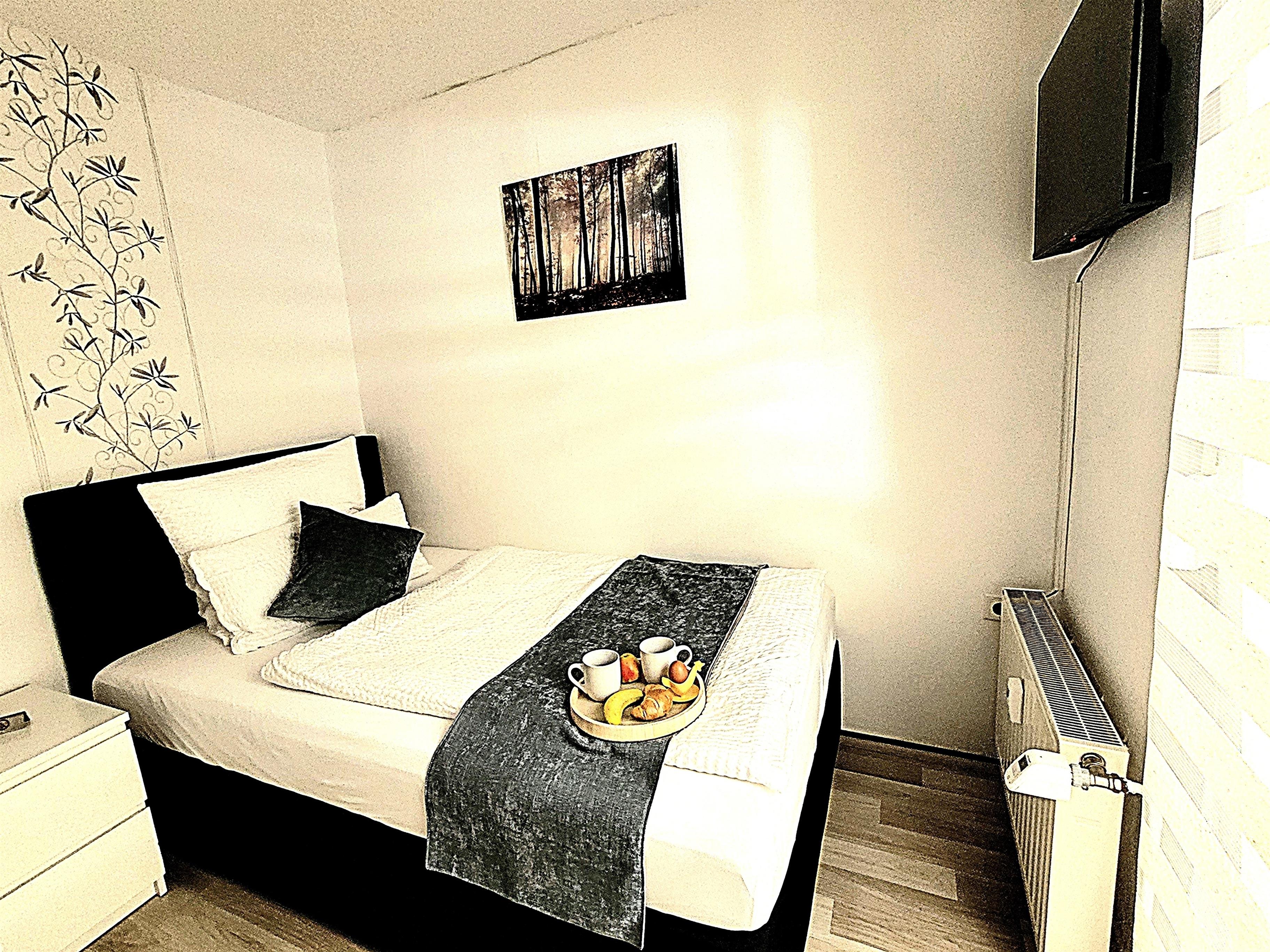 1 Schlafzimmer mit Doppelbett, Topper und Smart TV