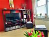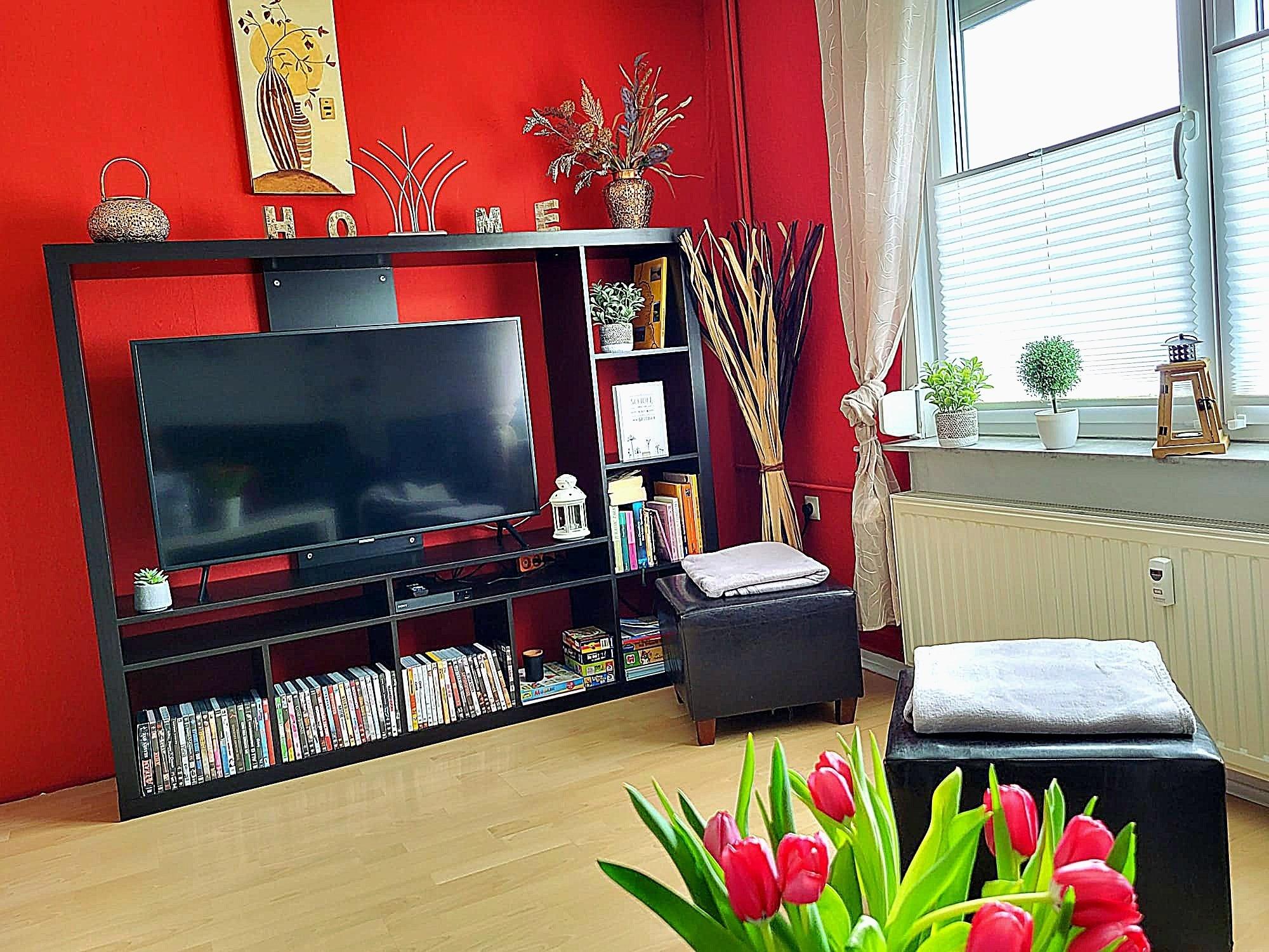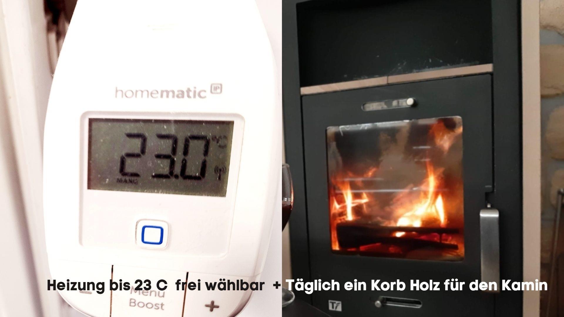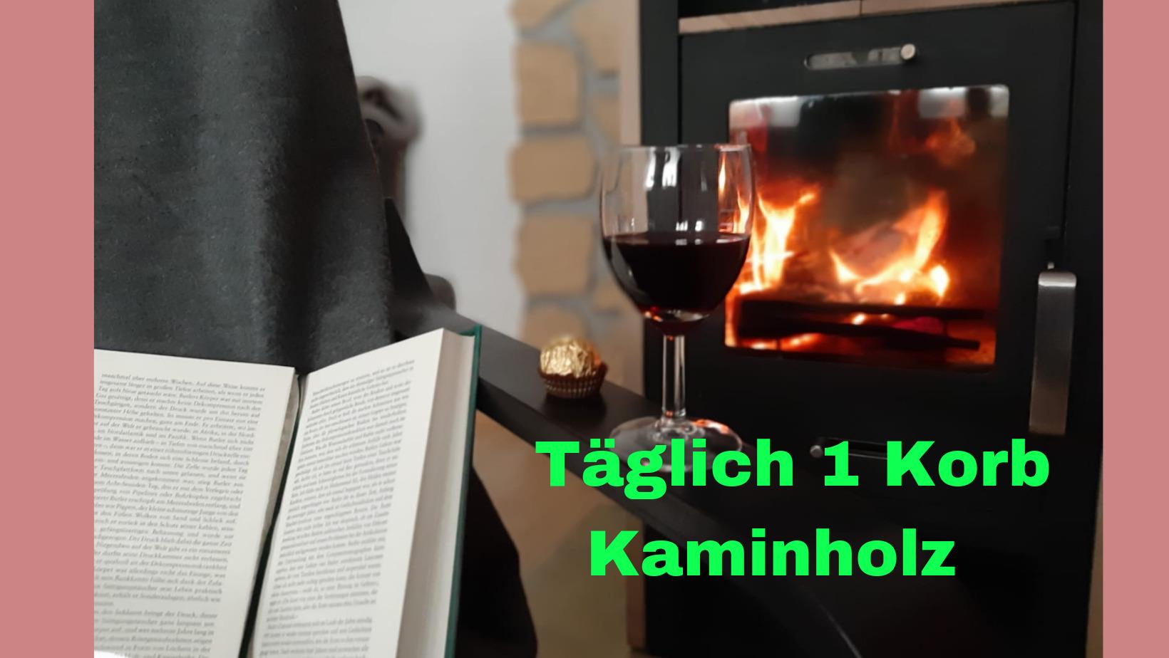 1 Wohnzimmer mit Smart TV und Kaminofen, Kaminholz