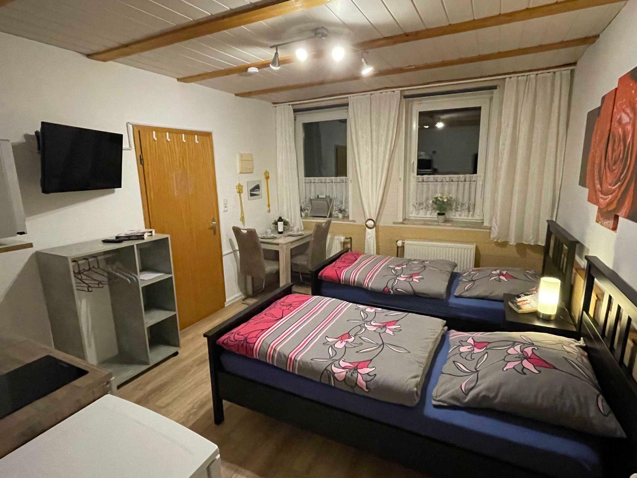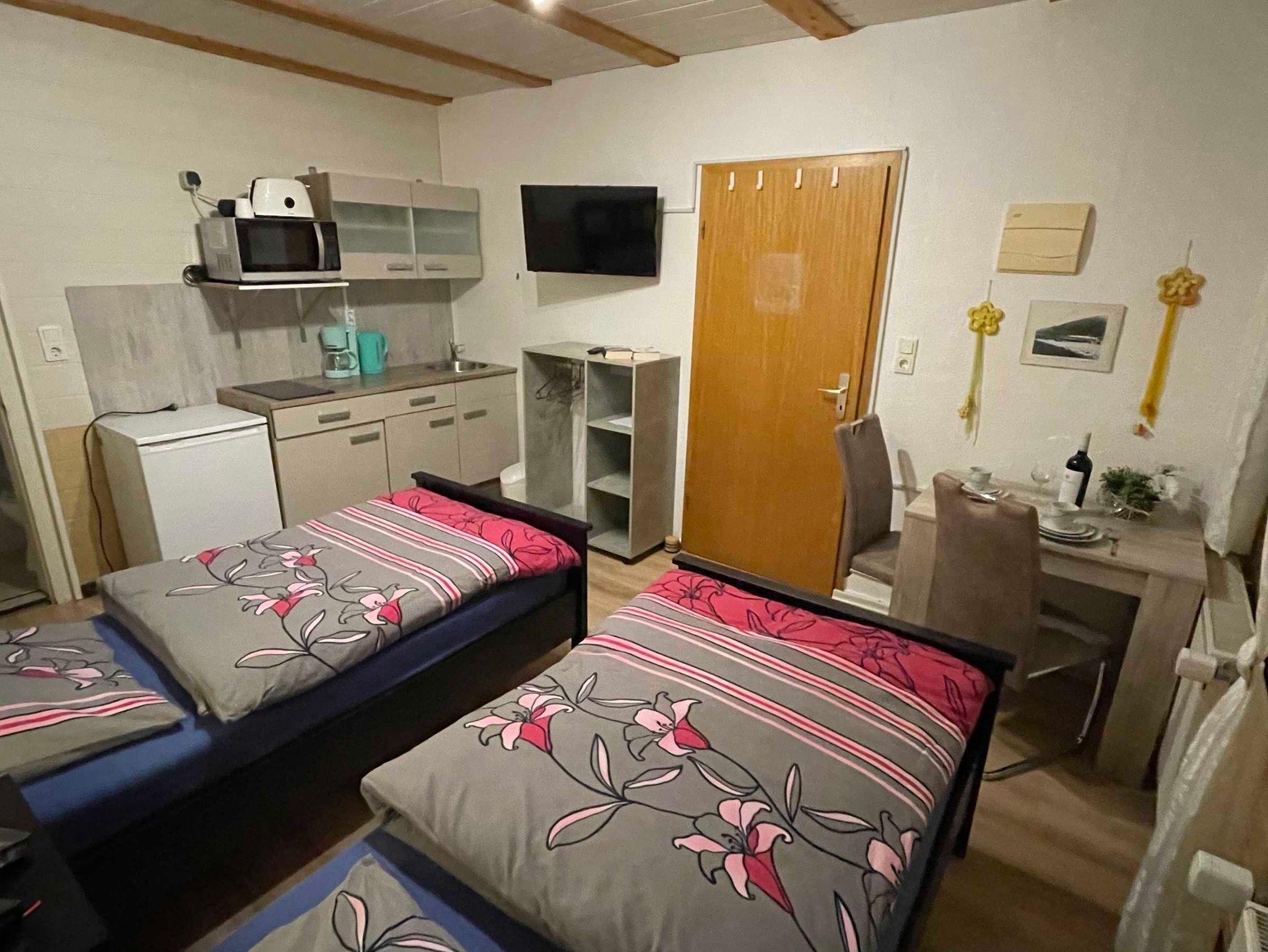 Das Zimmer (16m²) verfügt über 2 einzelne Betten, eine Essecke mit 2 Stühlen, einen Flachbild TV, eine komplett ausgestattete Küche mit Grill ? Mikrowelle und einem Kühlschrank sowie ein Bad mit Dusche.