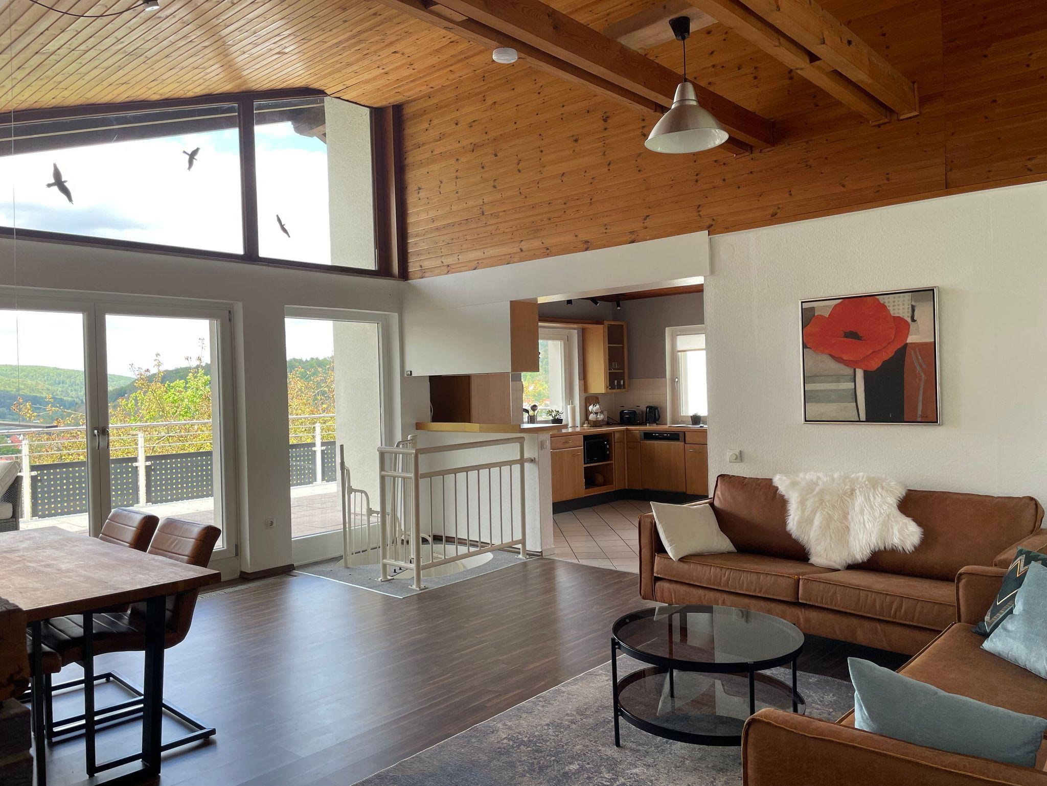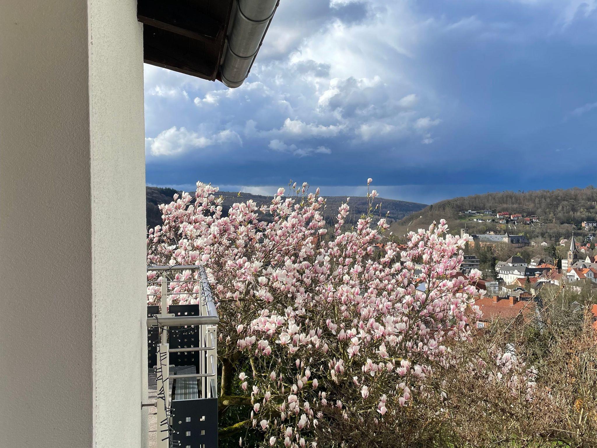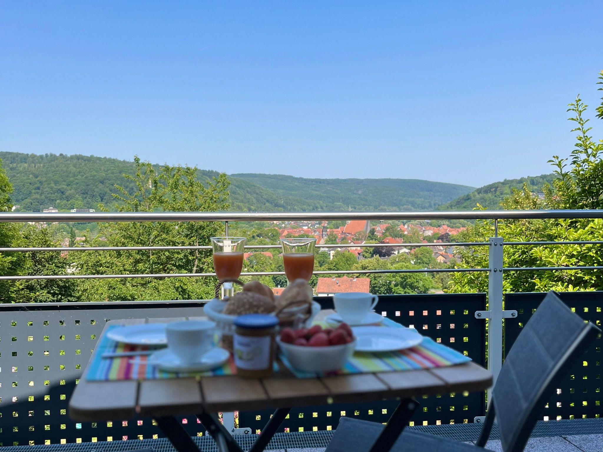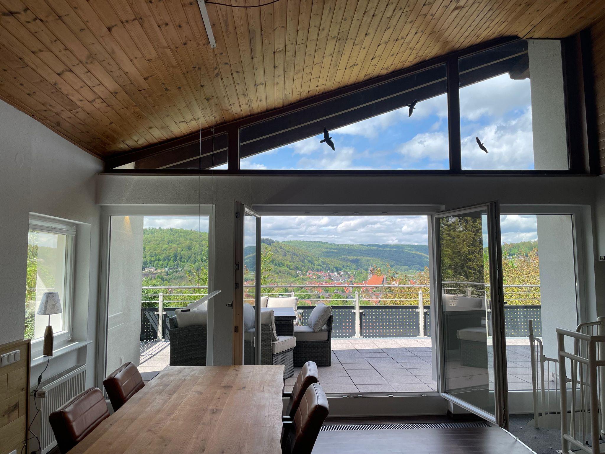 Vom Wohnzimmer aus erschließt sich der sehr große Balkon mit Loungemöbeln zur Sonnenseite und mit Blick auf Hann. Münden, den Reinhardswald und das Wesertal. Von den Schlafzimmern ist der Zugang direkt in den Garten möglich. Beide Etagen sind durch eine schmalere Wendeltreppe verbunden
