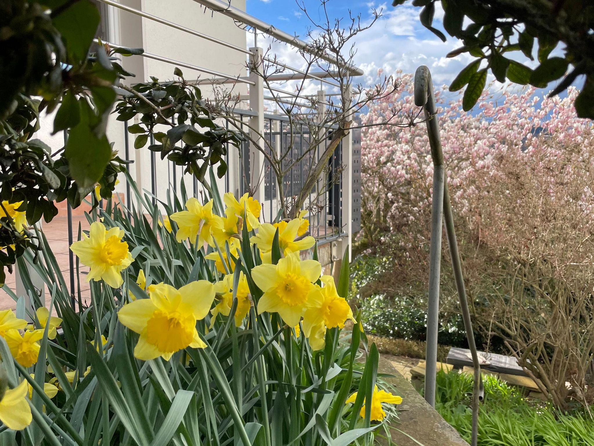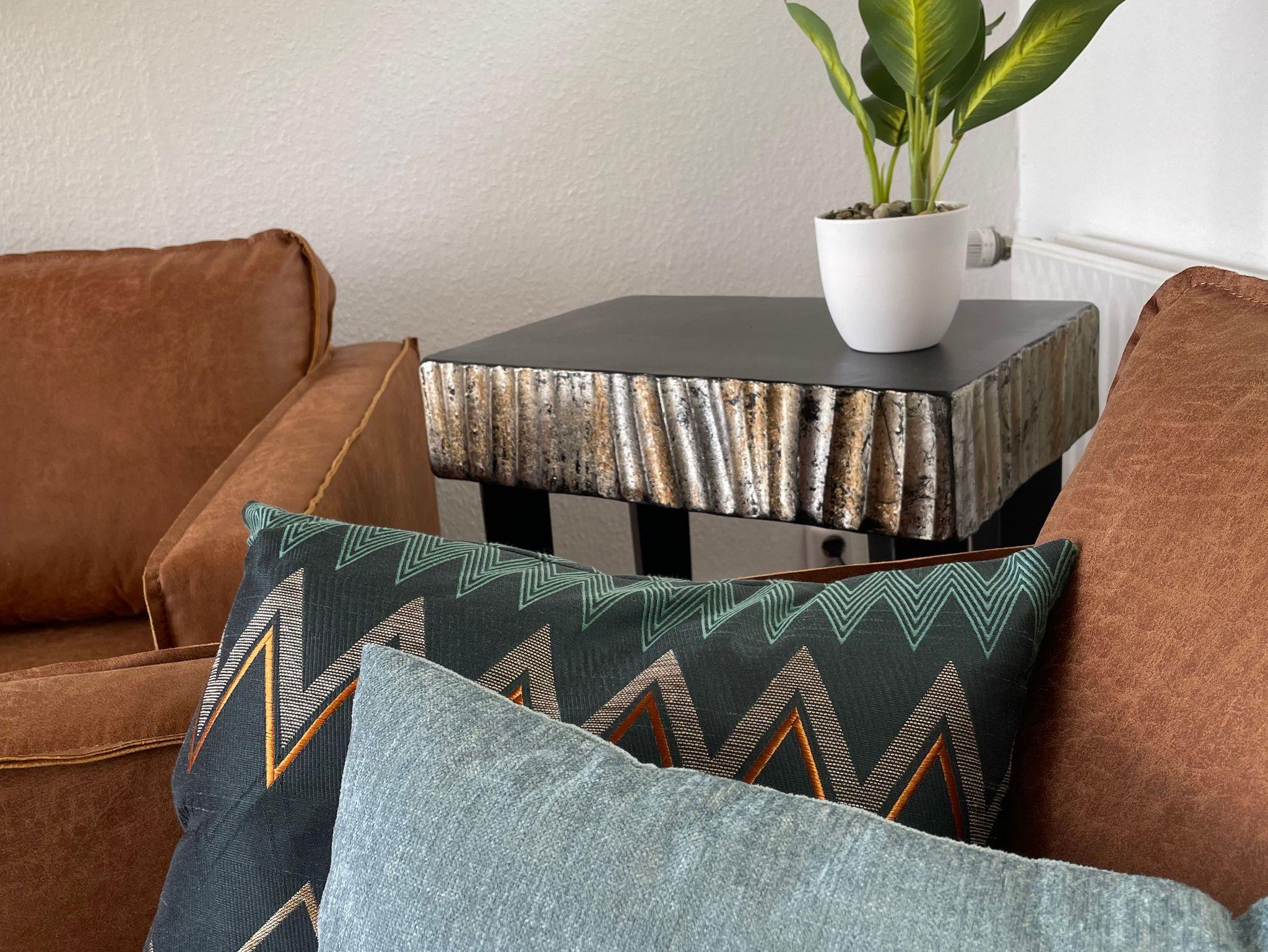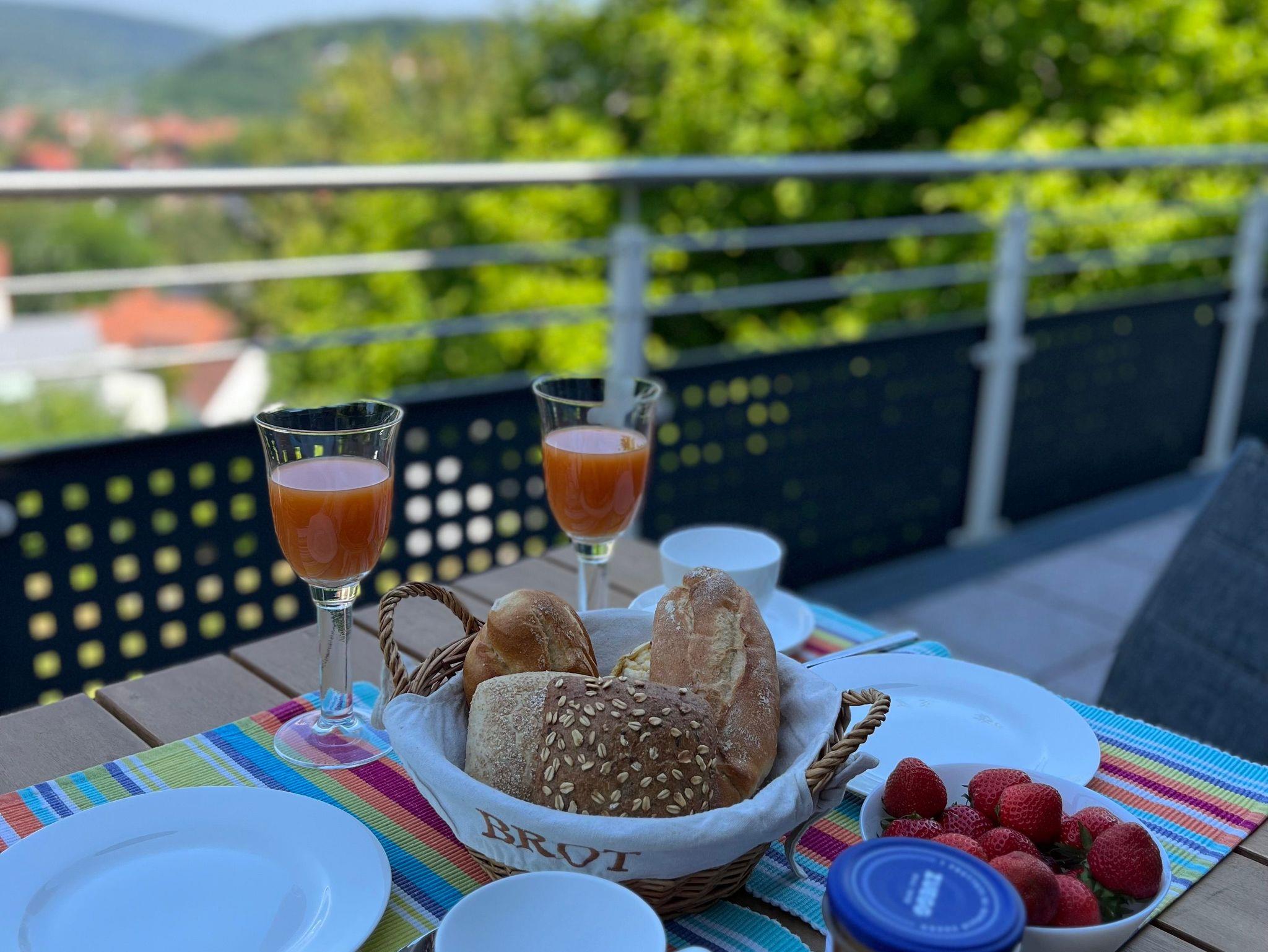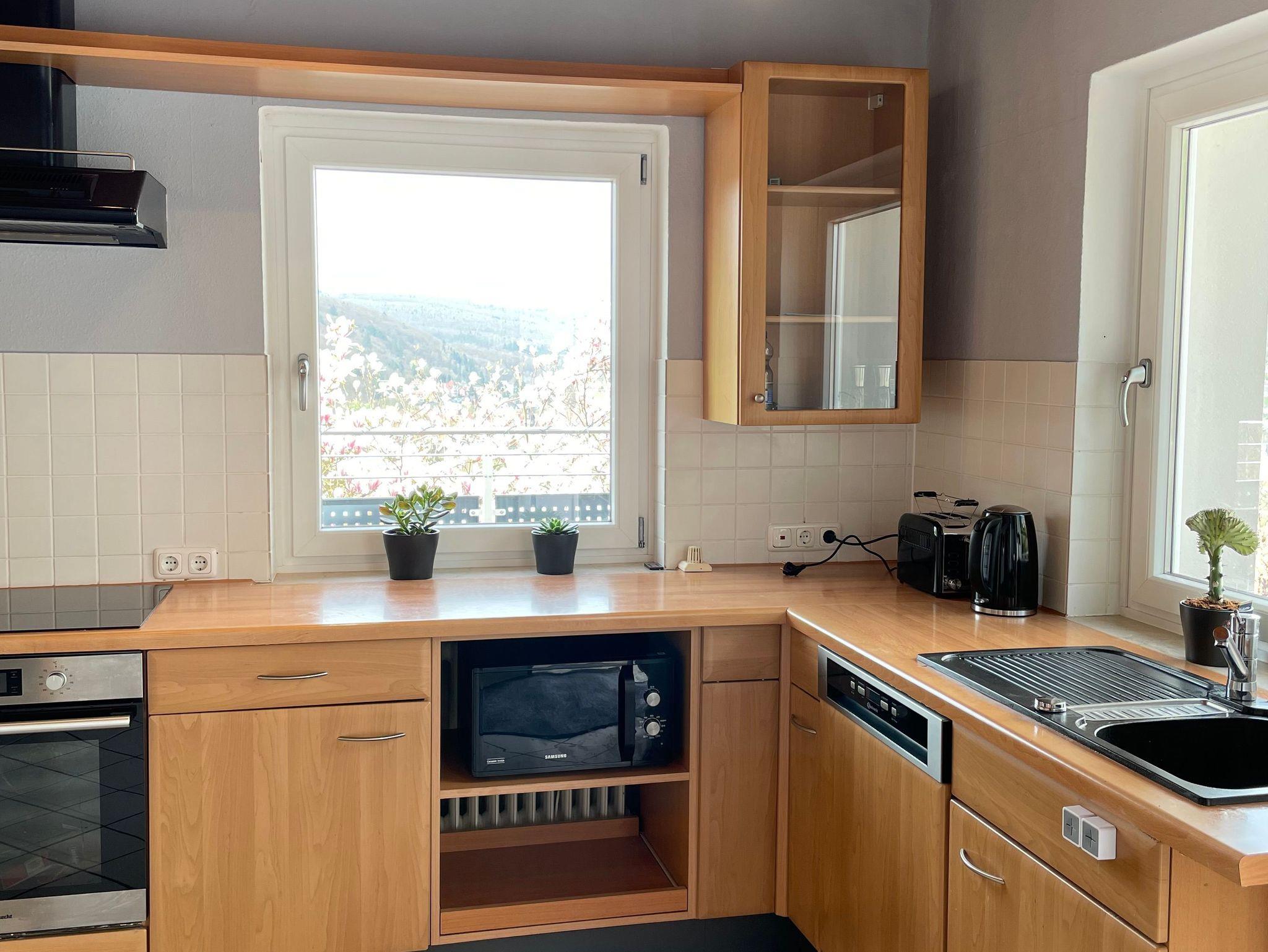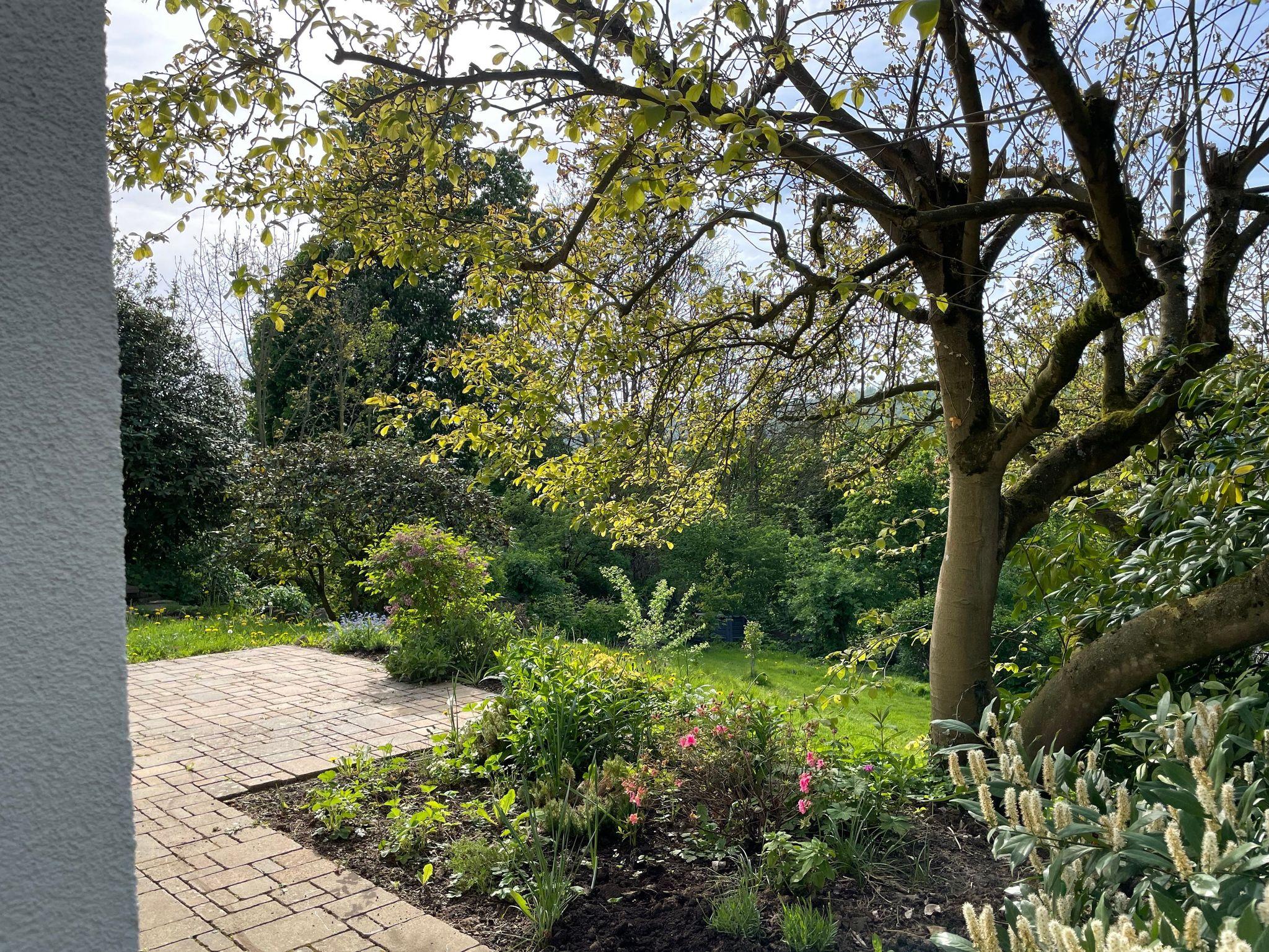 Vom Wohnzimmer aus erschließt sich der sehr große Balkon mit Loungemöbeln zur Sonnenseite und mit Blick auf Hann. Münden, den Reinhardswald und das Wesertal. Von den Schlafzimmern ist der Zugang direkt in den Garten möglich. Beide Etagen sind durch eine schmalere Wendeltreppe verbunden