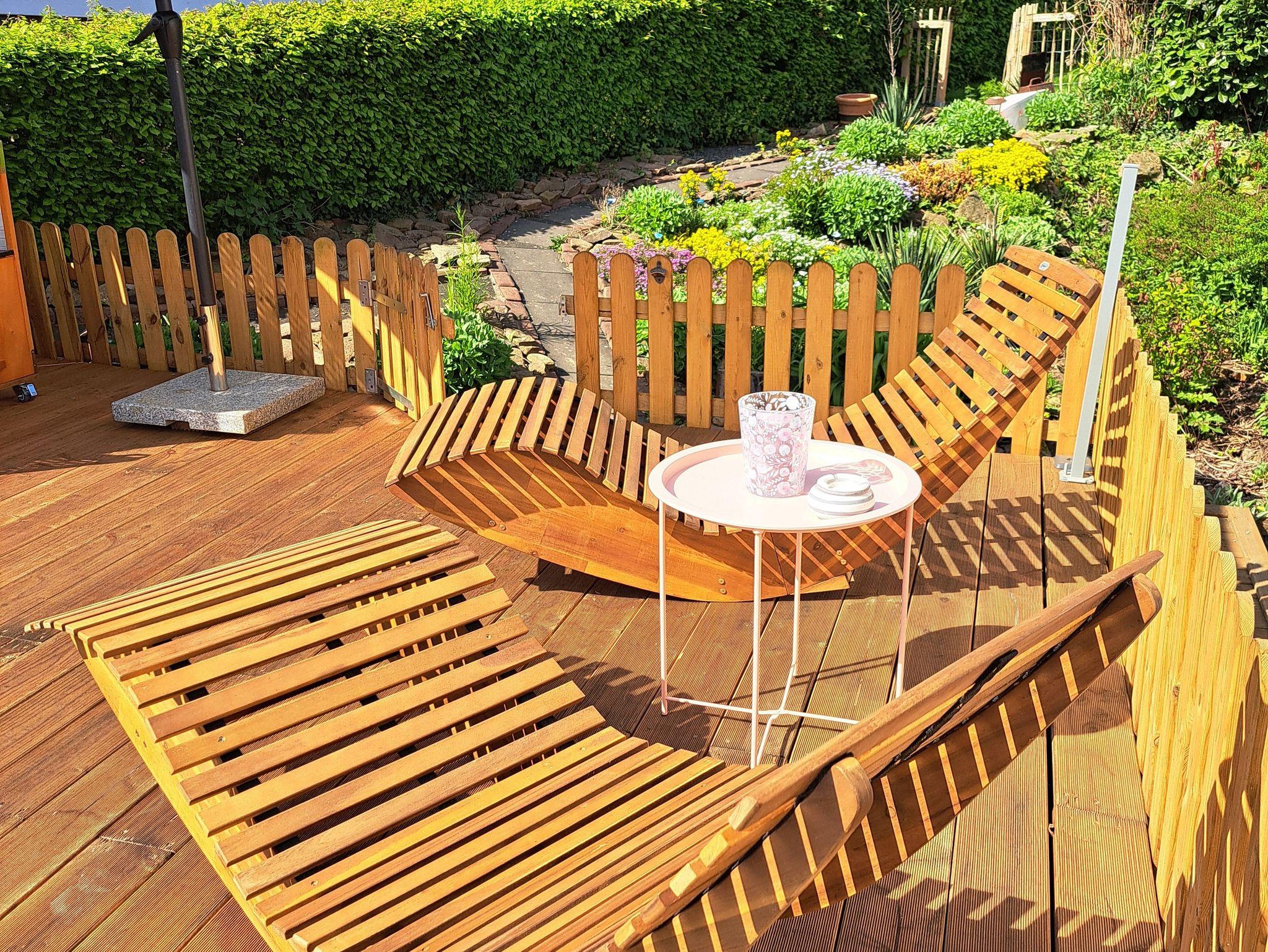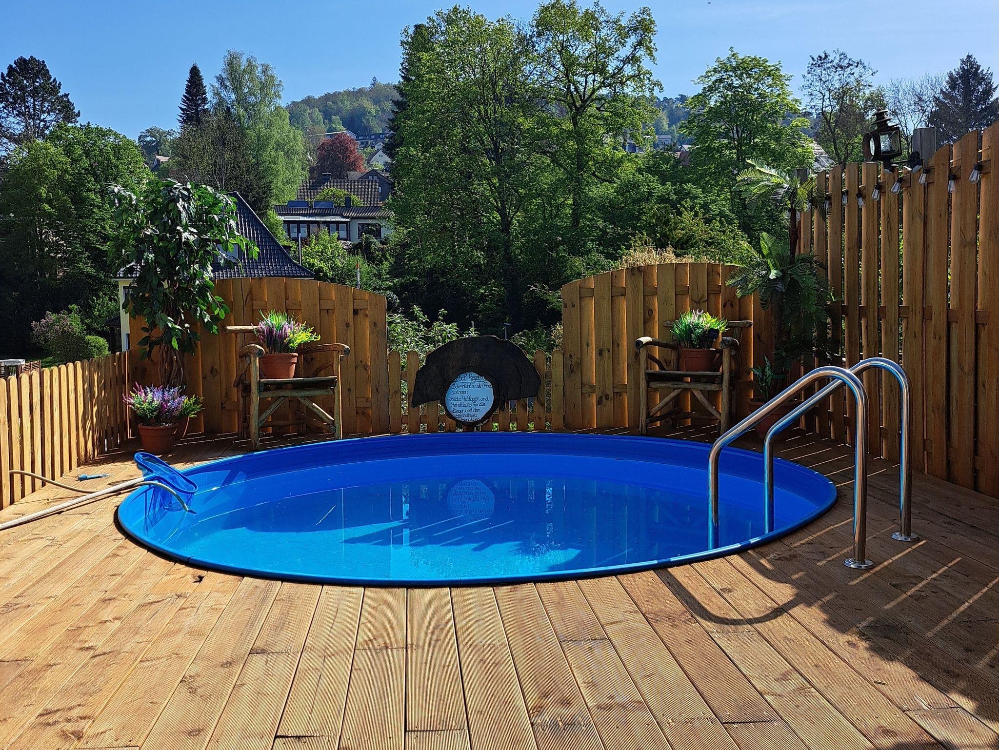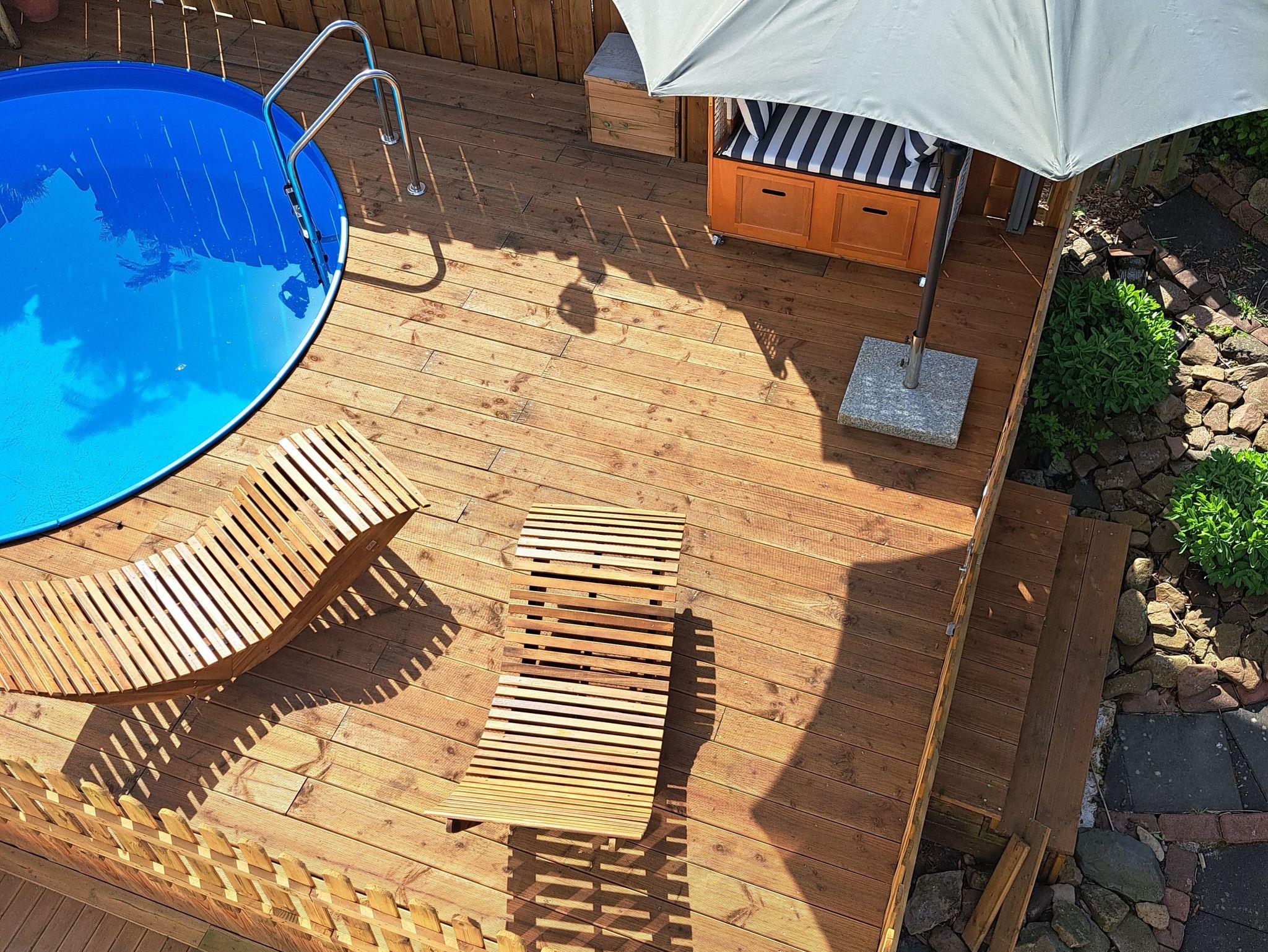 Neu renovierte 2-Zimmer-Ferienwohnung (56 m²), Küche, Bad und Balkon. Großzügiger Außenbereich mit einer Gartenhütte zum Darten, Grillhütte, Pool und Koiteich, Terrasse und Liegestühlen zum Verweilen, sowie einem Sandkasten und ein Trampolin.