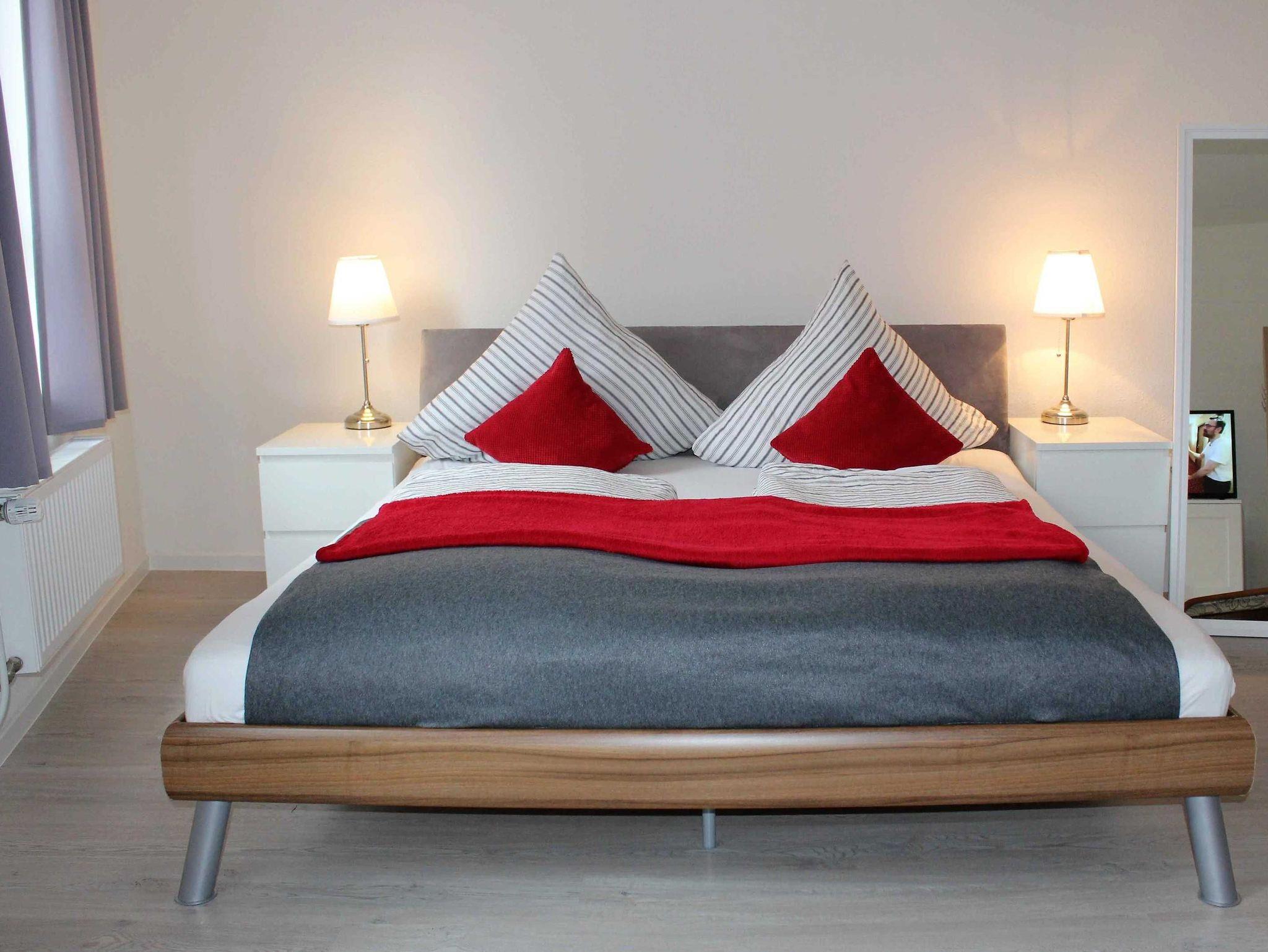 Das große Schlafzimmer ist ausgestattet mit 1 Doppelbett (180x200) und einem Boxspringbett (90x200cm