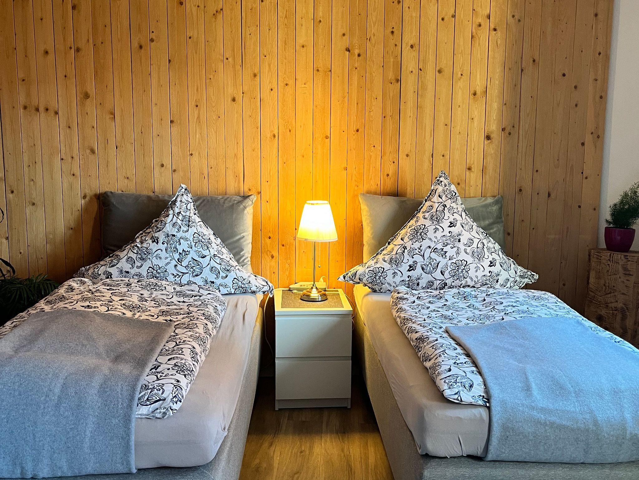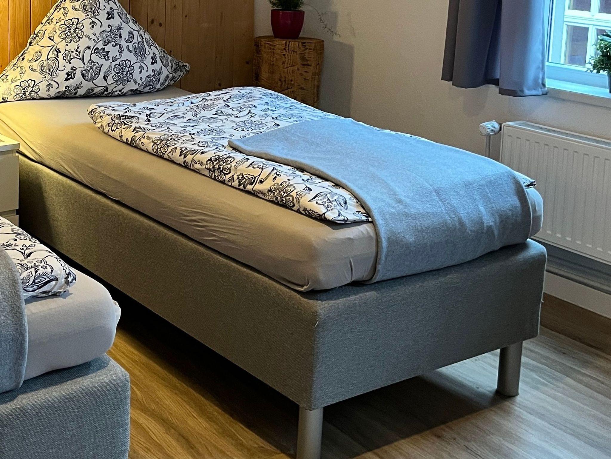 Das Schlafzimmer ist ausgestattet mit 2 Boxspringbetten, die für einen angenehmen Schlafkomfort sorgen.