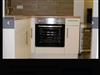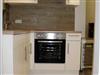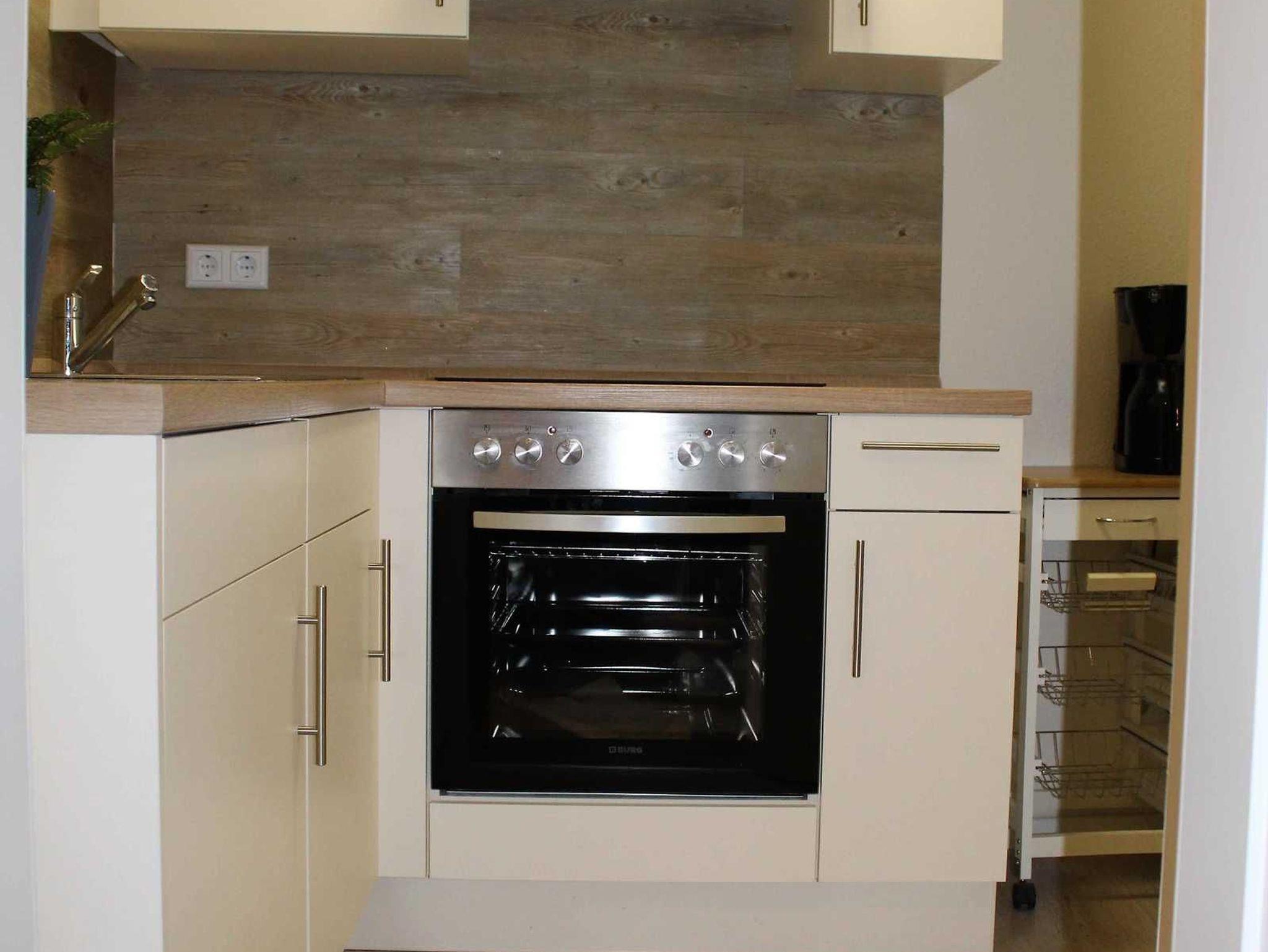 In der kleinen Küche befinden sich Herd, Backofen, Mikrowelle und Kühlschrank (mit Gefrierfach).