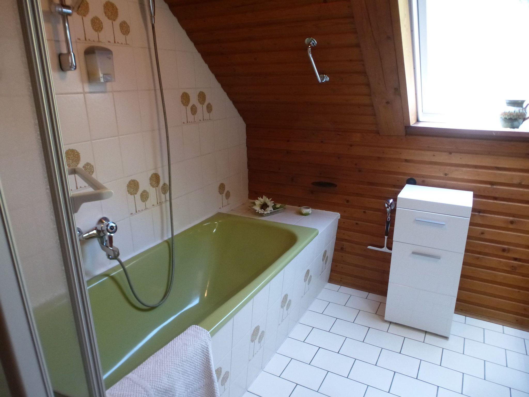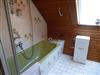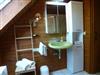 Auf der anderen Seite des Flures gelangen Sie ins Badezimmer mit Waschbecken, WC und Badewanne mit Dusche. Zum Duschen können Sie eine feste Abtrennung um die Wanne ziehen. Genügend Handtücher, Föhn, Vergrößerungsspiegel, Kosmetiktücher und Hand- und Duschseifen gehören zum Service. Ein Dachflächenfenster sorgt für frische Luft.