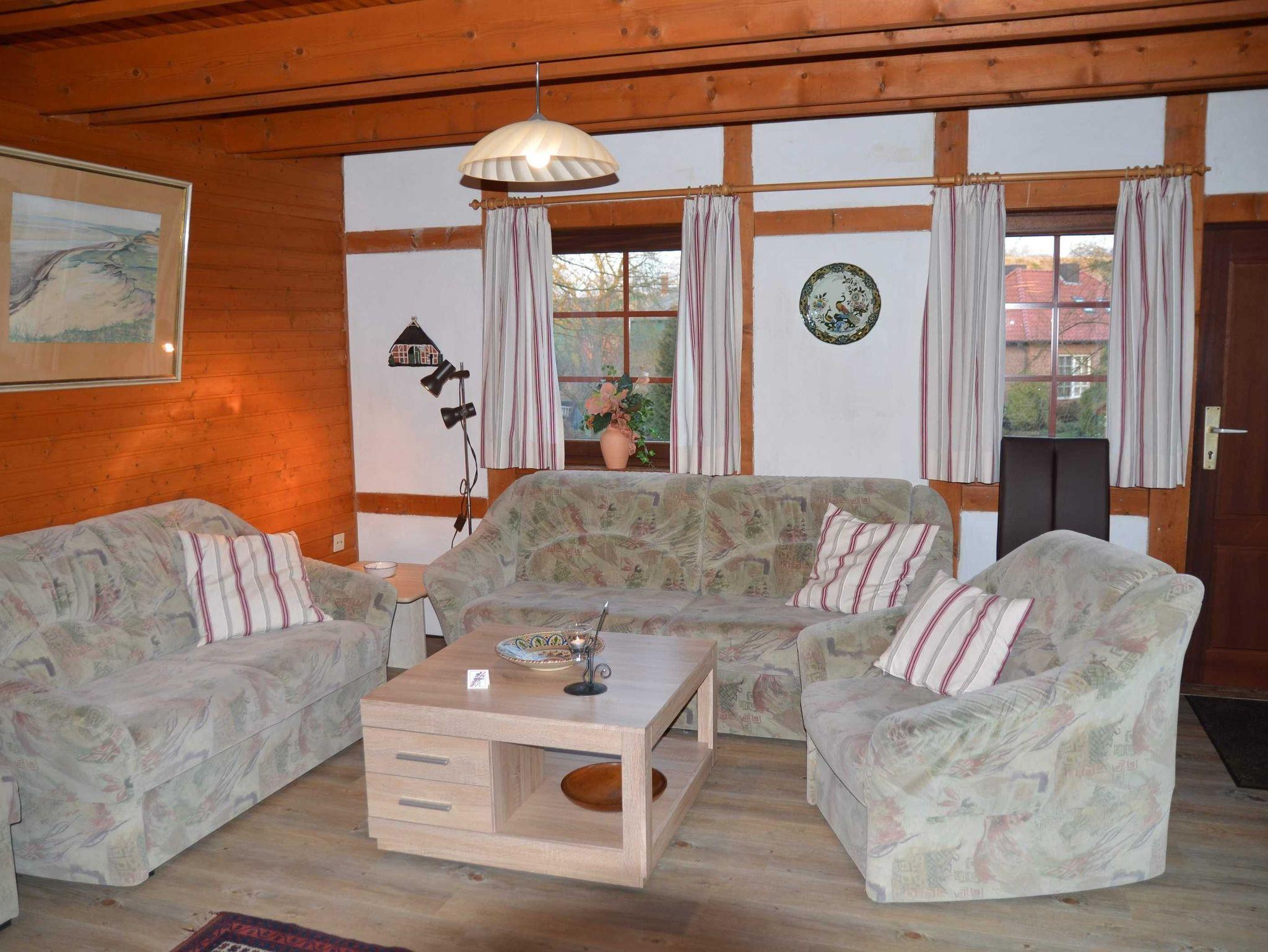 Unsere mit 3 Sternen von DTV zertifizierte Ferienwohnung mit 50 m² Wohnfläche liegt im Obergeschoß unseres Fachwerkhauses. Eine Außentreppe führt zum separaten Eingang. Die Whg. ist mit sichtbaren Deckenbalken, Fachwerk und hellen holzvertäfelten Innenwänden gebaut. Angenehme Wärme erwartet Sie durch Fußbodenheizung in allen Räumen. Der Fußboden besteht aus Vinyl-Beplankung.