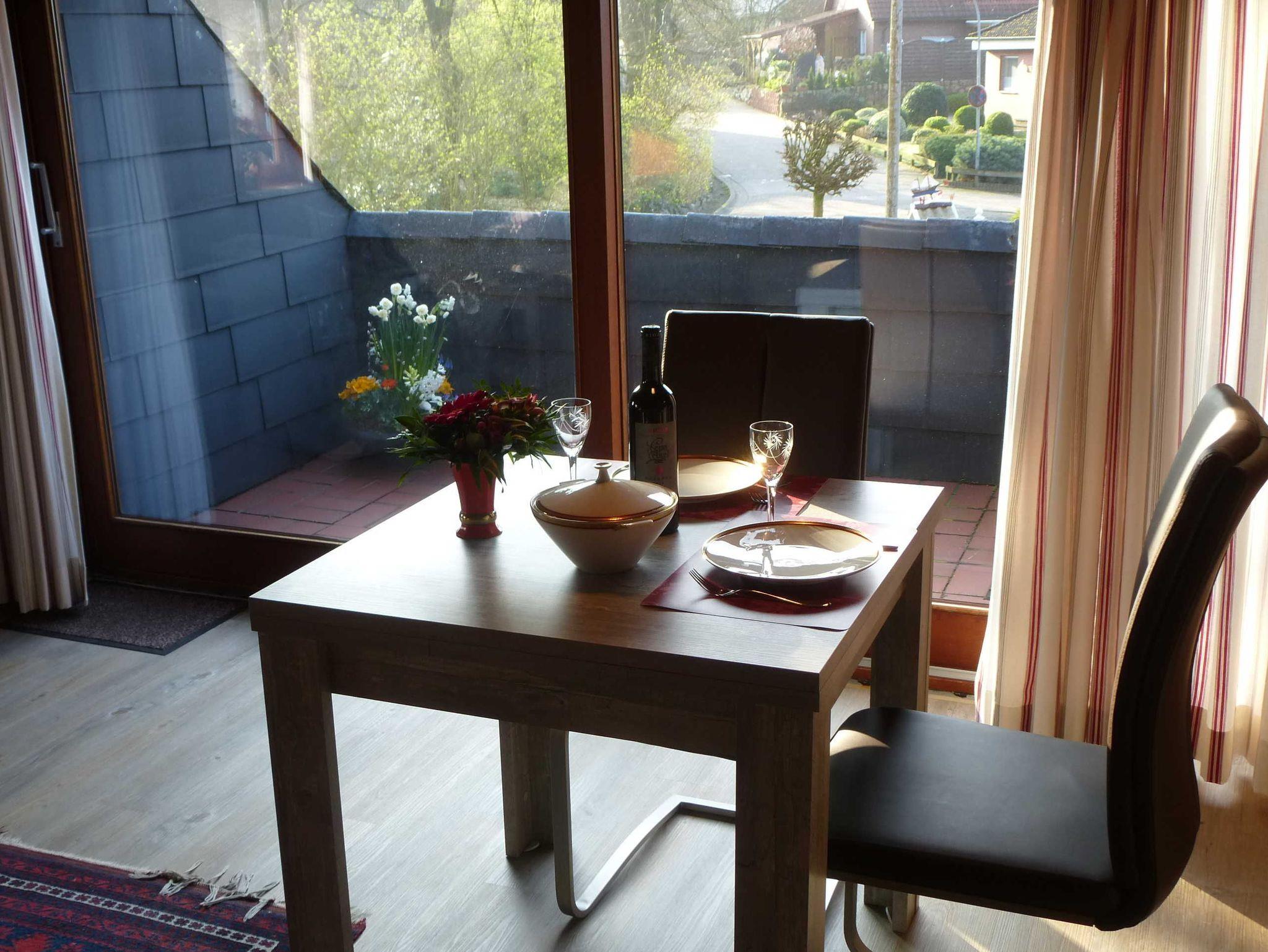 Neben der Küche befindet sich ein schöner Eßplatz vor dem Balkonfenster mit einem Ausziehtisch und Stühlen.