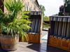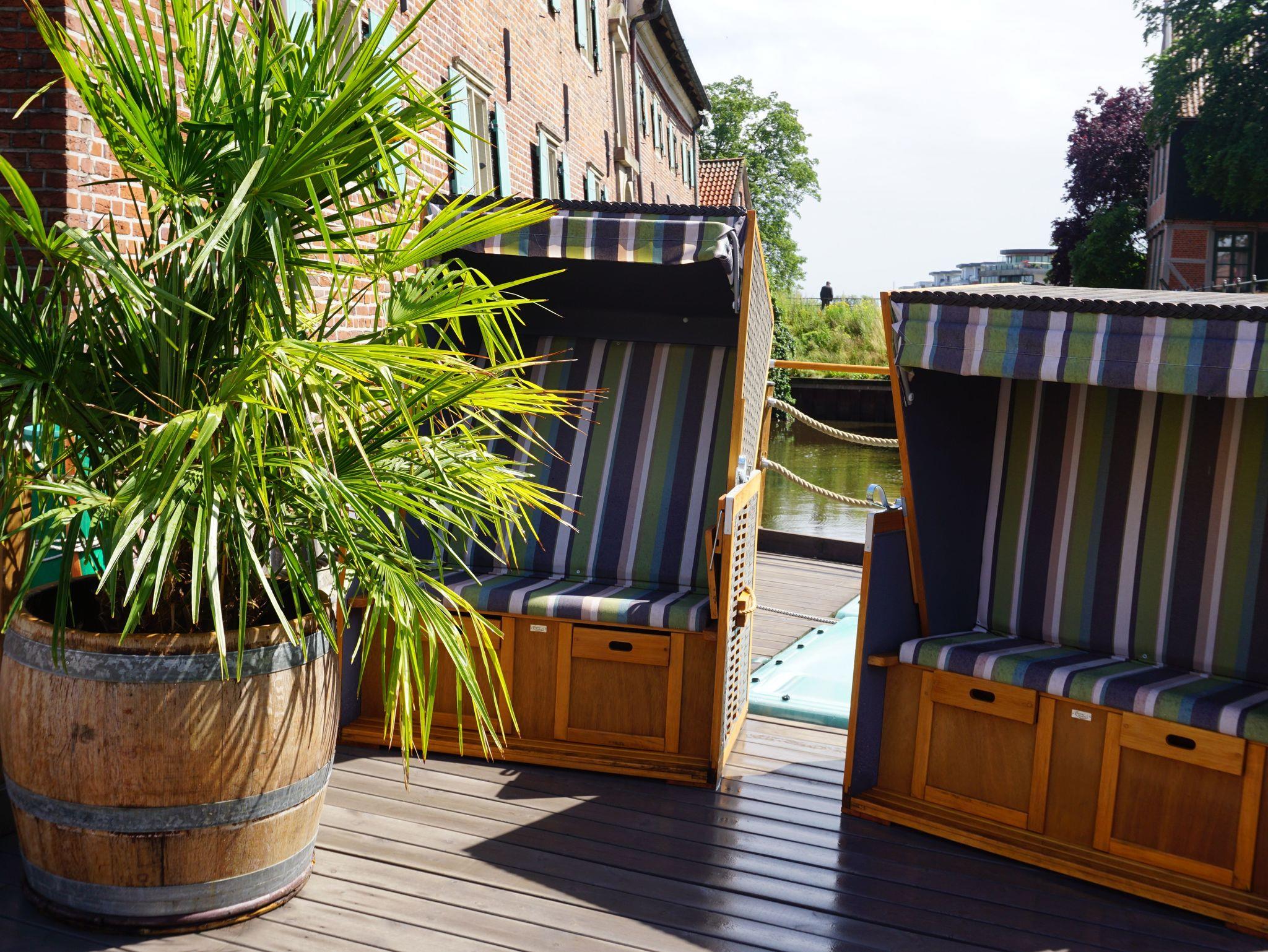Über einen Steg gelangt man auf das Hausboot. Zwei Holztreppen rechts und links von der Eingangsklappe führen auf die große Dachterrasse, die mit zwei Strandkörben sowie einer Reling ausgestattet ist und bei strahlendem Sonnenschein zum Verweilen einlädt.