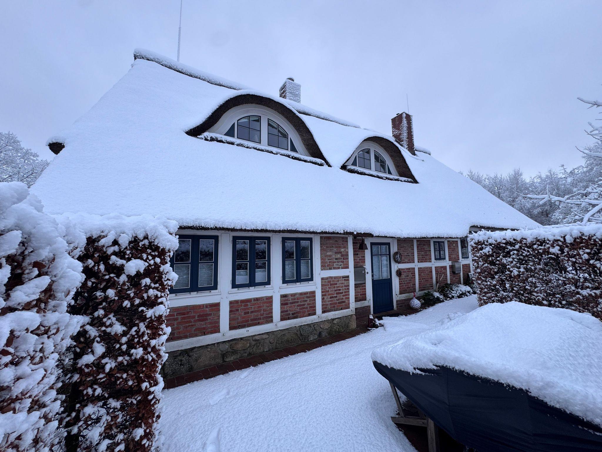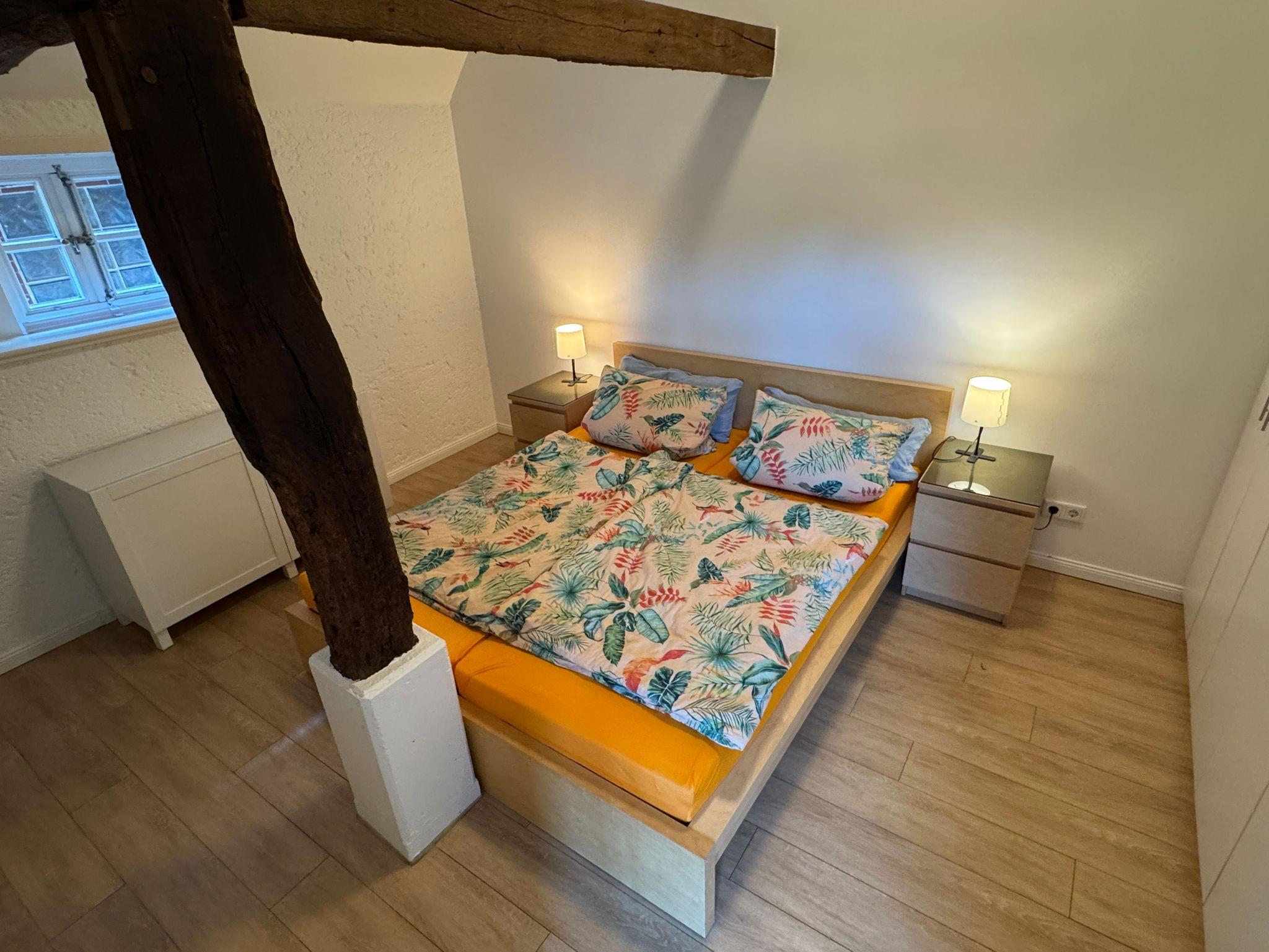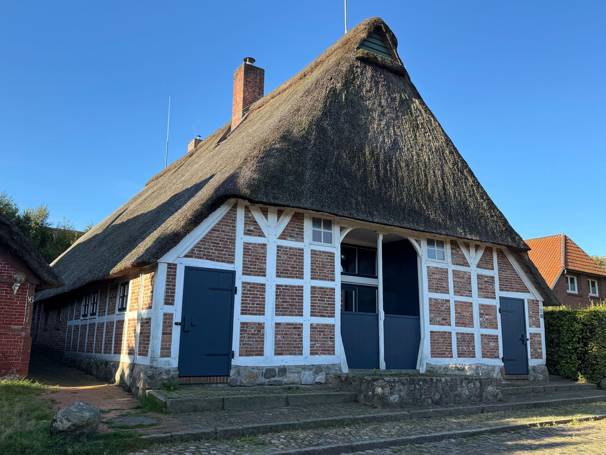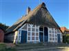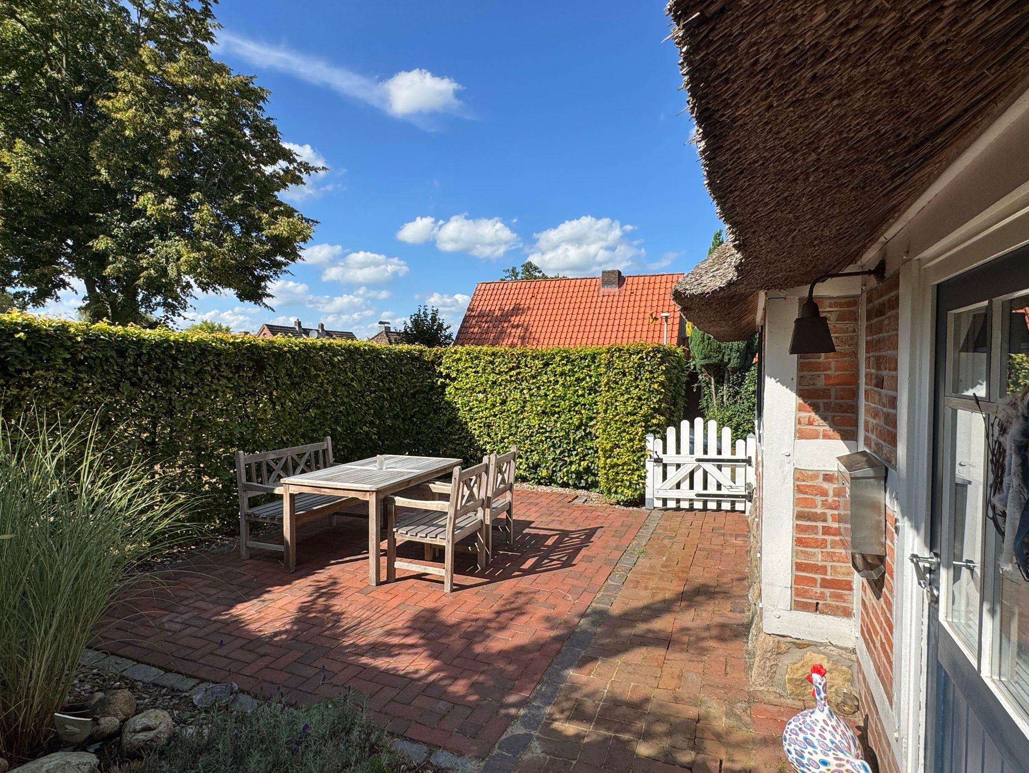 Ruhige Lage, Sonnenterrasse, Fußbodenheizung, Nichtraucherwohnung, Doppelbett, in denkmalgeschütztem Fachwerkhaus mit Reetdach, hohe Decken mit offener Balkenlage, große Fensterflächen