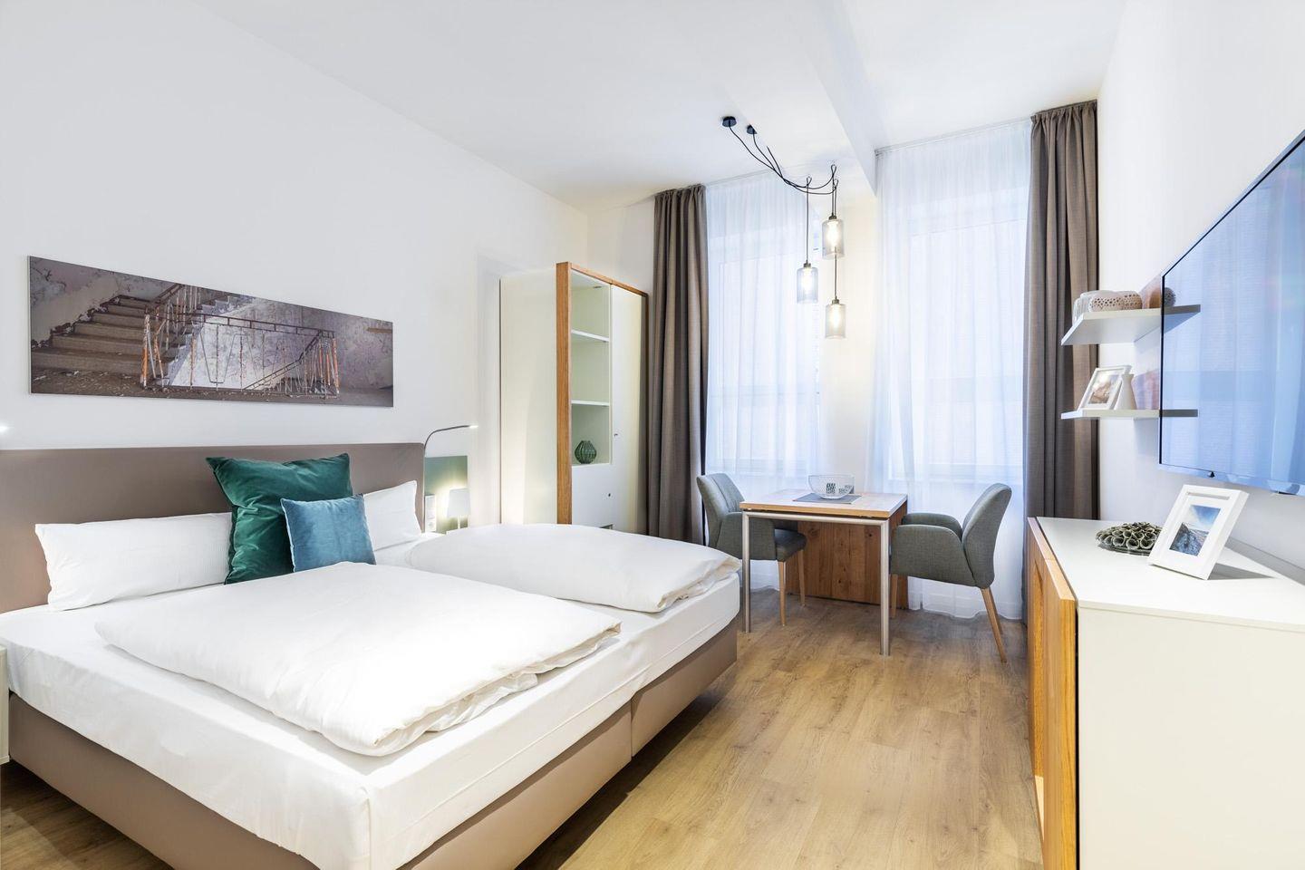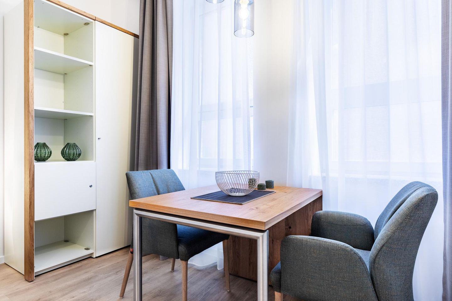 Das helle und moderne Nichtraucher-Apartment verfügt über Fußbodenheizung, kostenfreies WLAN und eine voll ausgestattete offene Küche mit Geschirrspüler, Kühlschrank, einen Herd mit 2 Glaskeramikkochfeldern und Backofen, Kaffeemaschine, Toaster, Wasserkocher und Mixstab. Im kombinierten Wohn-Schlafbereich befinden sich ein komfortables Boxspring-Doppelbett (1,80 x 2,00 m), ein Flatscreen-TV (40 Zoll) und eine Musikanlage. Das Apartment verfügt über einen Safe für Laptopgröße bis ca. 17 Zoll. Im modernen Badezimmer stehen euch eine ebenerdige Regendusche, ein Waschtisch, WC, ein Handtuchwärmer sowie ein Föhn zur Verfügung.