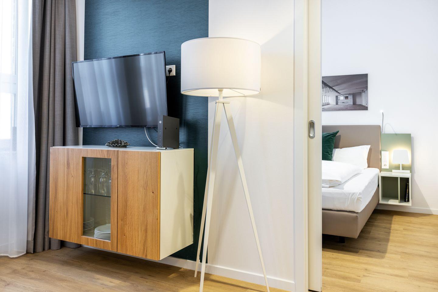 Das helle und moderne Nichtraucher-Apartment verfügt über Fußbodenheizung, kostenfreies WLAN und eine voll ausgestattete offene Küche mit Geschirrspüler, Kühlschrank, einen Herd mit 2 Glaskeramikkochfeldern und Backofen, Kaffeemaschine, Toaster, Wasserkocher und Mixstab. Im separaten Schlafzimmer befindet sich ein komfortables Boxspring-Doppelbett (1,80 x 2,00 m) und ein Flatscreen-TV (40 Zoll). Im kombinierten Wohn-Essbereich stehen euch ein Flatscreen-TV (40 Zoll) und eine Musikanlage sowie eine Einzelschlafcouch (1,20 x 1,95 m) zur Verfügung. Das Apartment verfügt über einen Safe für Laptopgröße bis ca. 17 Zoll. Im modernen Badezimmer befinden sich eine ebenerdige Regendusche, ein Waschtisch, WC, ein Handtuchwärmer sowie ein Föhn.
