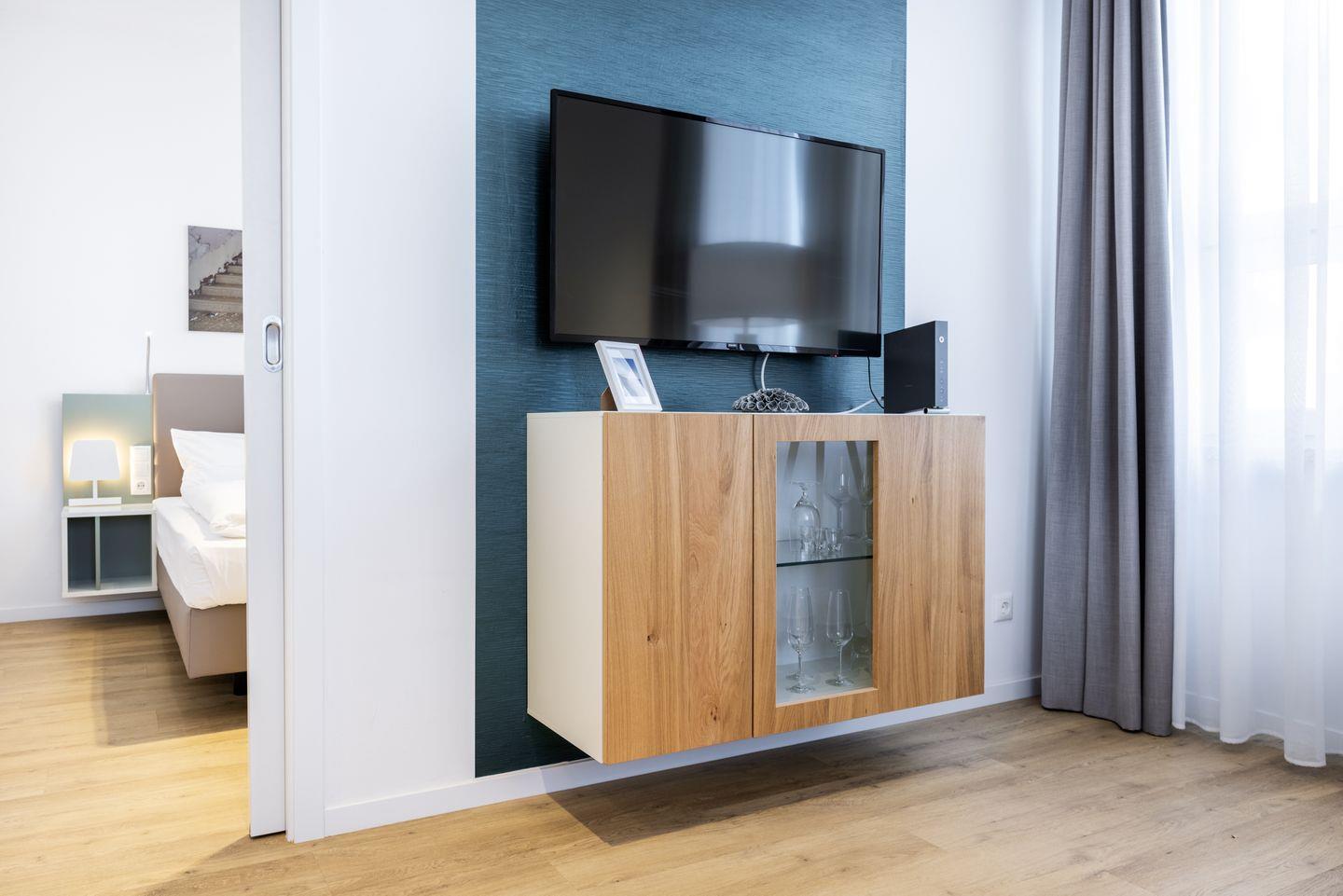 Das helle und moderne Nichtraucher-Apartment verfügt über Fußbodenheizung, kostenfreies WLAN und eine voll ausgestattete offene Küche mit Geschirrspüler, Kühlschrank, einen Herd mit 2 Glaskeramikkochfeldern und Backofen, Kaffeemaschine, Toaster, Wasserkocher und Mixstab. Im separaten Schlafzimmer befindet sich ein komfortables Boxspring-Doppelbett (1,80 x 2,00 m) sowie ein Flatscreen-TV (40 Zoll). Im kombinierten Wohn-Essbereich stehen euch ein Flatscreen-TV (40 Zoll) und eine Musikanlage sowie eine Einzelschlafcouch (1,20 x 1,95 m) zur Verfügung. Das Apartment verfügt über einen Safe für Laptopgröße bis ca. 17 Zoll. Im modernen Badezimmer befinden sich eine ebenerdige Regendusche, ein Waschtisch, WC, ein Handtuchwärmer sowie ein Föhn.