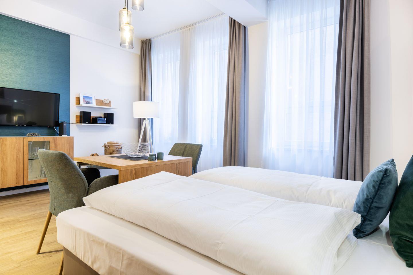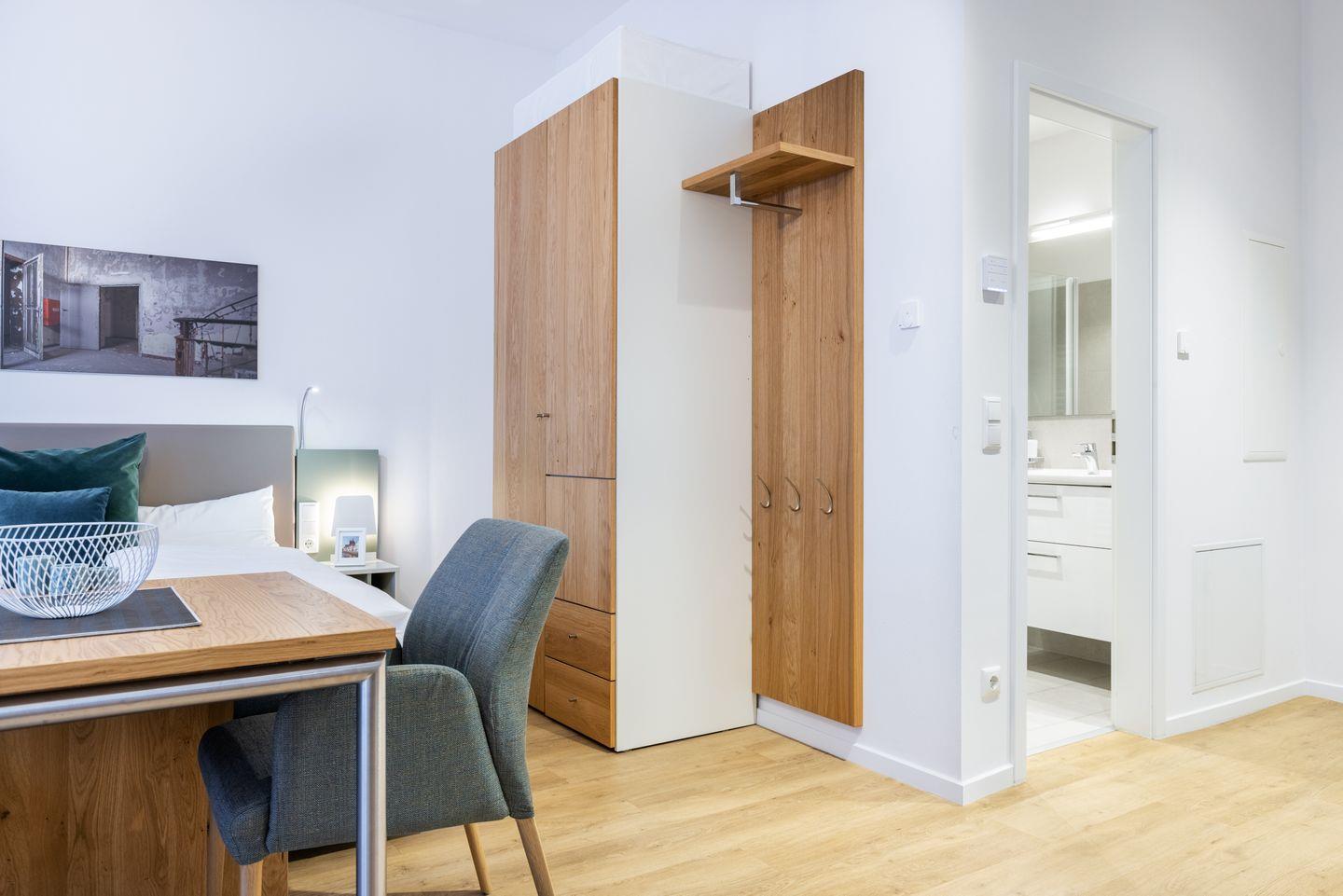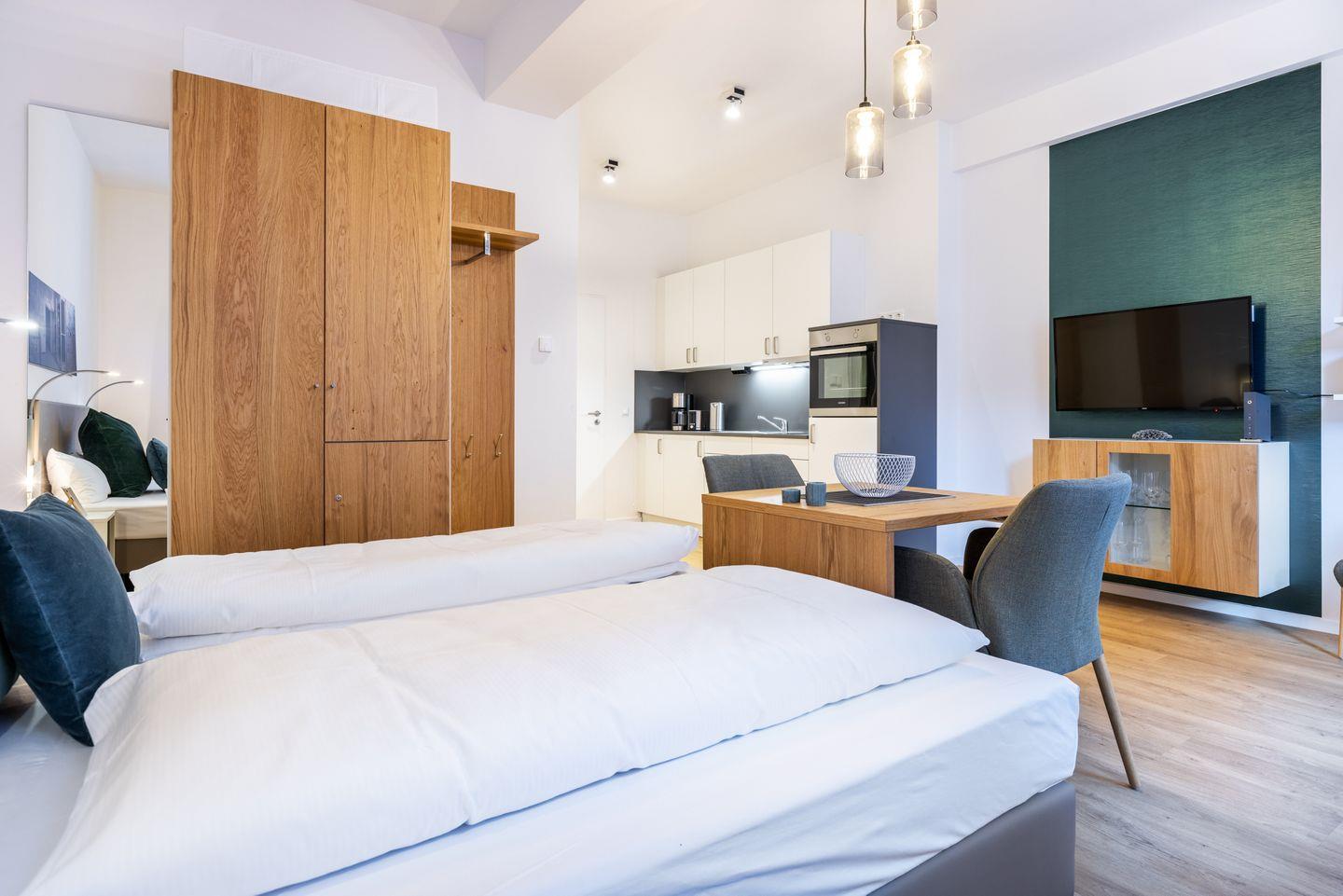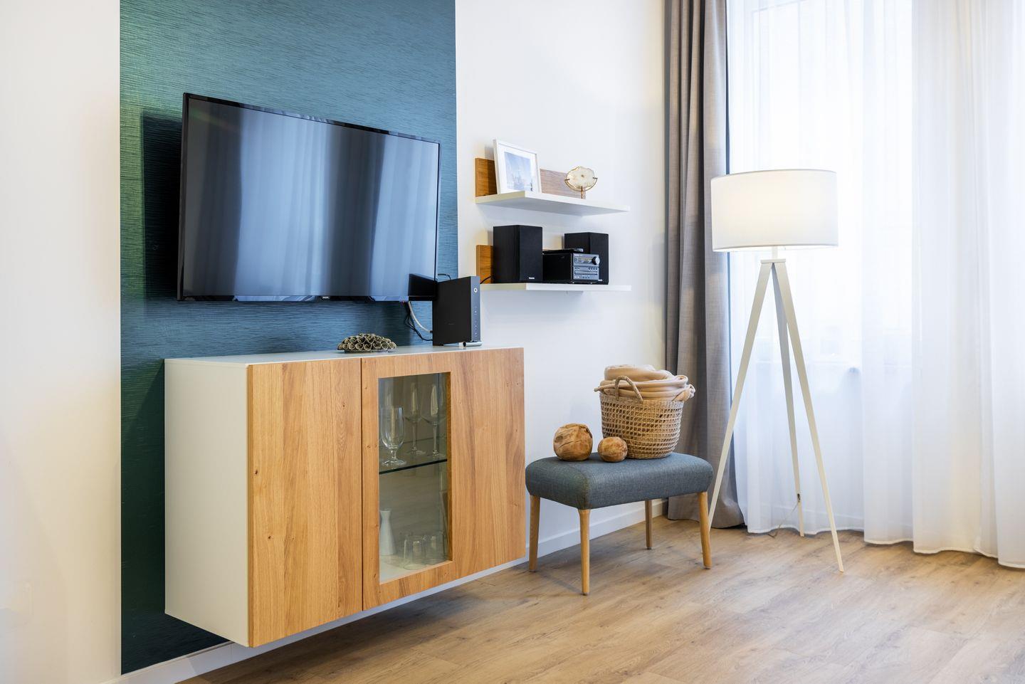 Das helle und moderne Nichtraucher-Apartment verfügt über Fußbodenheizung, kostenfreies WLAN und eine voll ausgestattete offene Küche mit Geschirrspüler, Kühlschrank, einen Herd mit 2 Glaskeramikkochfeldern und Backofen, Kaffeemaschine, Toaster, Wasserkocher und Mixstab. Im kombinierten Wohn-Schlafbereich befinden sich ein komfortables Boxspring-Doppelbett (1,80 x 2,00 m), ein Flatscreen-TV (40 Zoll) und eine Musikanlage. Das Apartment verfügt über einen Safe für Laptopgröße bis ca. 17 Zoll. Im modernen Badezimmer stehen euch eine ebenerdige Regendusche, ein Waschtisch, WC, ein Handtuchwärmer sowie ein Föhn zur Verfügung.