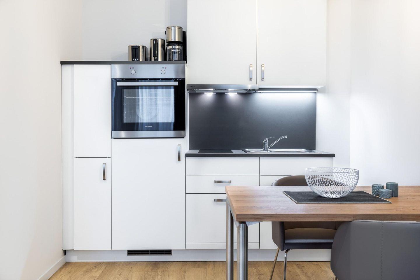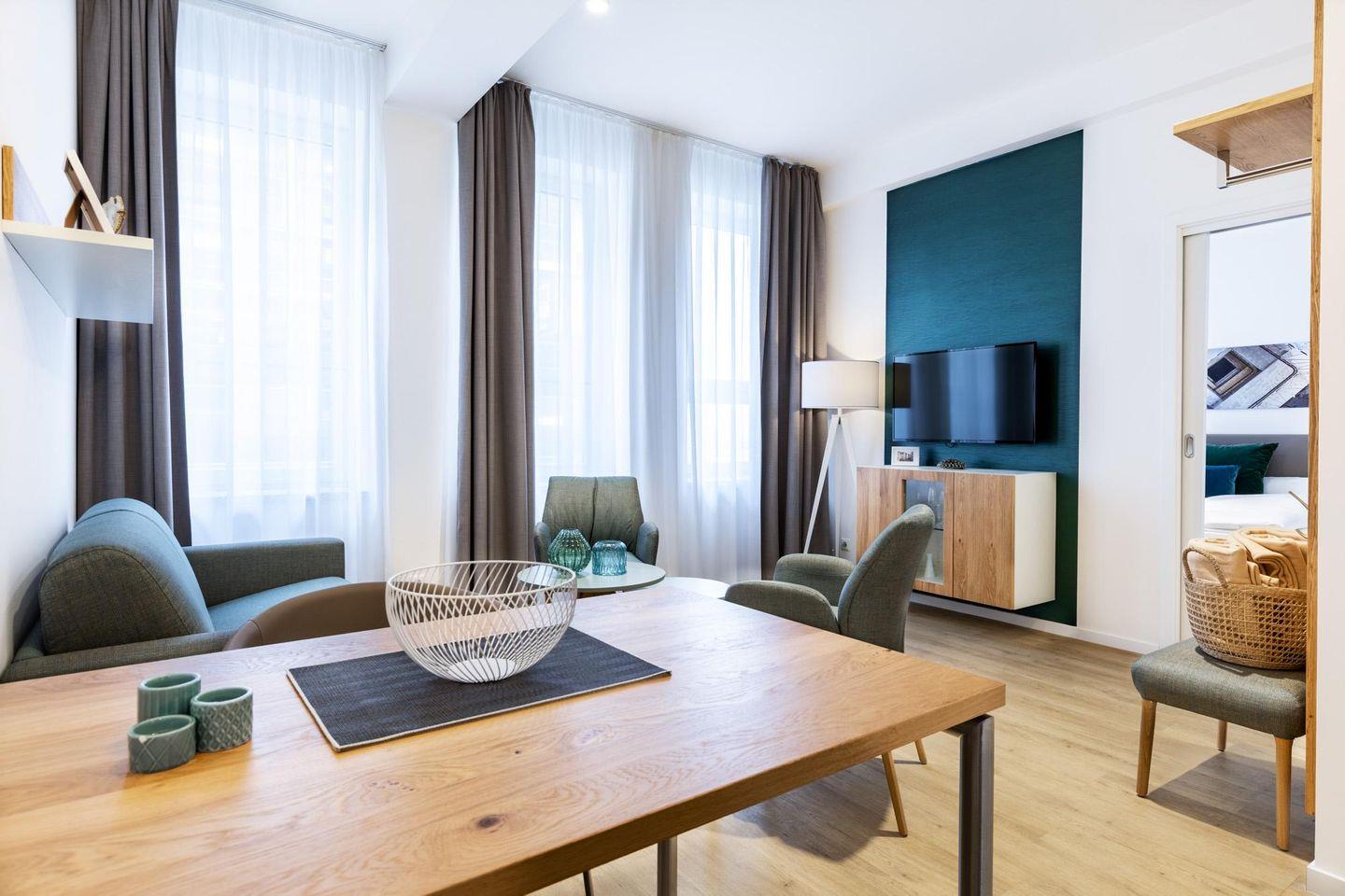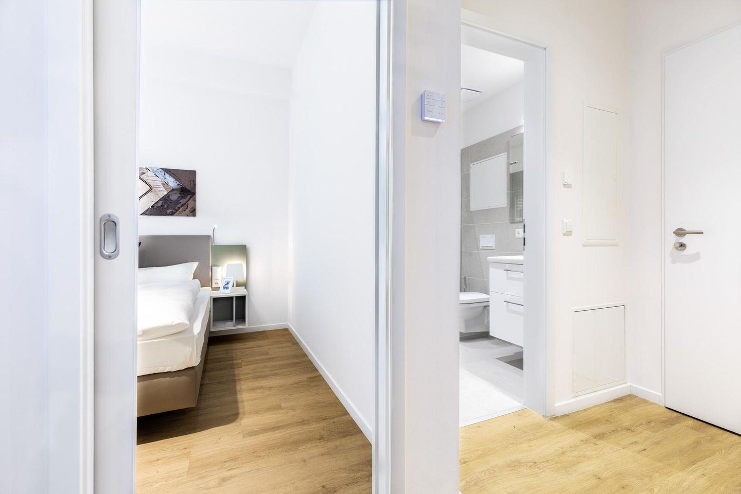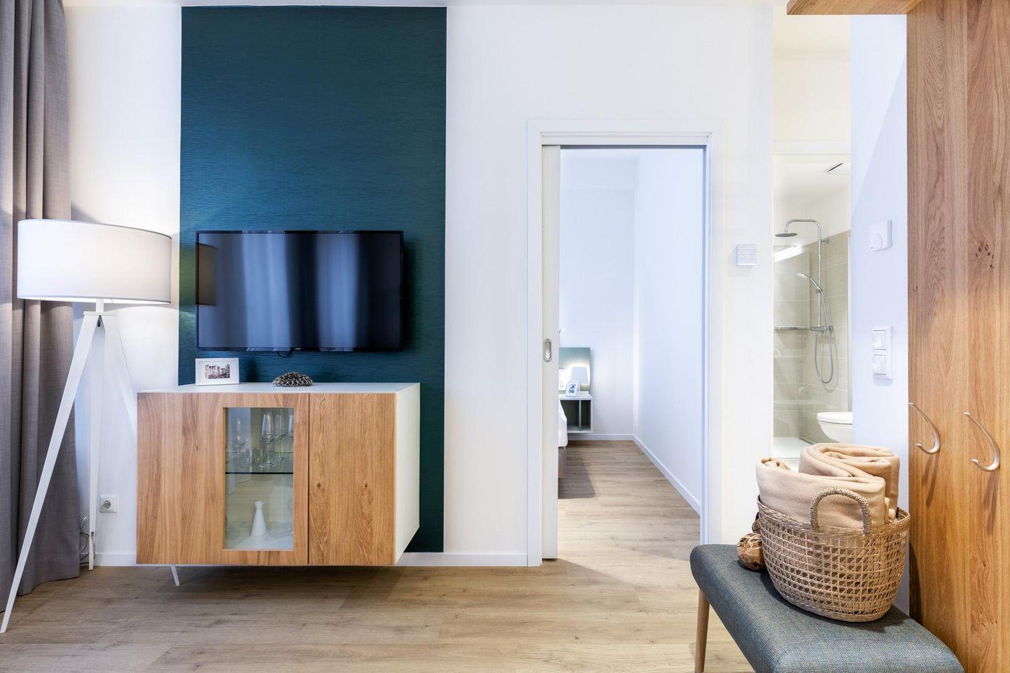 Das helle und moderne Nichtraucher-Apartment verfügt über Fußbodenheizung, kostenfreies WLAN und eine voll ausgestattete offene Küche mit Geschirrspüler, Kühlschrank, einen Herd mit 2 Glaskeramikkochfeldern und Backofen, Kaffeemaschine, Toaster, Wasserkocher und Mixstab. Im separaten Schlafzimmer befindet sich ein komfortables Boxspring-Doppelbett (1,80 x 2,00 m) und ein Flatscreen-TV (40 Zoll). Im kombinierten Wohn-Essbereich stehen euch ein Flatscreen-TV (40 Zoll) und eine Musikanlage sowie eine Einzelschlafcouch (1,20 x 1,95 m) zur Verfügung. Das Apartment verfügt über einen Safe für Laptopgröße bis ca. 17 Zoll. Im modernen Badezimmer befinden sich eine ebenerdige Regendusche, ein Waschtisch, WC, ein Handtuchwärmer sowie ein Föhn.