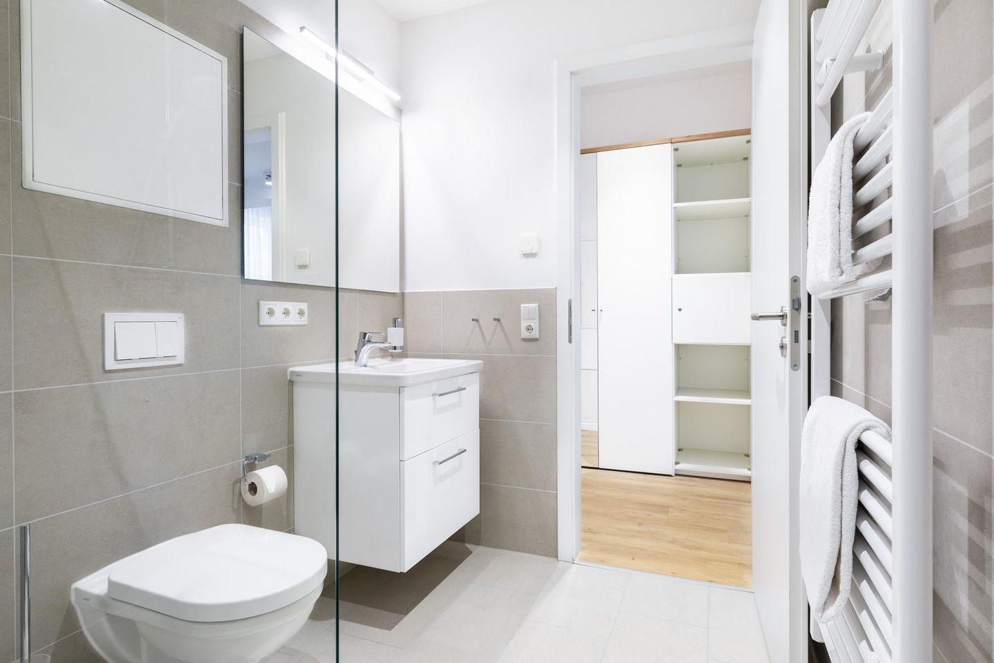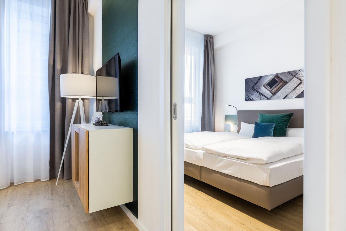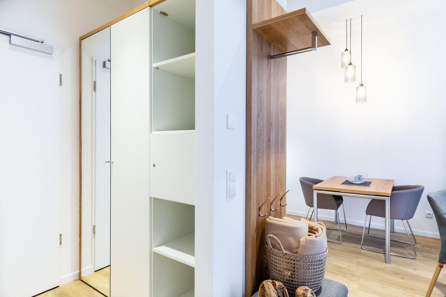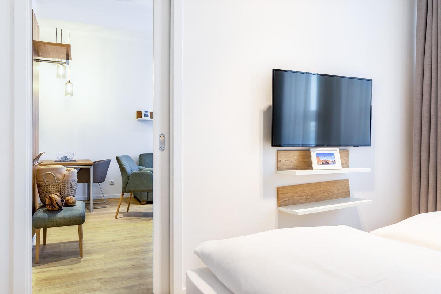 Das helle und moderne Nichtraucher-Apartment verfügt über Fußbodenheizung, kostenfreies WLAN und eine voll ausgestattete offene Küche mit Geschirrspüler, Kühlschrank, einen Herd mit 2 Glaskeramikkochfeldern und Backofen, Kaffeemaschine, Toaster, Wasserkocher und Mixstab. Im separaten Schlafzimmer befindet sich ein komfortables Boxspring-Doppelbett (1,80 x 2,00 m) und ein Flatscreen-TV (40 Zoll). Im kombinierten Wohn-Essbereich stehen euch ein Flatscreen-TV (40 Zoll) und eine Musikanlage sowie eine Einzelschlafcouch (1,20 x 1,95 m) zur Verfügung. Das Apartment verfügt über einen Safe für Laptopgröße bis ca. 17 Zoll. Im modernen Badezimmer befinden sich eine ebenerdige Regendusche, ein Waschtisch, WC, ein Handtuchwärmer sowie ein Föhn.
