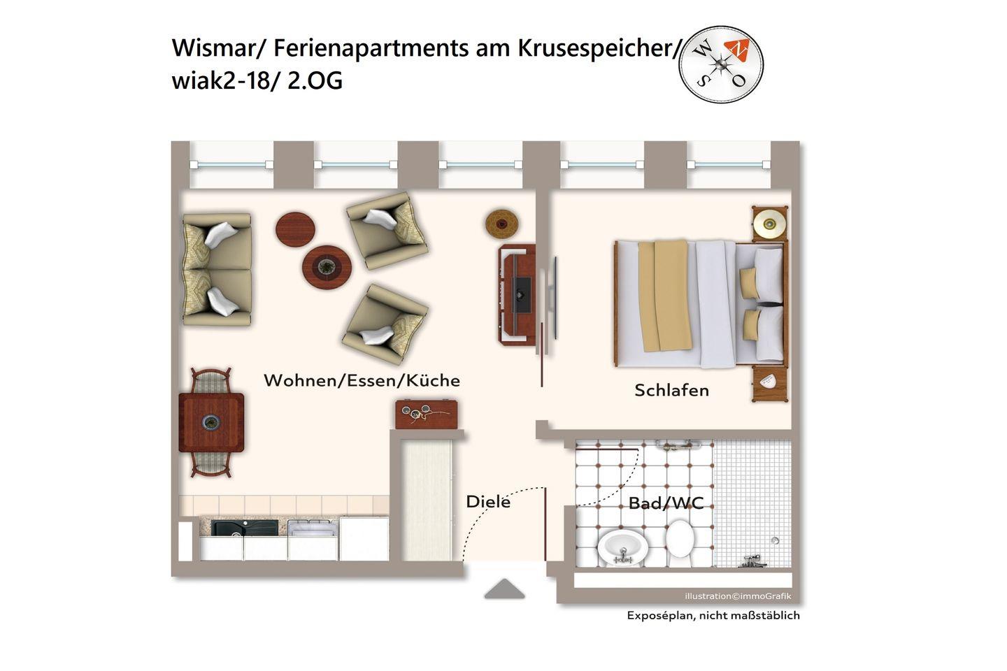 Das 36 m² große 2-Zimmer Apartment, wiak2-18, befindet sich in den Upstalsboom Ferienapartments am Krusespeicher und ist für bis zu 3 Personen geeignet. Das modern konzipierte Apartment verfügt über kostenfreies WLAN und Fußbodenheizung.