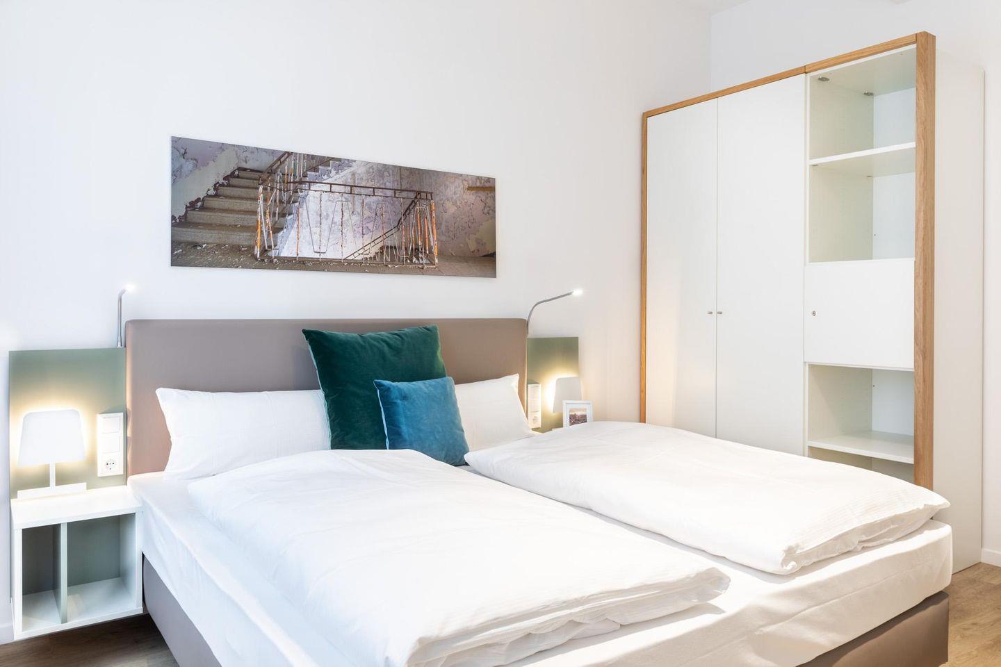 Das helle und moderne Nichtraucher-Apartment verfügt über Fußbodenheizung, kostenfreies WLAN und eine voll ausgestattete offene Küche mit Geschirrspüler, Kühlschrank, einen Herd mit 2 Glaskeramikkochfeldern und Backofen, Kaffeemaschine, Toaster, Wasserkocher und Mixstab. Im separaten Schlafzimmer befindet sich ein komfortables Boxspring-Doppelbett (1,80 x 2,00 m) und ein Flatscreen-TV (40 Zoll). Im kombinierten Wohn-Essbereich stehen euch ein Flatscreen-TV (40 Zoll) und eine Musikanlage sowie eine Einzelschlafcouch (1,20 x 1,95 m) zur Verfügung. Das Apartment verfügt über einen Safe für Laptopgröße bis ca. 17 Zoll. Im modernen Badezimmer befinden sich eine ebenerdige Regendusche, ein Waschtisch, WC, ein Handtuchwärmer sowie ein Föhn.