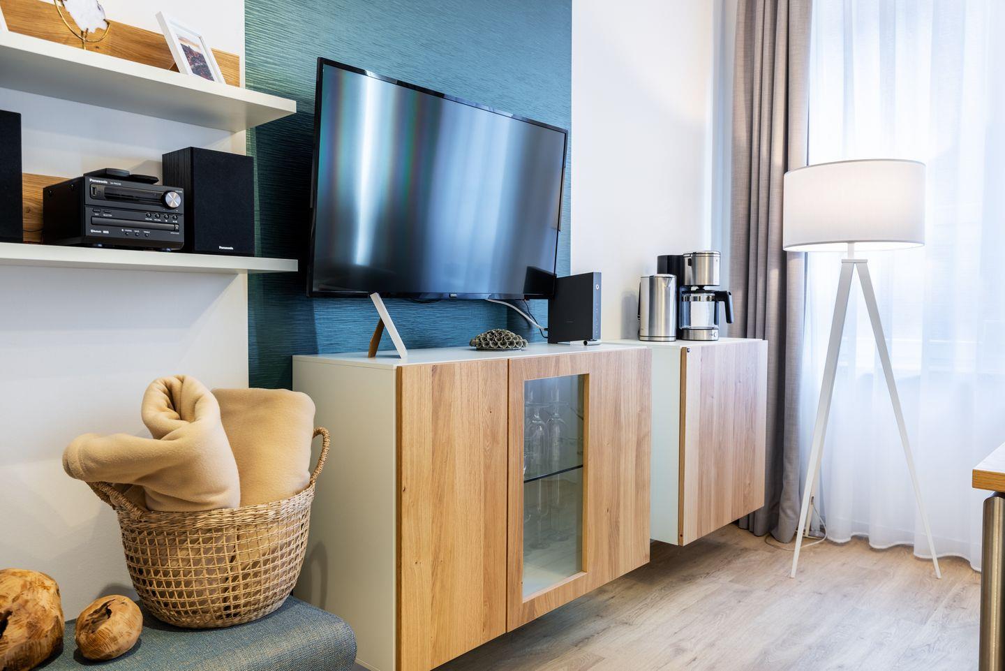 Das helle und moderne Nichtraucher-Apartment verfügt über Fußbodenheizung, kostenfreies WLAN und eine voll ausgestattete offene Küche mit Geschirrspüler, Kühlschrank, einen Herd mit 2 Glaskeramikkochfeldern und Backofen, Kaffeemaschine, Toaster, Wasserkocher und Mixstab. Im kombinierten Wohn-Schlafbereich befinden sich ein komfortables Boxspring-Doppelbett (1,80 x 2,00 m), ein Flatscreen-TV (40 Zoll) und eine Musikanlage. Das Apartment verfügt über einen Safe für Laptopgröße bis ca. 17 Zoll. Im modernen Badezimmer stehen euch eine ebenerdige Regendusche, ein Waschtisch, WC, ein Handtuchwärmer sowie ein Föhn zur Verfügung.