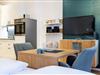Das helle und moderne Nichtraucher-Apartment verfügt über Fußbodenheizung, kostenfreies WLAN und eine voll ausgestattete offene Küche mit Geschirrspüler, Kühlschrank, einen Herd mit 2 Glaskeramikkochfeldern und Backofen, Kaffeemaschine, Toaster, Wasserkocher und Mixstab. Im kombinierten Wohn-Schlafbereich befinden sich ein komfortables Boxspring-Doppelbett (1,80 x 2,00 m), ein Flatscreen-TV (40 Zoll) und eine Musikanlage. Das Apartment verfügt über einen Safe für Laptopgröße bis ca. 17 Zoll. Im modernen Badezimmer stehen euch eine ebenerdige Regendusche, ein Waschtisch, WC, ein Handtuchwärmer sowie ein Föhn zur Verfügung.