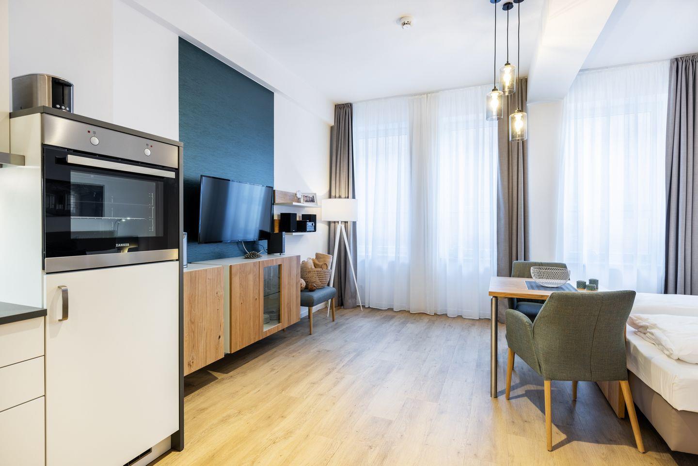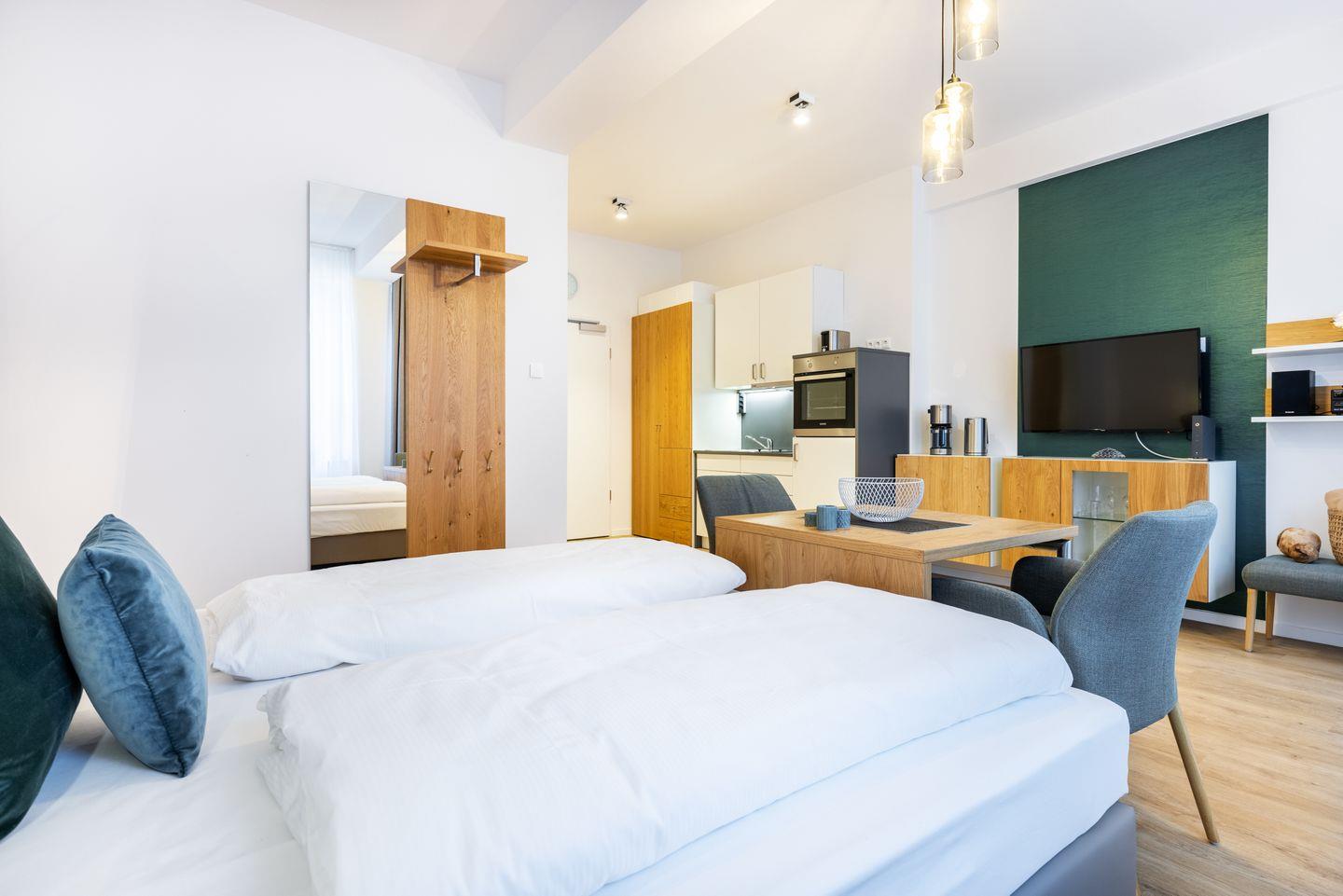 Das helle und moderne Nichtraucher-Apartment verfügt über Fußbodenheizung, kostenfreies WLAN und eine voll ausgestattete offene Küche mit Geschirrspüler, Kühlschrank, einen Herd mit 2 Glaskeramikkochfeldern und Backofen, Kaffeemaschine, Toaster, Wasserkocher und Mixstab. Im kombinierten Wohn-Schlafbereich befinden sich ein komfortables Boxspring-Doppelbett (1,80 x 2,00 m), ein Flatscreen-TV (40 Zoll) und eine Musikanlage. Das Apartment verfügt über einen Safe für Laptopgröße bis ca. 17 Zoll. Im modernen Badezimmer stehen euch eine ebenerdige Regendusche, ein Waschtisch, WC, ein Handtuchwärmer sowie ein Föhn zur Verfügung.