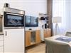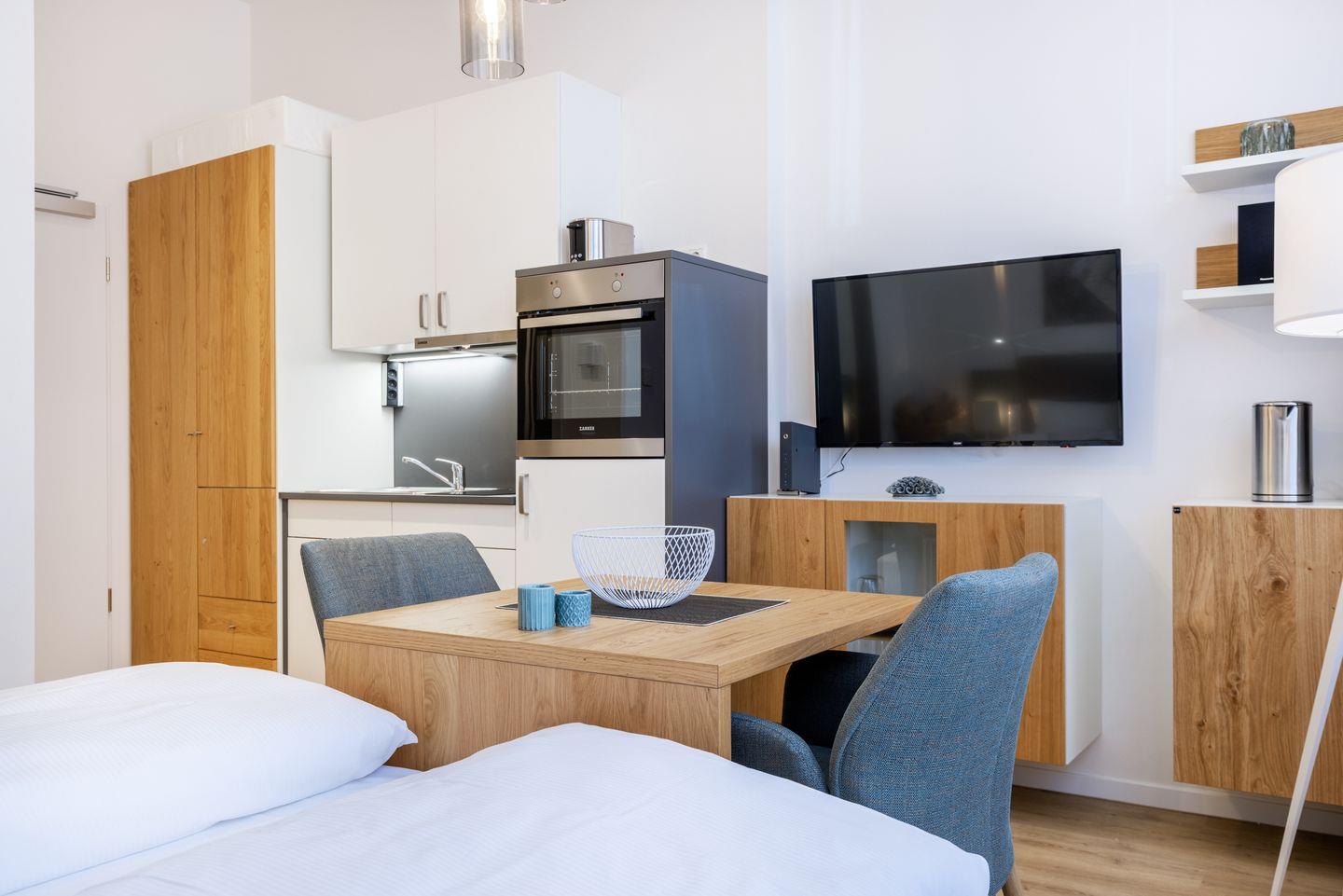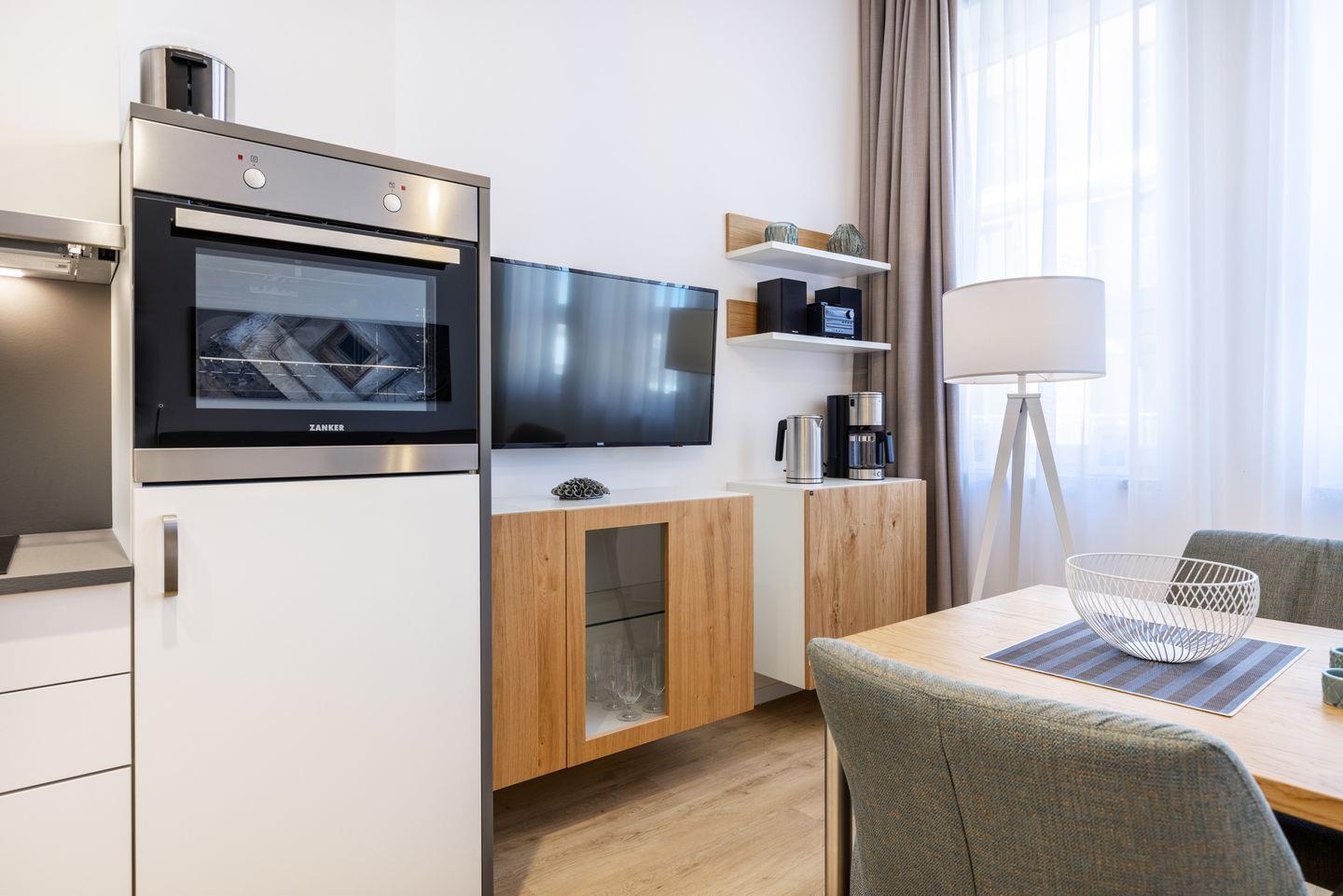 Das helle und moderne Nichtraucher-Apartment verfügt über Fußbodenheizung, kostenfreies WLAN und eine voll ausgestattete offene Küche mit Geschirrspüler, Kühlschrank, einen Herd mit 2 Glaskeramikkochfeldern und Backofen, Kaffeemaschine, Toaster, Wasserkocher und Mixstab. Im kombinierten Wohn-Schlafbereich befinden sich ein komfortables Boxspring-Doppelbett (1,80 x 2,00 m), ein Flatscreen-TV (40 Zoll) und eine Musikanlage. Das Apartment verfügt über einen Safe für Laptopgröße bis ca. 17 Zoll. Im modernen Badezimmer stehen euch eine ebenerdige Regendusche, ein Waschtisch, WC, ein Handtuchwärmer sowie ein Föhn zur Verfügung.