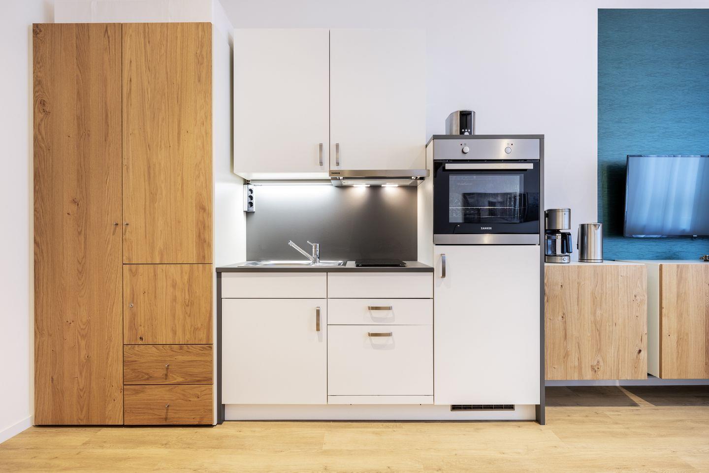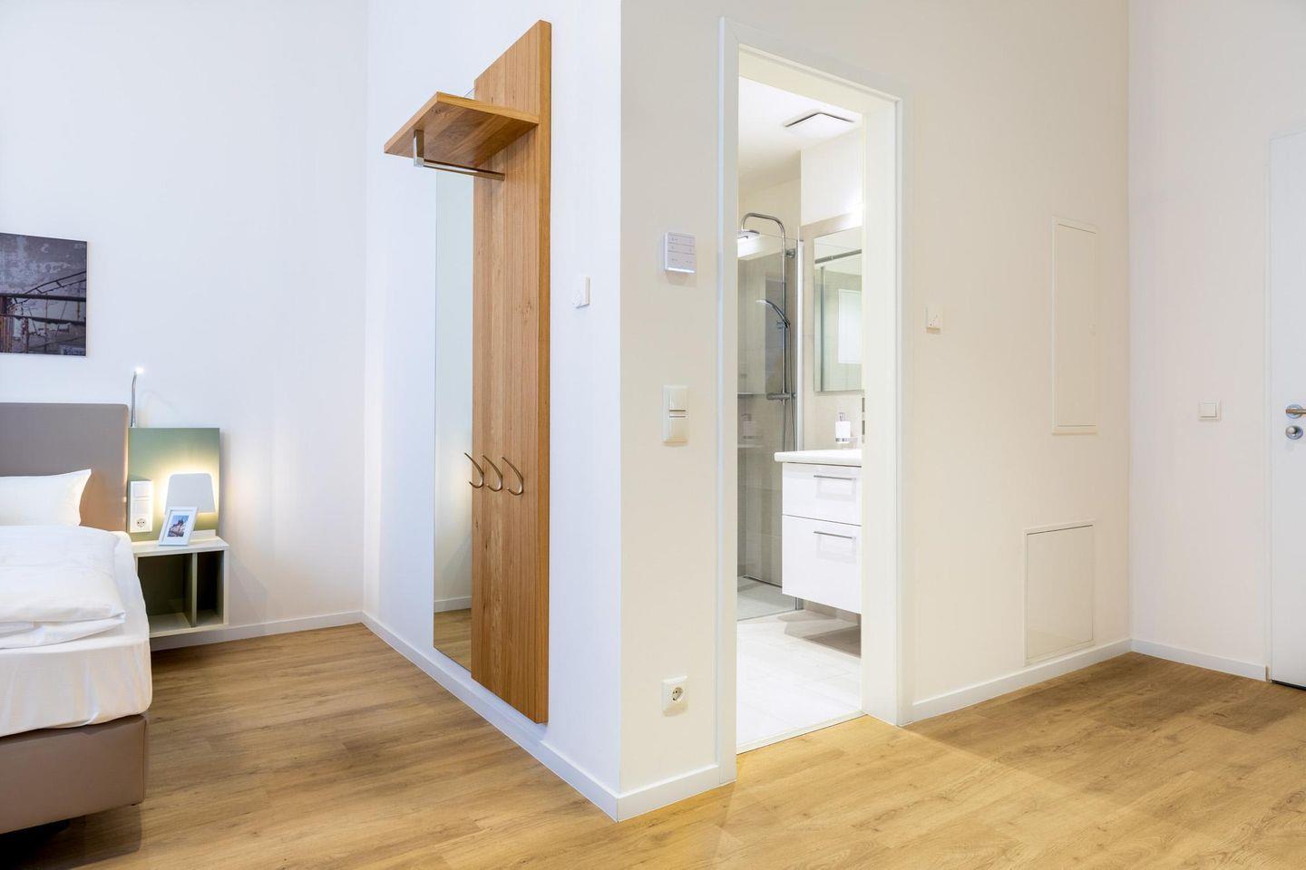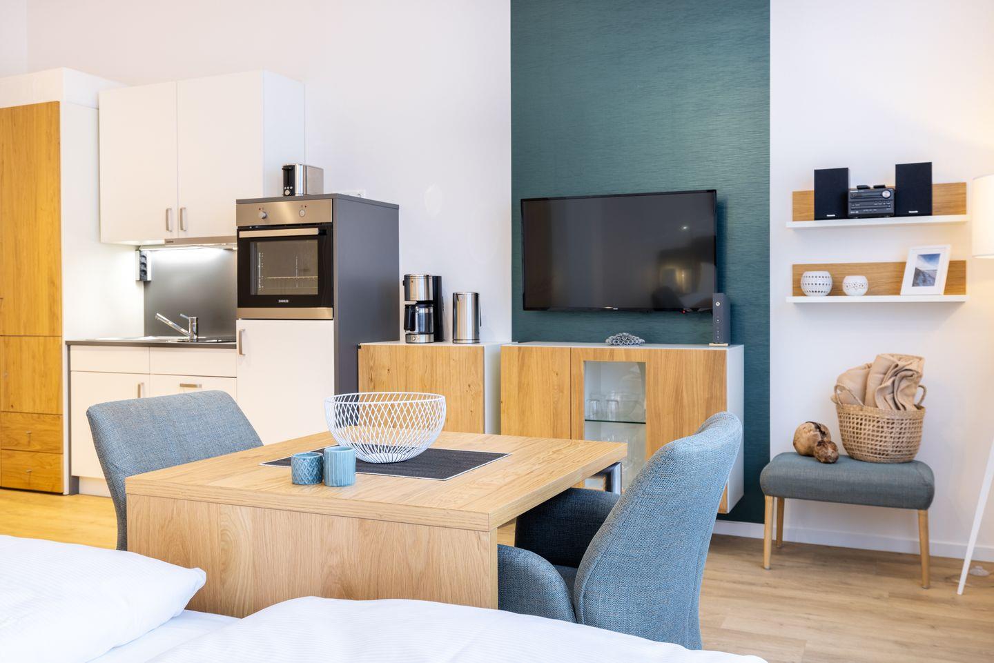 Das helle und moderne Nichtraucher-Apartment verfügt über Fußbodenheizung, kostenfreies WLAN und eine voll ausgestattete offene Küche mit Geschirrspüler, Kühlschrank, einen Herd mit 2 Glaskeramikkochfeldern und Backofen, Kaffeemaschine, Toaster, Wasserkocher und Mixstab. Im kombinierten Wohn-Schlafbereich befinden sich ein komfortables Boxspring-Doppelbett (1,80 x 2,00 m), ein Flatscreen-TV (40 Zoll) und eine Musikanlage. Das Apartment verfügt über einen Safe für Laptopgröße bis ca. 17 Zoll. Im modernen Badezimmer stehen euch eine ebenerdige Regendusche, ein Waschtisch, WC, ein Handtuchwärmer sowie ein Föhn zur Verfügung.