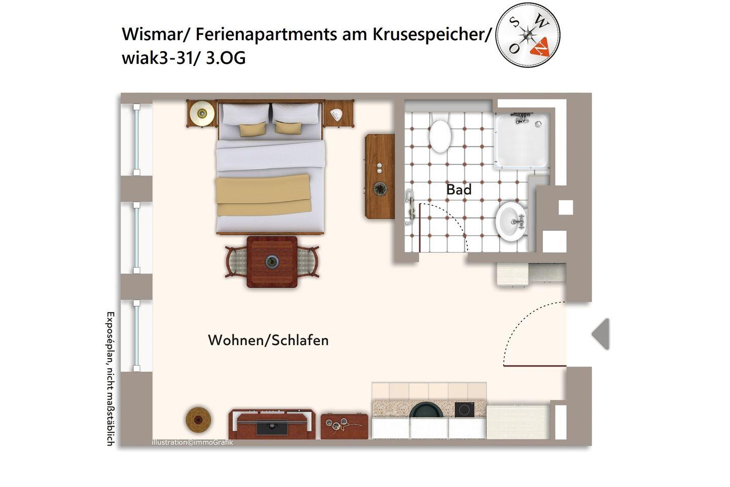 Das hochwertige Apartment befindet sich in südöstlicher Lage im dritten Obergeschoss des Gebäudes. Der Alte Hafen von Wismar, einer der attraktivsten Orte der Hansestadt, liegt euch hier zu Füßen. Von hier aus lässt sich die Stadt und das schöne Umland ideal erkunden. Der Alte Hafen ist übrigens auch ein sehr beliebter Veranstaltungsort für Events und Feste.
