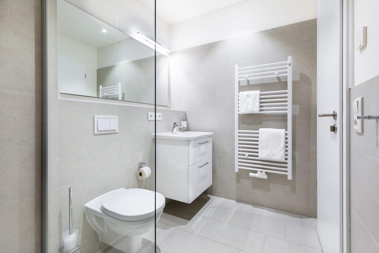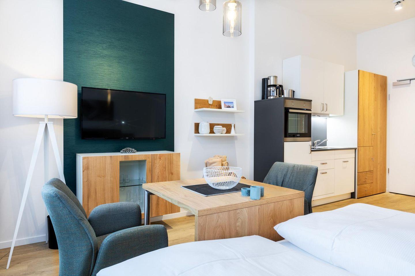 Das helle und moderne Nichtraucher-Apartment verfügt über Fußbodenheizung, kostenfreies WLAN und eine voll ausgestattete offene Küche mit Geschirrspüler, Kühlschrank, einen Herd mit 2 Glaskeramikkochfeldern und Backofen, Kaffeemaschine, Toaster, Wasserkocher und Mixstab. Im kombinierten Wohn-Schlafbereich befinden sich ein komfortables Boxspring-Doppelbett (1,80 x 2,00 m), ein Flatscreen-TV (40 Zoll) und eine Musikanlage. Das Apartment verfügt über einen Safe für Laptopgröße bis ca. 17 Zoll. Im modernen Badezimmer stehen euch eine ebenerdige Regendusche, ein Waschtisch, WC, ein Handtuchwärmer sowie ein Föhn zur Verfügung.