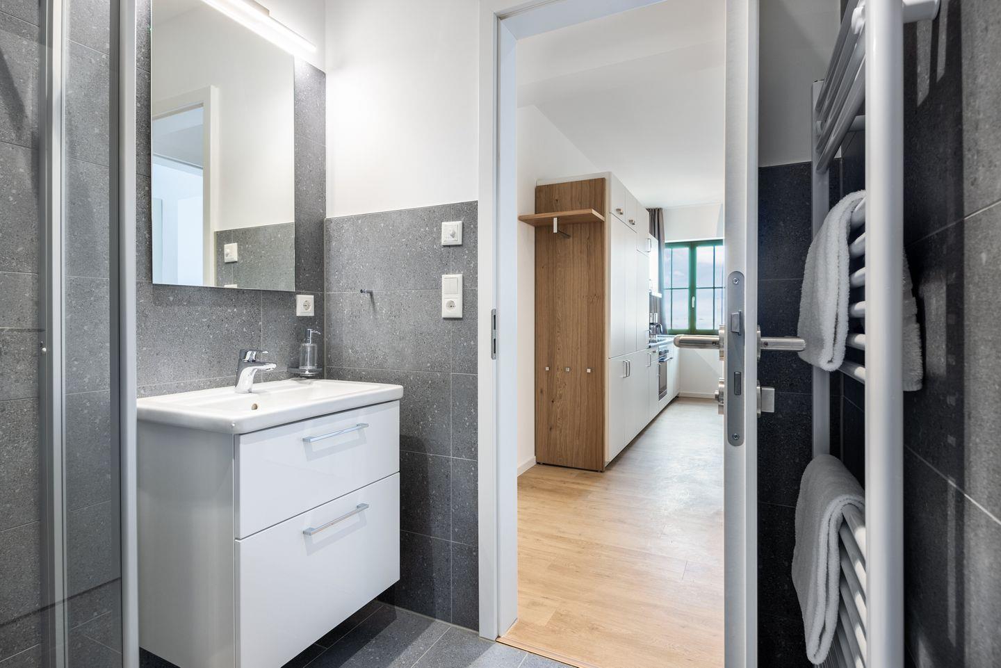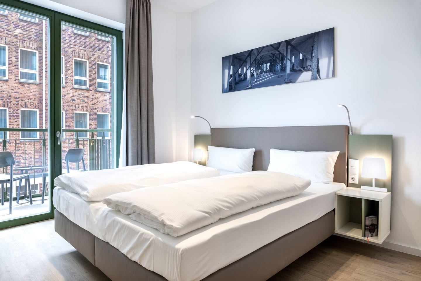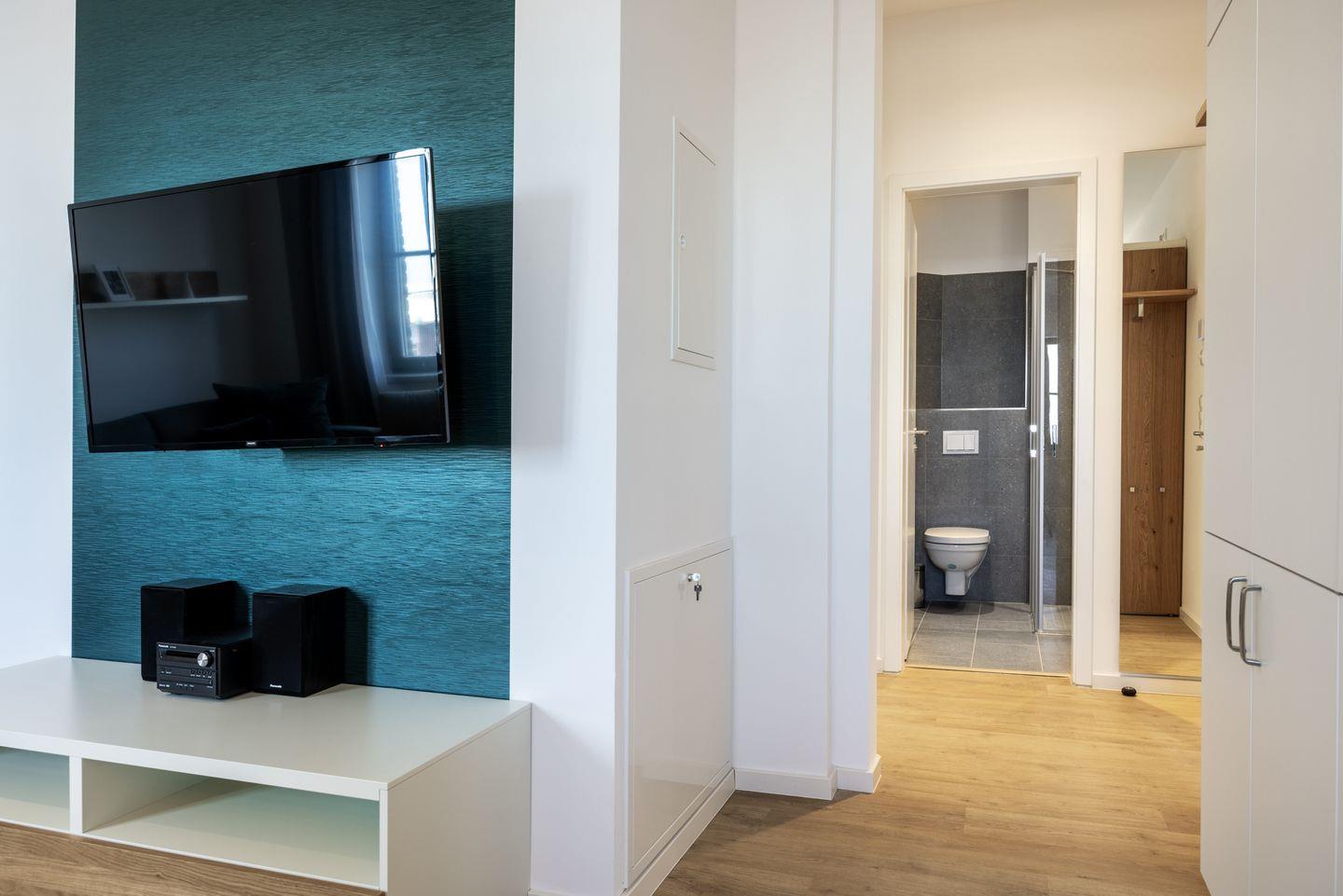 Das helle Apartment verfügt über bodentiefe Fenster im Schlafzimmer, Fußbodenheizung, kostenfreies WLAN und eine voll ausgestattete offene Küche mit Geschirrspüler, Kühlschrank mit Tiefkühlfach, Herd mit 4 Glaskeramikkochfeldern und Backofen, Kaffeemaschine, Toaster, Wasserkocher und Mixstab. Im kombinierten Wohn-Essbereich befinden sich eine Doppelschlafcouch (1,40 x 2,00 m), ein Flatscreen-TV (42 Zoll), eine HiFi-Anlage sowie Gesellschaftsspiele. Genießt schöne Stunden auf dem Balkon mit Blick zum Hafen. Das Schlafzimmer beinhaltet ein komfortables Boxspring-Doppelbett (1,80 x 2,00 m) und einen Flatscreen-TV (42 Zoll). Im geschmackvollen Badezimmer stehen euch eine ebenerdige Regendusche, ein Waschtisch, WC, ein Handtuchwärmer sowie ein Föhn zur Verfügung. Das Apartment verfügt über einen Safe für eine Laptopgröße bis ca. 17 Zoll.