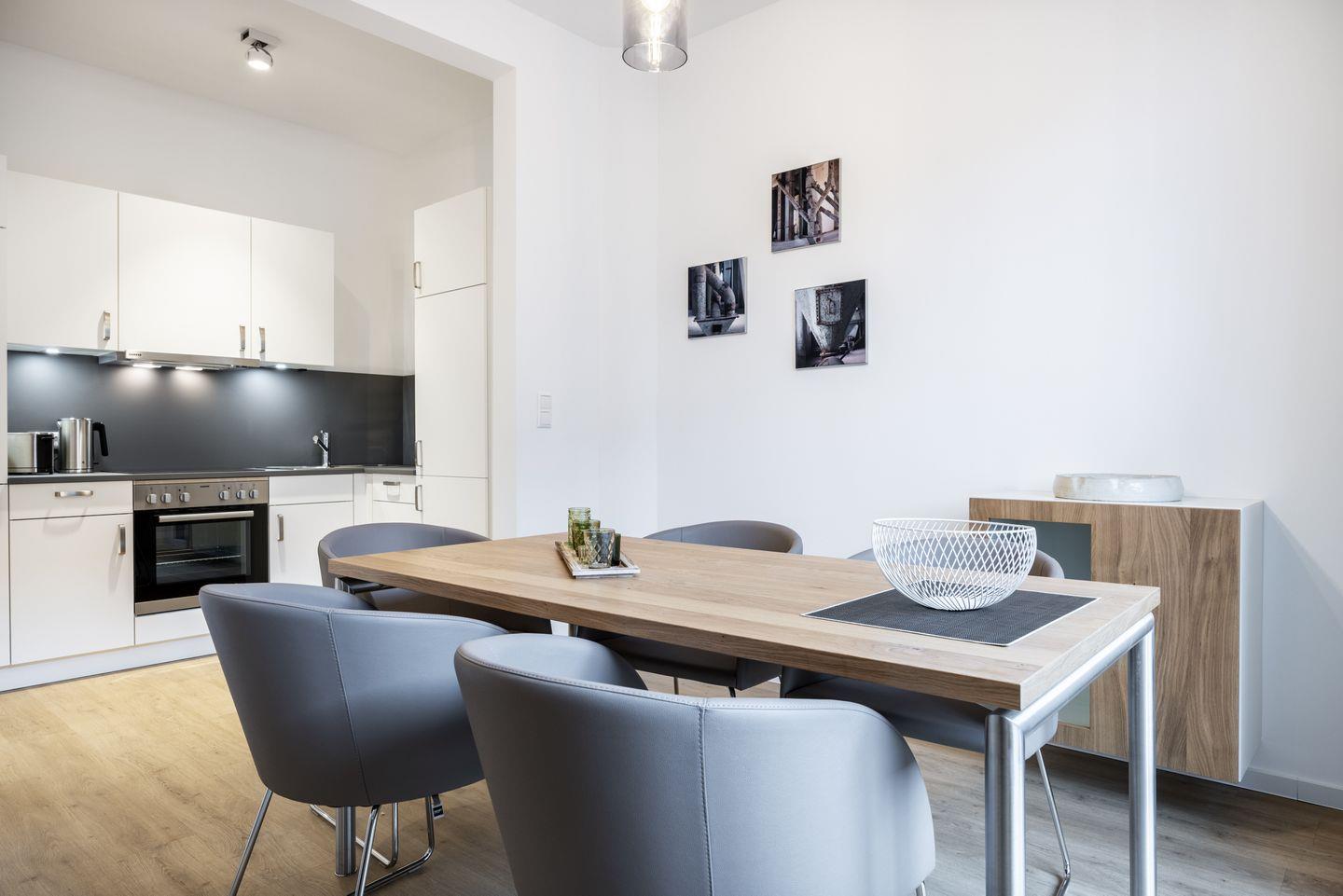 Das helle Apartment verfügt über bodentiefe Fenster, Fußbodenheizung, kostenfreies WLAN und eine voll ausgestattete offene Küche mit Geschirrspüler, Kühlschrank mit Tiefkühlfach, Herd mit 4 Glaskeramikkochfeldern und Backofen, Kaffeemaschine, Toaster, Wasserkocher und Mixstab. Im kombinierten Wohn-Essbereich befinden sich eine Doppelschlafcouch (1,40 x 2,00 m), ein Flatscreen-TV (42 Zoll), eine HiFi-Anlage sowie Gesellschaftsspiele. Beide Schlafzimmer beinhalten einen Flatscreen-TV (42 Zoll) sowie ein komfortables Boxspring-Doppelbett (1,80 x 2,00 m) bzw. ein Boxspring-Einzelbett (0,90 x 2,00 m). Im geschmackvollen Badezimmer stehen euch eine ebenerdige Regendusche, ein Waschtisch, WC, ein Handtuchwärmer sowie ein Föhn zur Verfügung. Das Apartment verfügt über einen Safe für eine Laptopgröße bis ca. 17 Zoll.