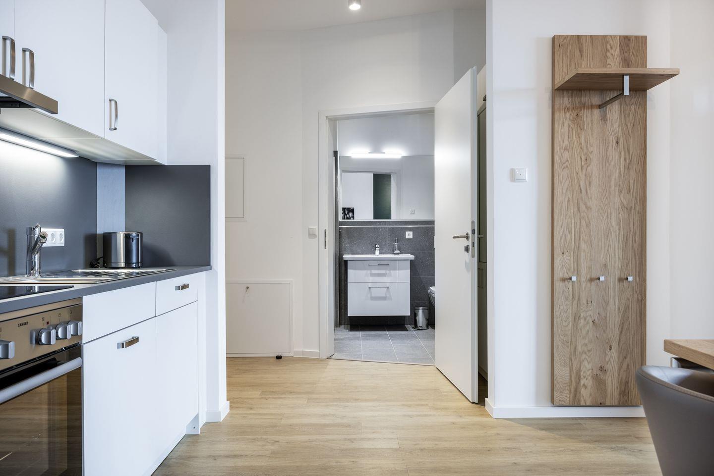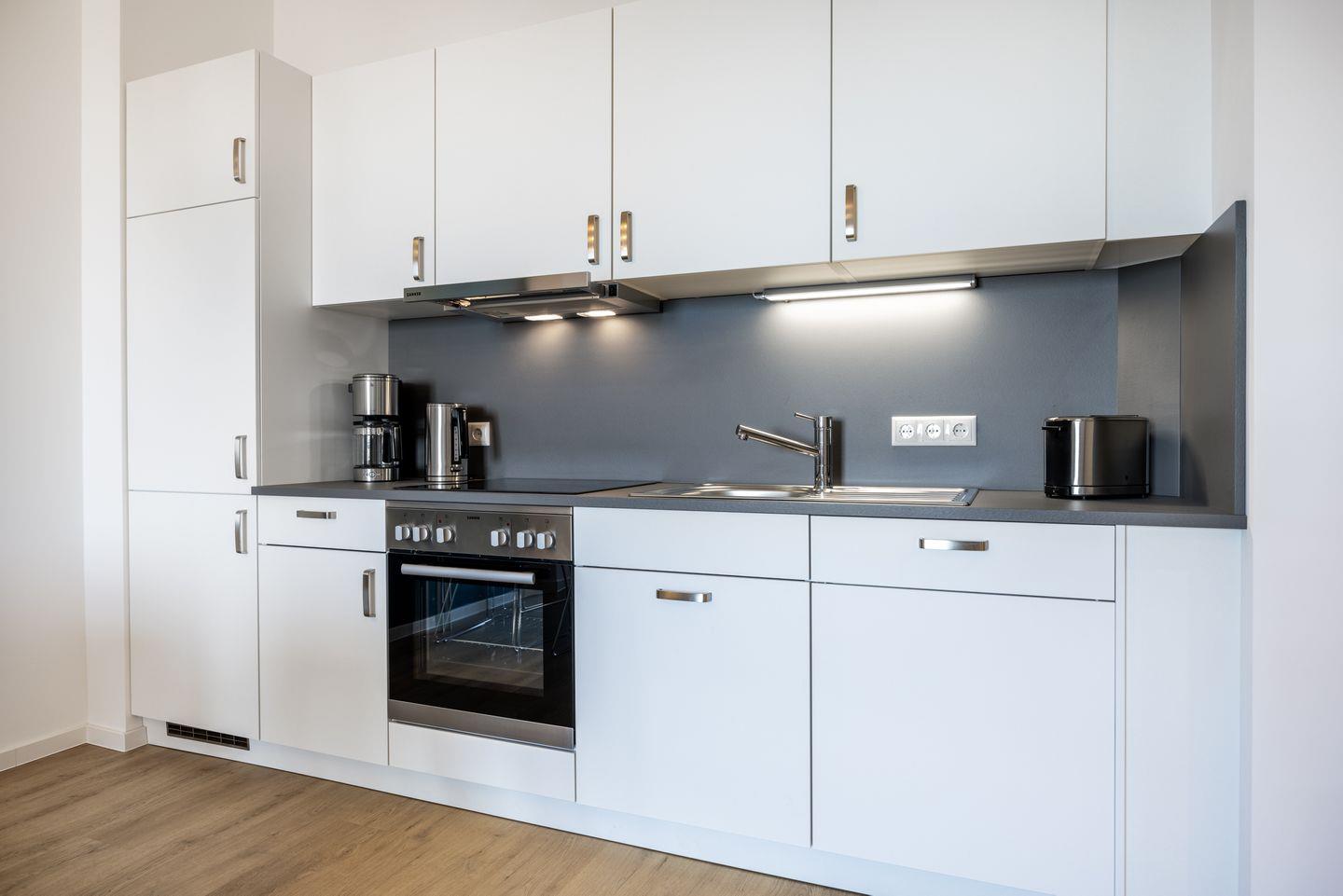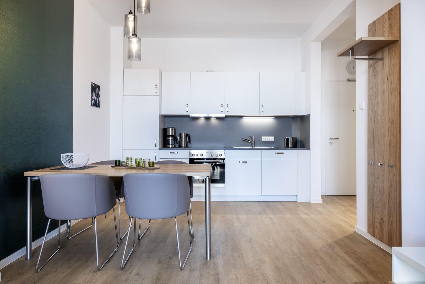 Das helle Apartment verfügt über bodentiefe Fenster, Fußbodenheizung, kostenfreies WLAN und eine voll ausgestattete offene Küche mit Geschirrspüler, Kühlschrank mit Tiefkühlfach, Herd mit 4 Glaskeramikkochfeldern und Backofen, Kaffeemaschine, Toaster, Wasserkocher und Mixstab. Im kombinierten Wohn-Essbereich befinden sich eine Doppelschlafcouch (1,40 x 2,00 m), ein Flatscreen-TV (42 Zoll), eine HiFi-Anlage sowie Gesellschaftsspiele. Genießt schöne Stunden auf dem Balkon mit direktem Blick zum Hafen. Das Schlafzimmer beinhaltet ein komfortables Boxspring-Doppelbett (1,80 x 2,00 m) und einen Flatscreen-TV (42 Zoll). Im geschmackvollen Badezimmer stehen euch eine ebenerdige Regendusche, ein Waschtisch, WC, ein Handtuchwärmer sowie ein Föhn zur Verfügung. Das Apartment verfügt über einen Safe für eine Laptopgröße bis ca. 17 Zoll.