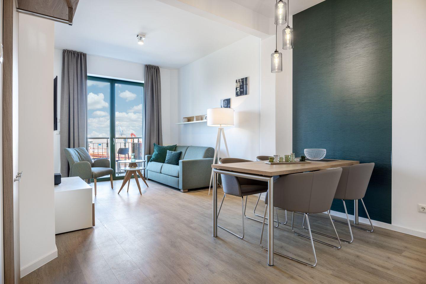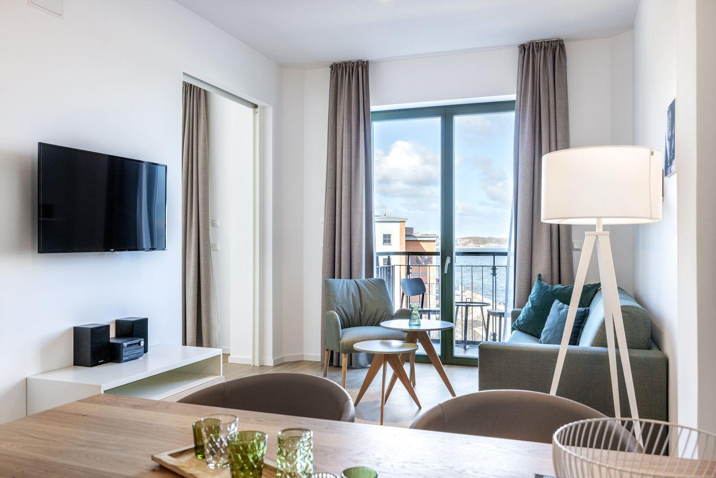 Das 49 m² große barrierearme 2-Zimmer Apartment ist für bis zu 4 Personen geeignet. Das moderne Apartment mit Balkon und direktem Blick auf den Hafen verfügt über kostenfreies WLAN.
