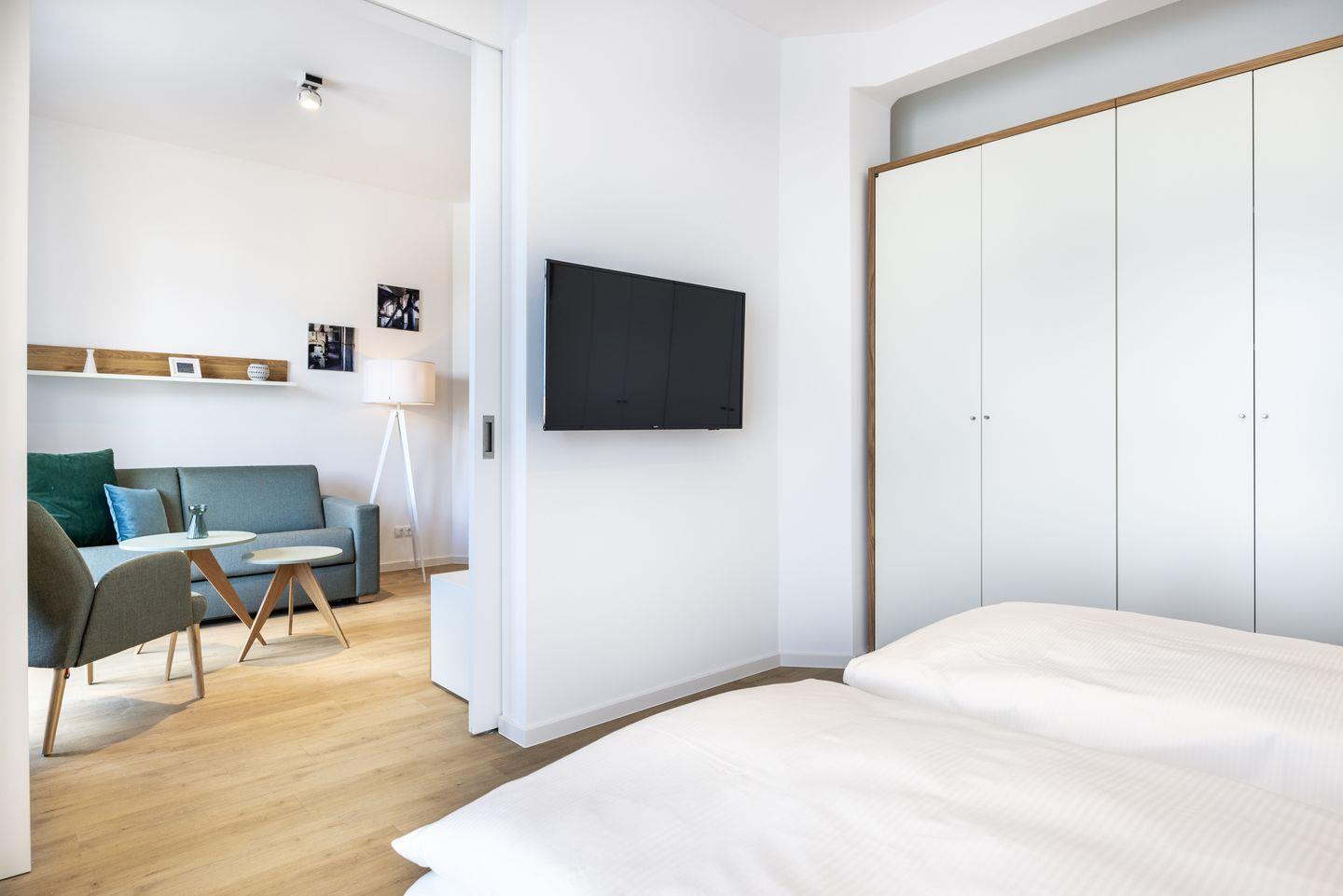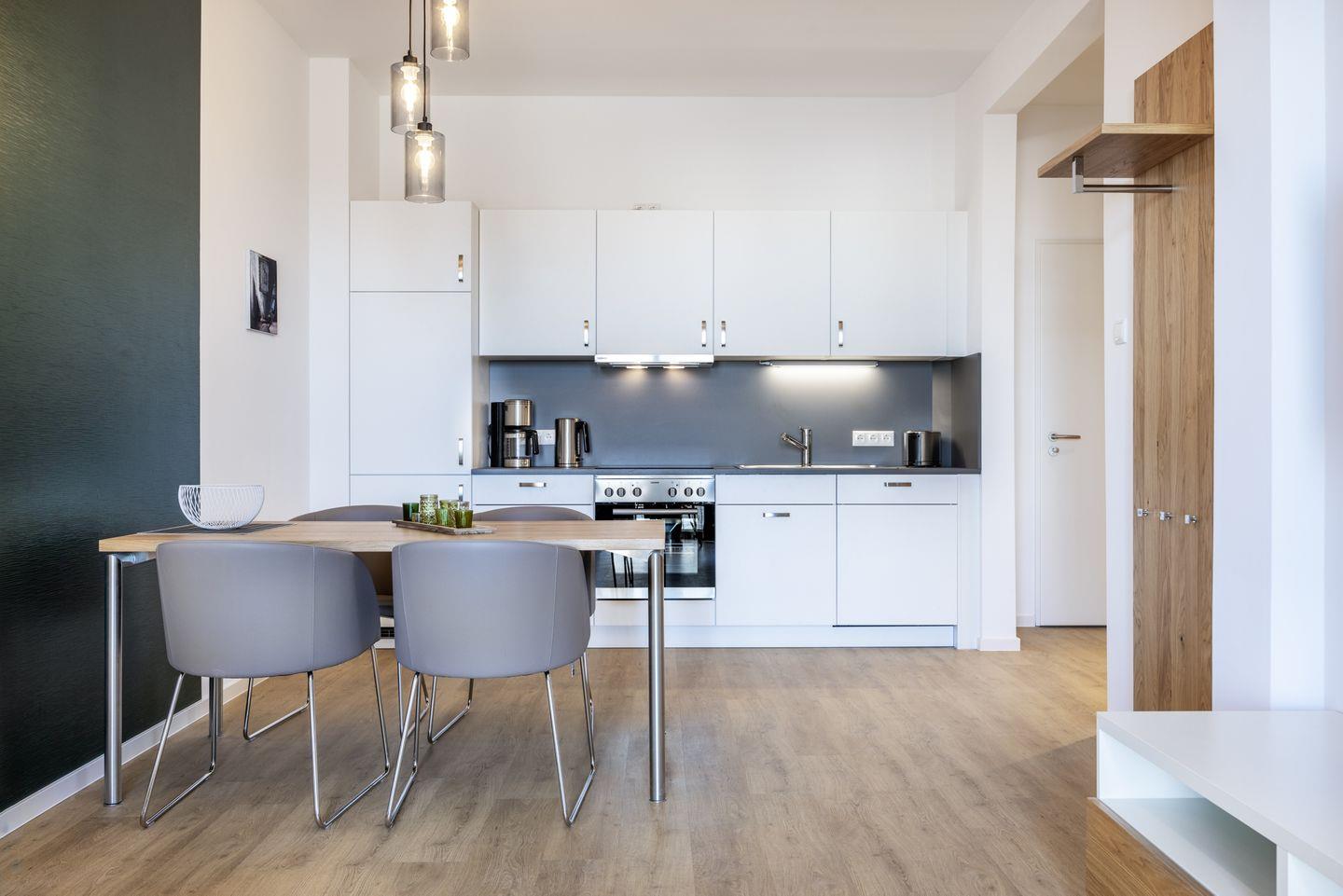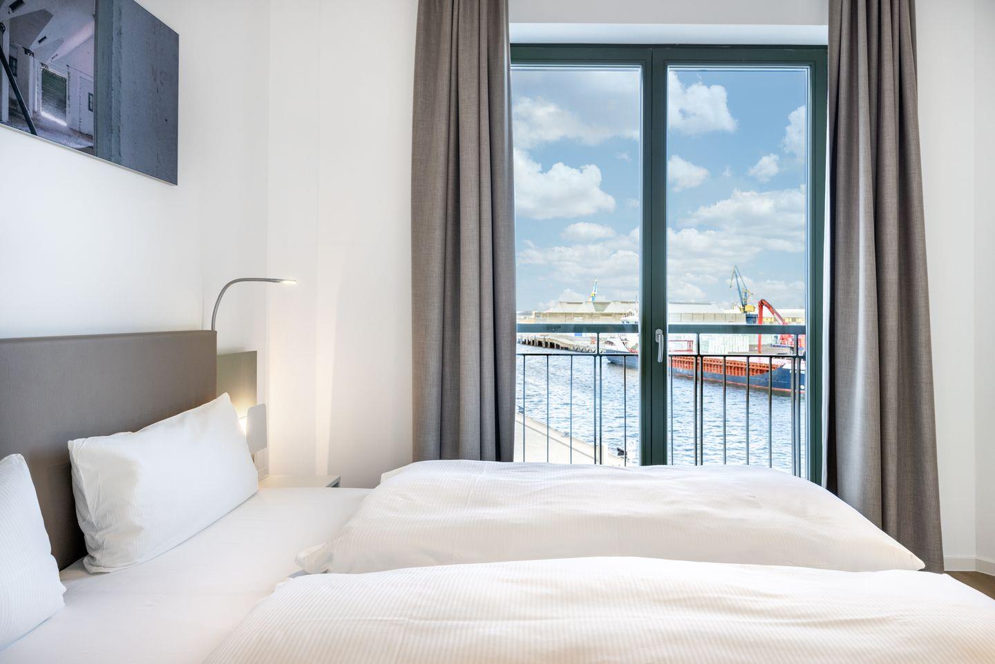 Das helle Apartment verfügt über bodentiefe Fenster, Fußbodenheizung, kostenfreies WLAN und eine voll ausgestattete offene Küche mit Geschirrspüler, Kühlschrank mit Tiefkühlfach, Herd mit 4 Glaskeramikkochfeldern und Backofen, Kaffeemaschine, Toaster, Wasserkocher und Mixstab. Im kombinierten Wohn-Essbereich befinden sich eine Doppelschlafcouch (1,40 x 2,00 m), ein Flatscreen-TV (42 Zoll), eine HiFi-Anlage sowie Gesellschaftsspiele. Genießt schöne Stunden auf dem Balkon mit direktem Blick zum Hafen. Das Schlafzimmer beinhaltet ein komfortables Boxspring-Doppelbett (1,80 x 2,00 m) und einen Flatscreen-TV (42 Zoll). Im geschmackvollen Badezimmer stehen euch eine ebenerdige Regendusche, ein Waschtisch, WC, ein Handtuchwärmer sowie ein Föhn zur Verfügung. Das Apartment verfügt über einen Safe für eine Laptopgröße bis ca. 17 Zoll. Haustiere sind in diesem Apartment nicht zugelassen. Ein Kinderbett kann gegen Entgelt im Schlafzimmer aufgestellt werden.