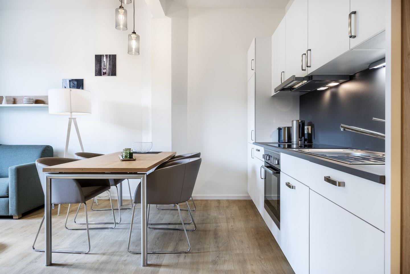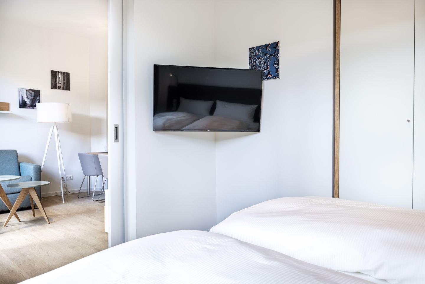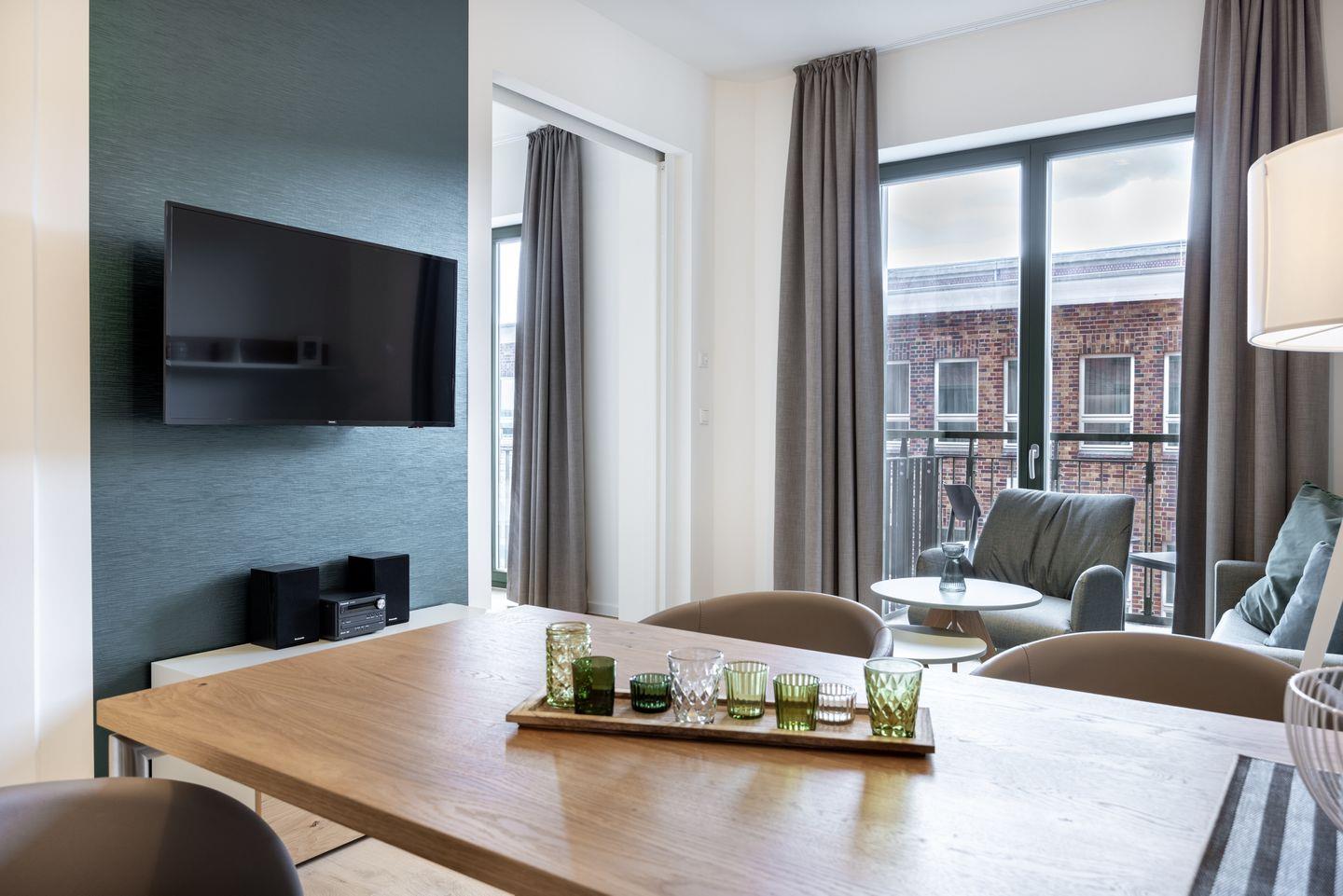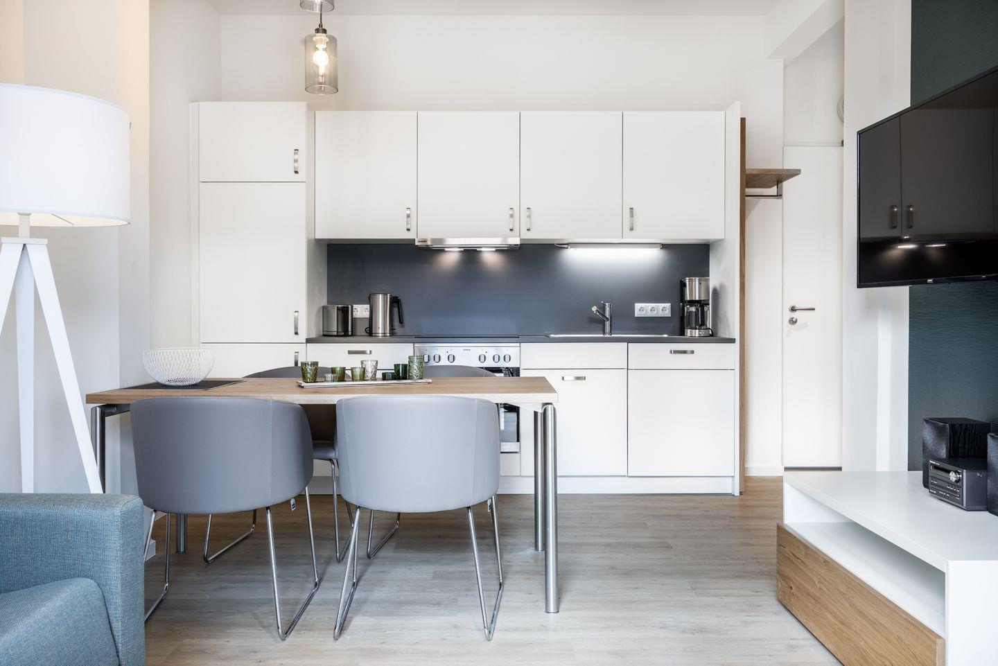 Das helle Apartment verfügt über bodentiefe Fenster, Fußbodenheizung, kostenfreies WLAN und eine voll ausgestattete offene Küche mit Geschirrspüler, Kühlschrank mit Tiefkühlfach, Herd mit 4 Glaskeramikkochfeldern und Backofen, Kaffeemaschine, Toaster, Wasserkocher und Mixstab. Im kombinierten Wohn-Essbereich befinden sich eine Einzelschlafcouch (1,20 x 2,00 m), ein Flatscreen-TV (42 Zoll), eine HiFi-Anlage sowie Gesellschaftsspiele. Genießt schöne Stunden auf dem Balkon mit Blick zum Hafen. Das Schlafzimmer beinhaltet ein komfortables Boxspring-Doppelbett (1,80 x 2,00 m) und einen Flatscreen-TV (42 Zoll). Im geschmackvollen Badezimmer stehen euch eine ebenerdige Regendusche, ein Waschtisch, WC, ein Handtuchwärmer sowie ein Föhn zur Verfügung. Das Apartment verfügt über einen Safe für eine Laptopgröße bis ca. 17 Zoll.