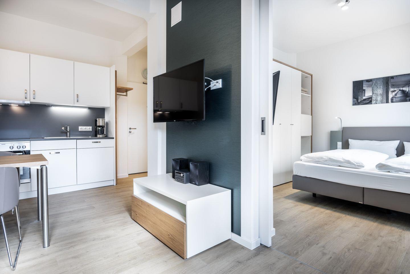Das 38 m² große barrierearme 2-Zimmer Apartment ist für bis zu 3 Personen geeignet. Das moderne Apartment mit Balkon und seitlichem Hafenblick verfügt über kostenfreies WLAN.