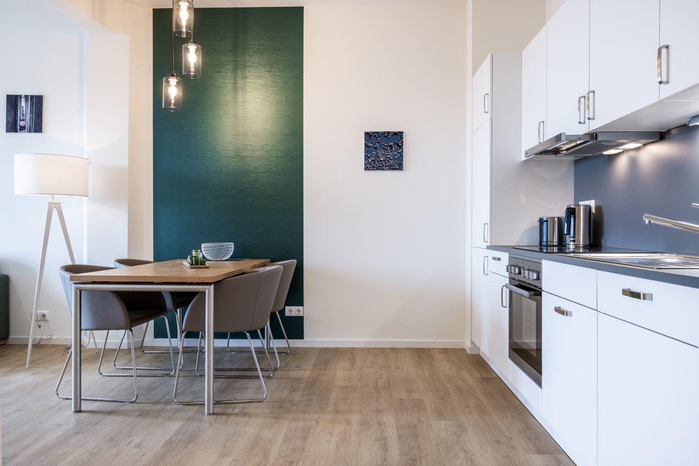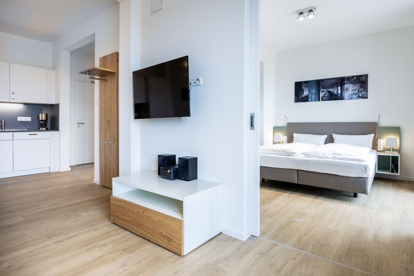 Das helle Apartment verfügt über bodentiefe Fenster, Fußbodenheizung, kostenfreies WLAN und eine voll ausgestattete offene Küche mit Geschirrspüler, Kühlschrank mit Tiefkühlfach, Herd mit 4 Glaskeramikkochfeldern und Backofen, Kaffeemaschine, Toaster, Wasserkocher und Mixstab. Im kombinierten Wohn-Essbereich befinden sich eine Doppelschlafcouch (1,40 x 2,00 m), ein Flatscreen-TV (42 Zoll), eine HiFi-Anlage sowie Gesellschaftsspiele. Genießt schöne Stunden auf dem Balkon mit direktem Blick zum Hafen. Das Schlafzimmer beinhaltet ein komfortables Boxspring-Doppelbett (1,80 x 2,00 m) und einen Flatscreen-TV (42 Zoll). Im geschmackvollen Badezimmer stehen euch eine ebenerdige Regendusche, ein Waschtisch, WC, ein Handtuchwärmer sowie ein Föhn zur Verfügung. Das Apartment verfügt über einen Safe für eine Laptopgröße bis ca. 17 Zoll.
