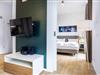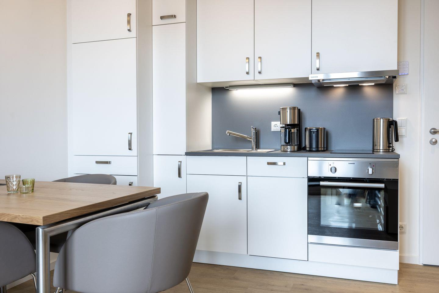 Das helle Apartment verfügt über bodentiefe Fenster, Fußbodenheizung, kostenfreies WLAN und eine voll ausgestattete offene Küche mit Geschirrspüler, Kühlschrank mit Tiefkühlfach, Herd mit 2 Glaskeramikkochfeldern und Backofen, Kaffeemaschine, Toaster, Wasserkocher und Mixstab. Im kombinierten Wohn-Essbereich befinden sich eine Einzelschlafcouch (1,20 x 2,00 m), ein Flatscreen-TV (42 Zoll), eine HiFi-Anlage sowie Gesellschaftsspiele. Auf dem Balkon genießt ihr einen Blick auf den Hafen. Das Schlafzimmer beinhaltet ein komfortables Boxspring-Doppelbett (1,80 x 2,00 m) und einen Flatscreen-TV (42 Zoll). Im geschmackvollen Badezimmer stehen euch eine ebenerdige Regendusche, ein Waschtisch, WC, ein Handtuchwärmer sowie ein Föhn zur Verfügung. Das Apartment verfügt über einen Safe für eine Laptopgröße bis ca. 17 Zoll.