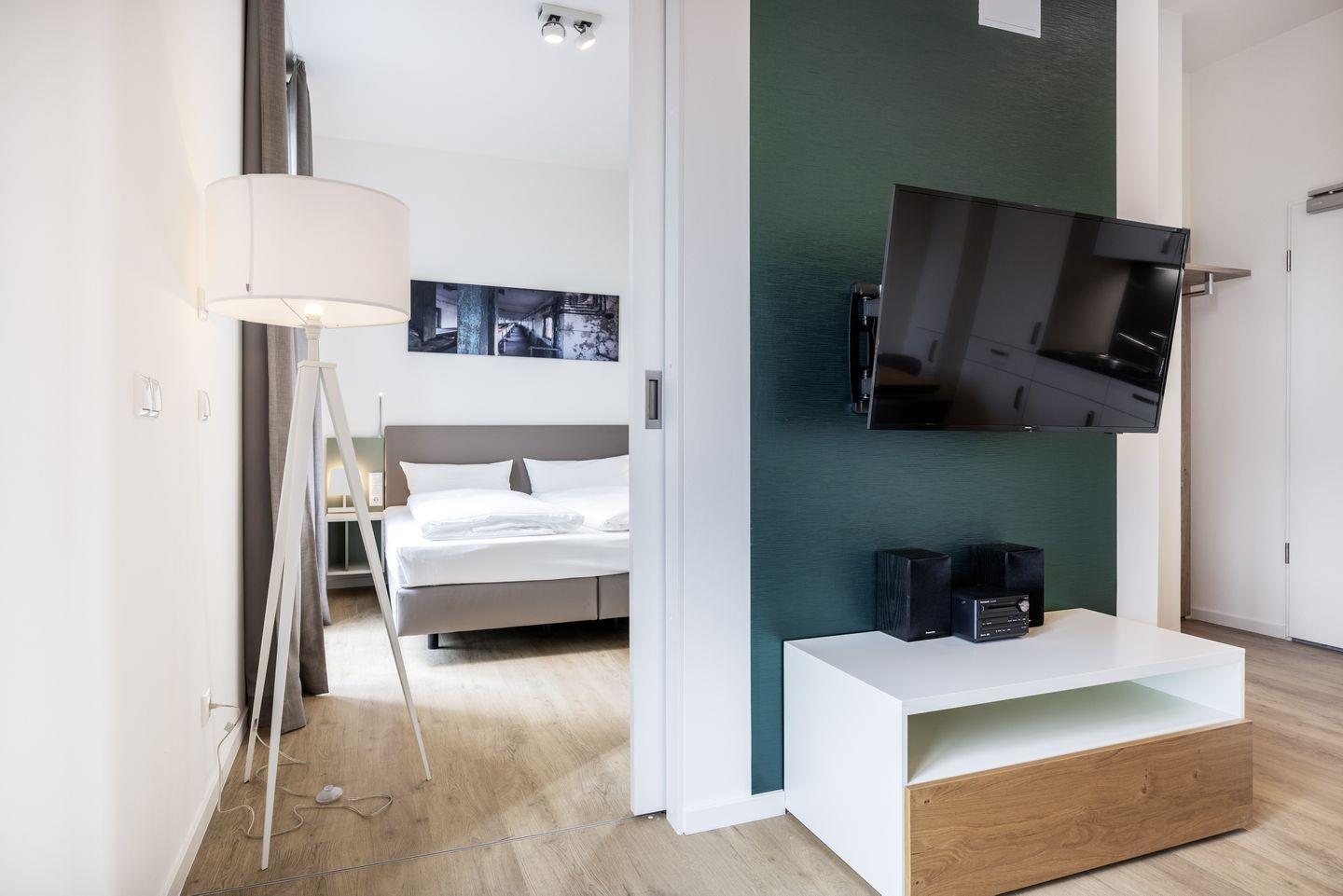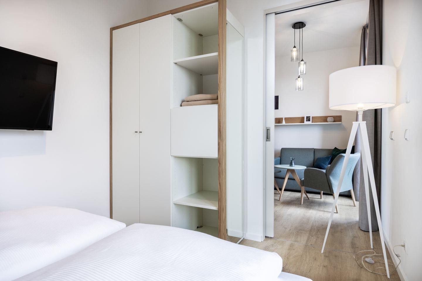 Das 34 m² große barrierearme 2-Zimmer Apartment ist für bis zu 3 Personen geeignet. Das moderne Apartment mit Balkon und seitlichem Hafenblick verfügt über kostenfreies WLAN.
