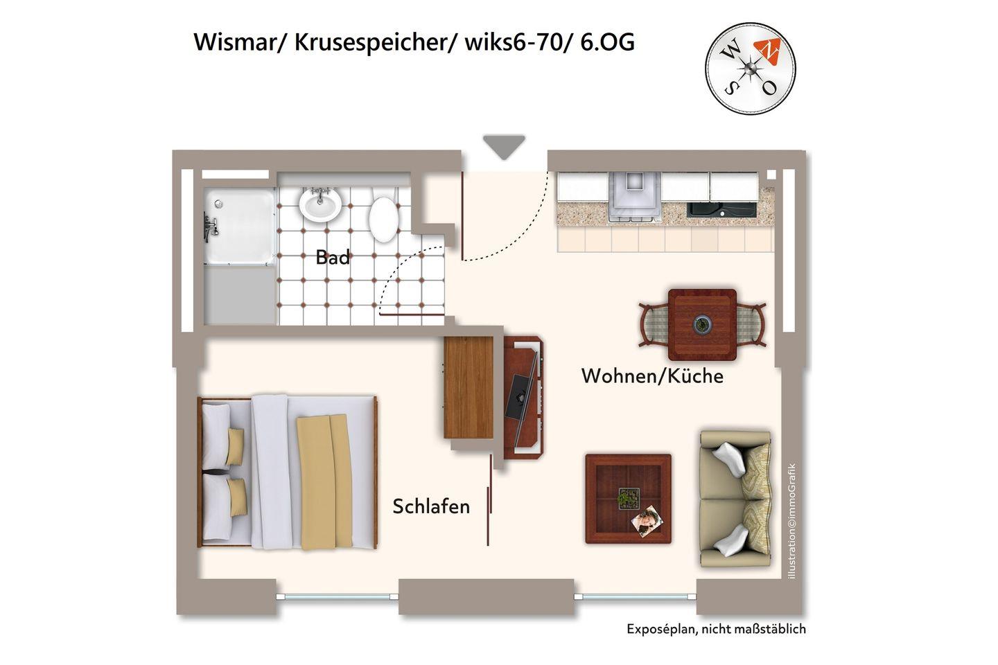 Das Nichtraucher-Apartment in Ost-Lage befindet sich im 6. Obergeschoss des denkmalgeschützten Krusespeichers. Der Alte Hafen von Wismar, einer der attraktivsten Orte der weltoffenen Hansestadt, liegt euch zu Füßen. Von hier aus lässt sich die Stadt und das wunderschöne Umland ideal erkunden. Der Alte Hafen ist übrigens überaus beliebter Veranstaltungsort für Events und Feste und überdies Original-Drehort für SOKO Wismar, die bekannte ZDF-Serie!
