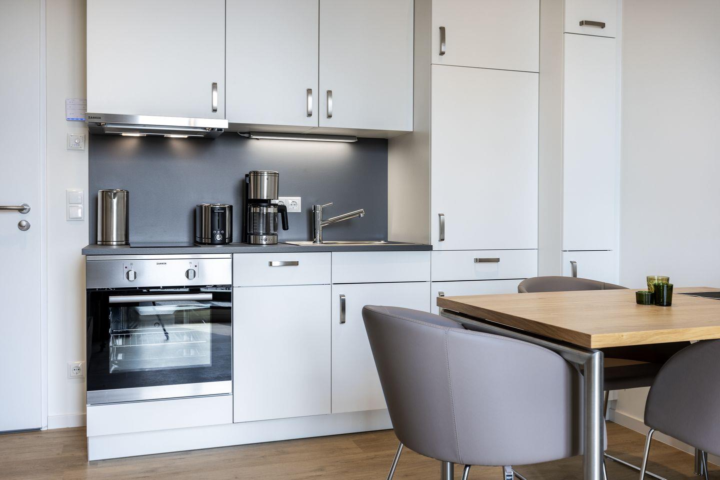 Das helle Apartment verfügt über bodentiefe Fenster, Fußbodenheizung, kostenfreies WLAN und eine voll ausgestattete offene Küche mit Geschirrspüler, Kühlschrank mit Tiefkühlfach, Herd mit 2 Glaskeramikkochfeldern und Backofen, Kaffeemaschine, Toaster, Wasserkocher und Mixstab. Im kombinierten Wohn-Essbereich befinden sich eine Einzelschlafcouch (1,20 x 2,00 m), ein Flatscreen-TV (42 Zoll), eine HiFi-Anlage sowie Gesellschaftsspiele. Genießt schöne Stunden auf dem Balkon mit Blick zum Hafen. Das Schlafzimmer beinhaltet ein komfortables Boxspring-Doppelbett (1,80 x 2,00 m) und einen Flatscreen-TV (42 Zoll). Im geschmackvollen Badezimmer stehen euch eine ebenerdige Regendusche, ein Waschtisch, WC, ein Handtuchwärmer sowie ein Föhn zur Verfügung. Das Apartment verfügt über einen Safe für eine Laptopgröße bis ca. 17 Zoll.