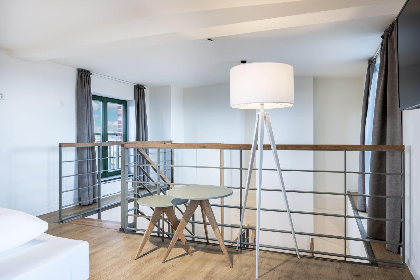 Auf der zweiten Wohnebene des Maisonette-Apartments befindet sich das Galerieschlafzimmer und die nach Westen gelegene Dachterrasse mit beeindruckendem Blick über den Hafen. Der Schlafbereich verfügt über ein komfortables Boxspring-Doppelbett (1,80 x 2,00 m) und einen Flatscreen-TV (42 Zoll).
