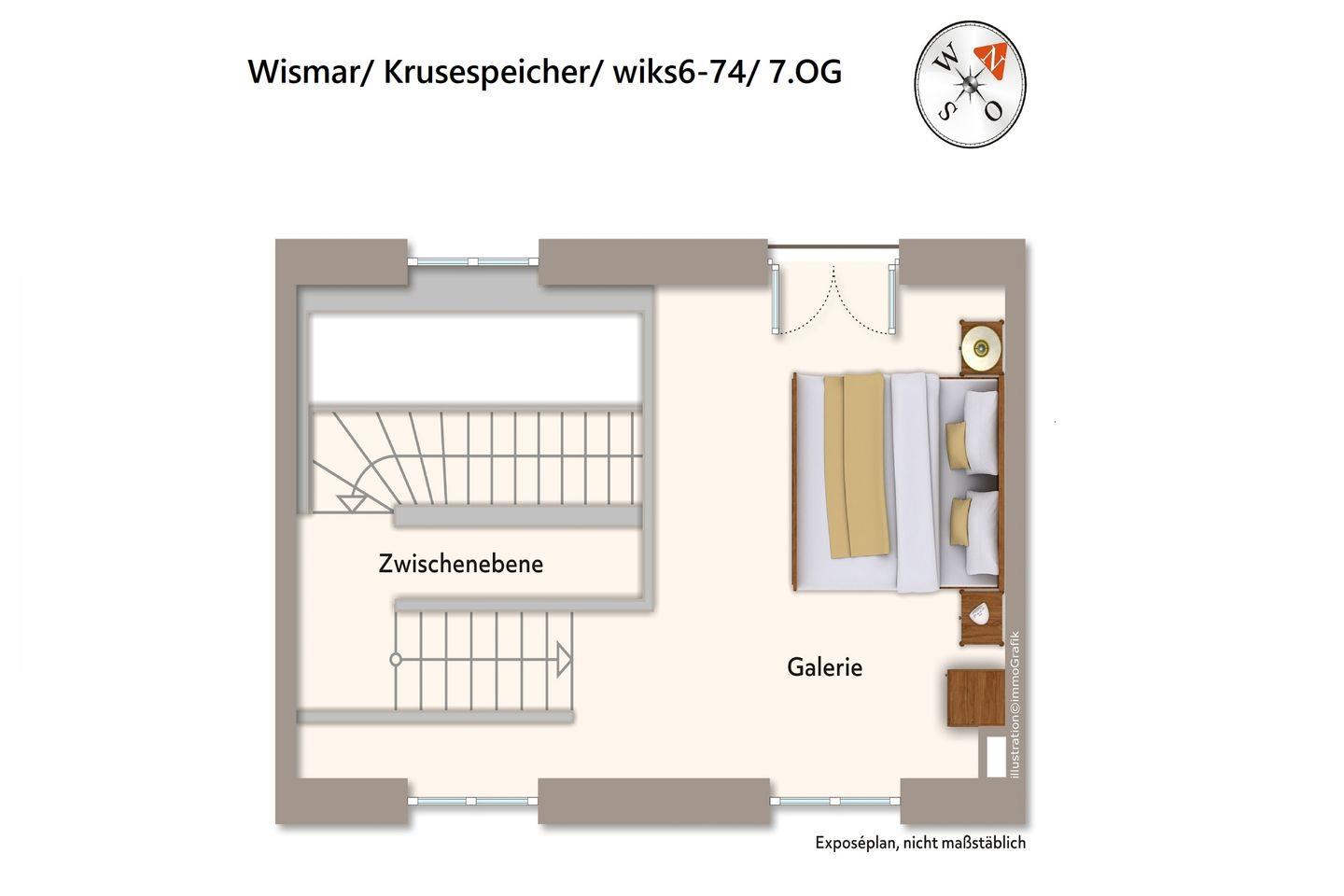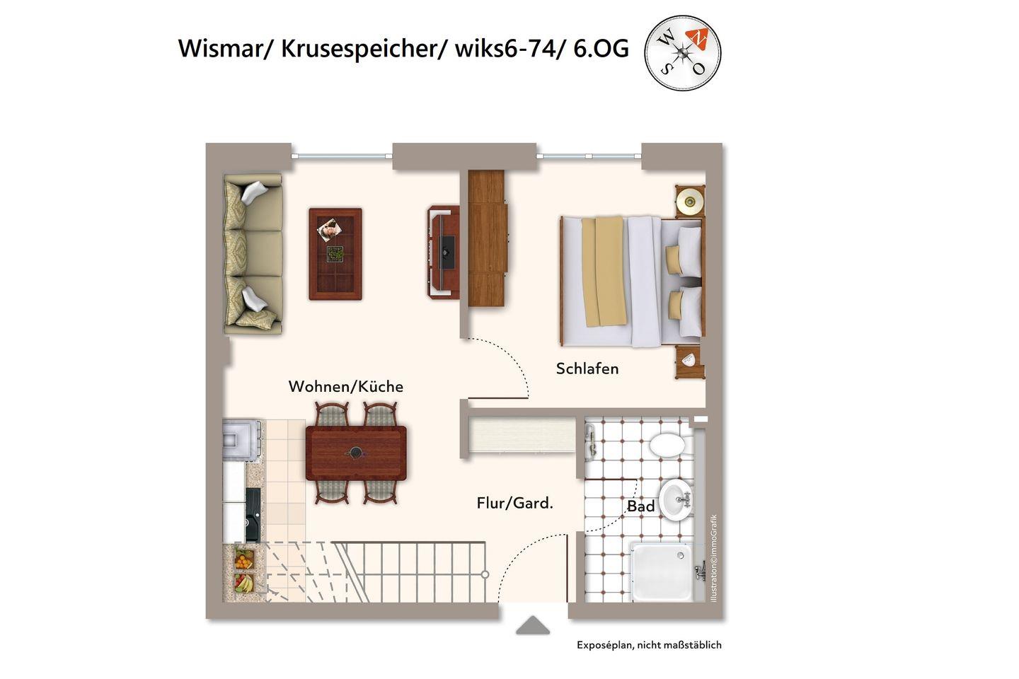 Das 73 m² große 3-Zimmer Maisonette-Apartment ist für bis zu 4 Personen geeignet. Das lichtdurchflutete Apartment verfügt über zwei Wohnebenen, einen Balkon und eine Dachterrasse mit einzigartigem Panoramablick über den Hafen von Wismar.