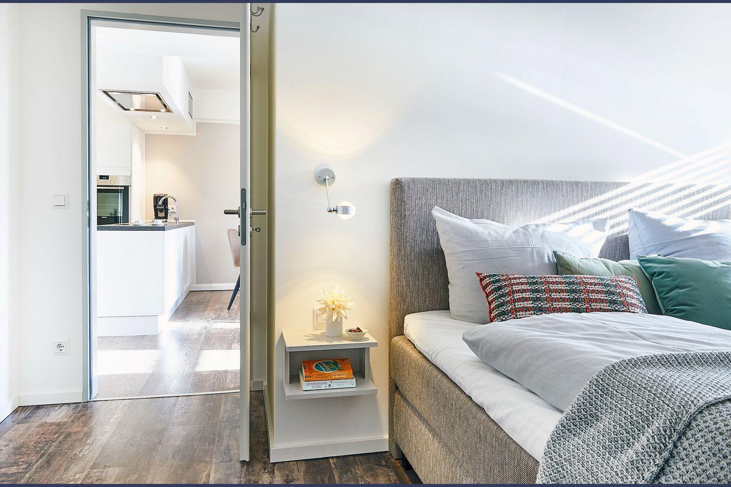 Das Schlafzimmer beinhaltet ein komfortables Boxspring-Doppelbett (1,80 x 2,00 m), einen Kleiderschrank und einen eigenen Flatscreen-TV (43 Zoll).