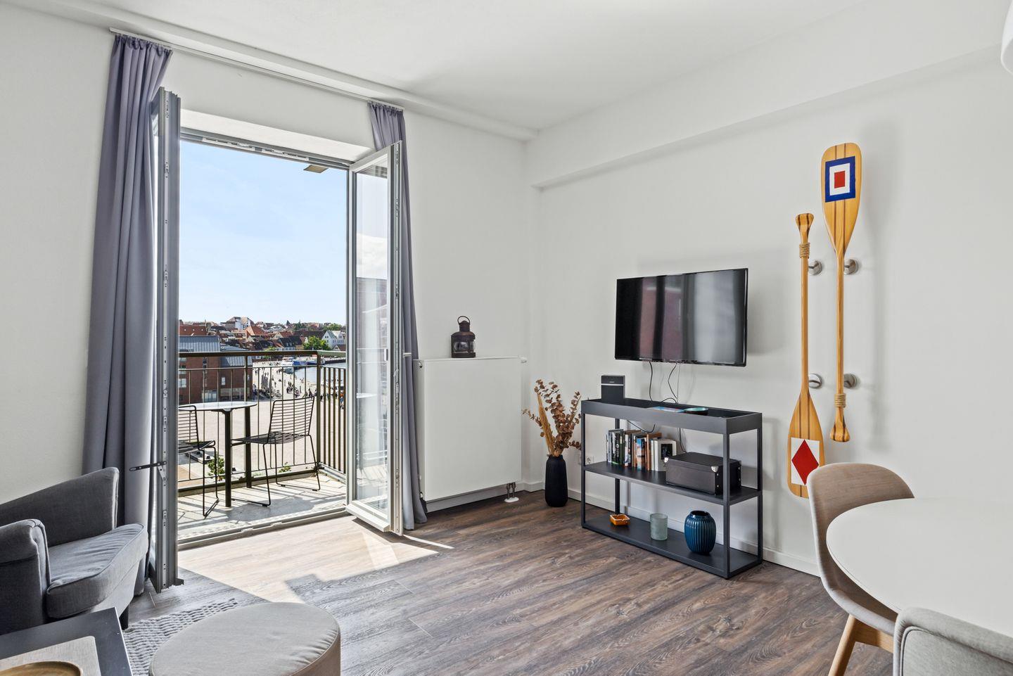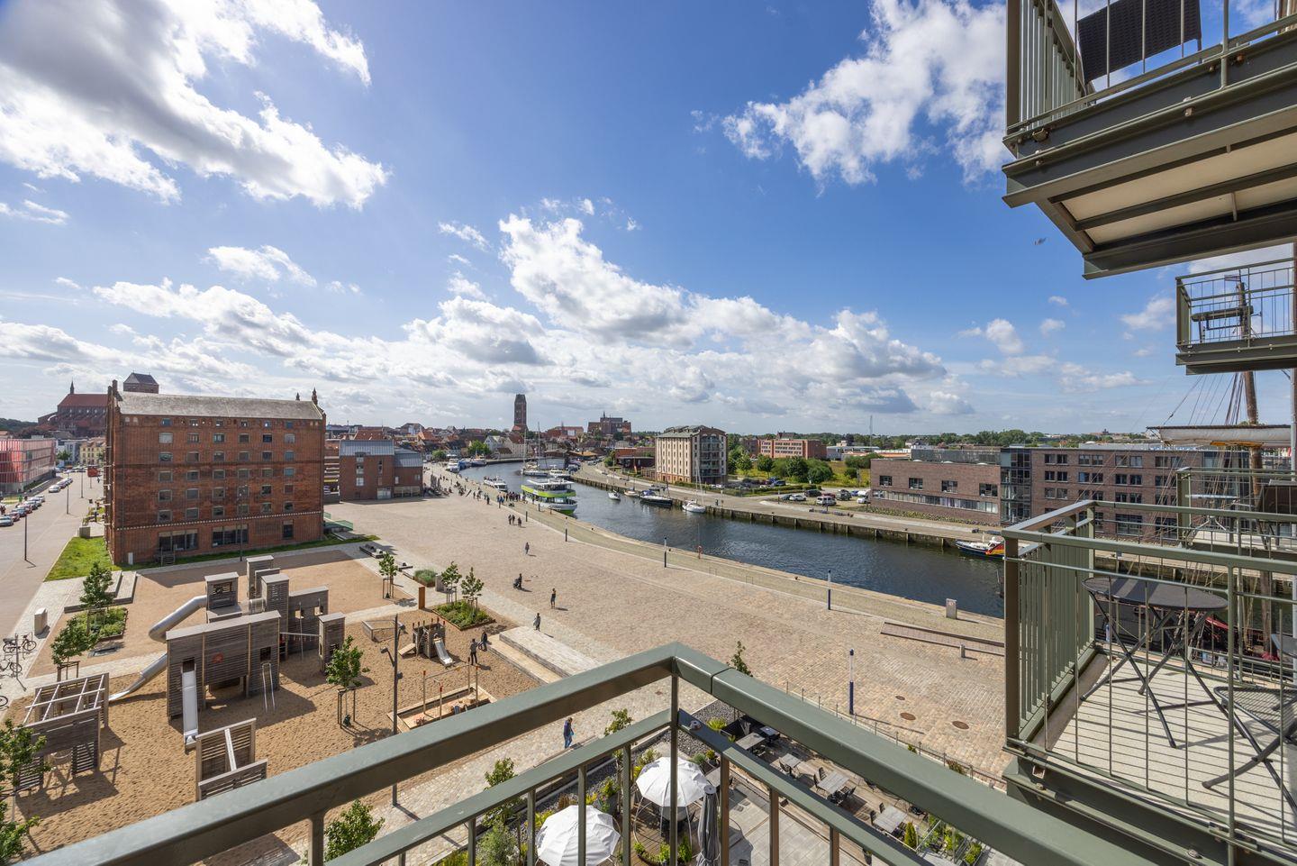 Das Apartment verfügt über einen kleinen Balkon in Süd-Ost-Lage mit Balkonmöbeln für zwei Personen - hier genießt ihr einen tollen Panoramablick auf die maritime Hafenkulisse und die Altstadt!