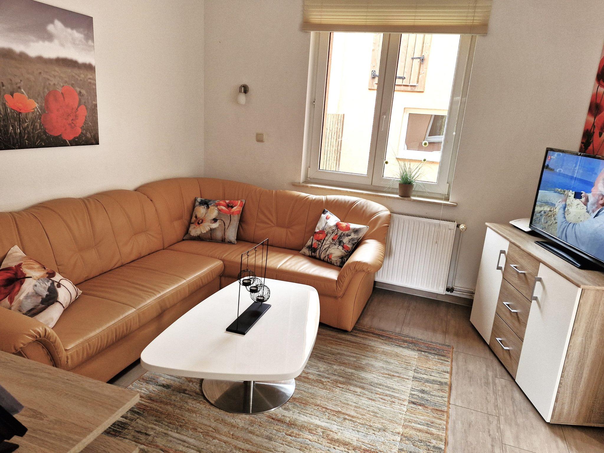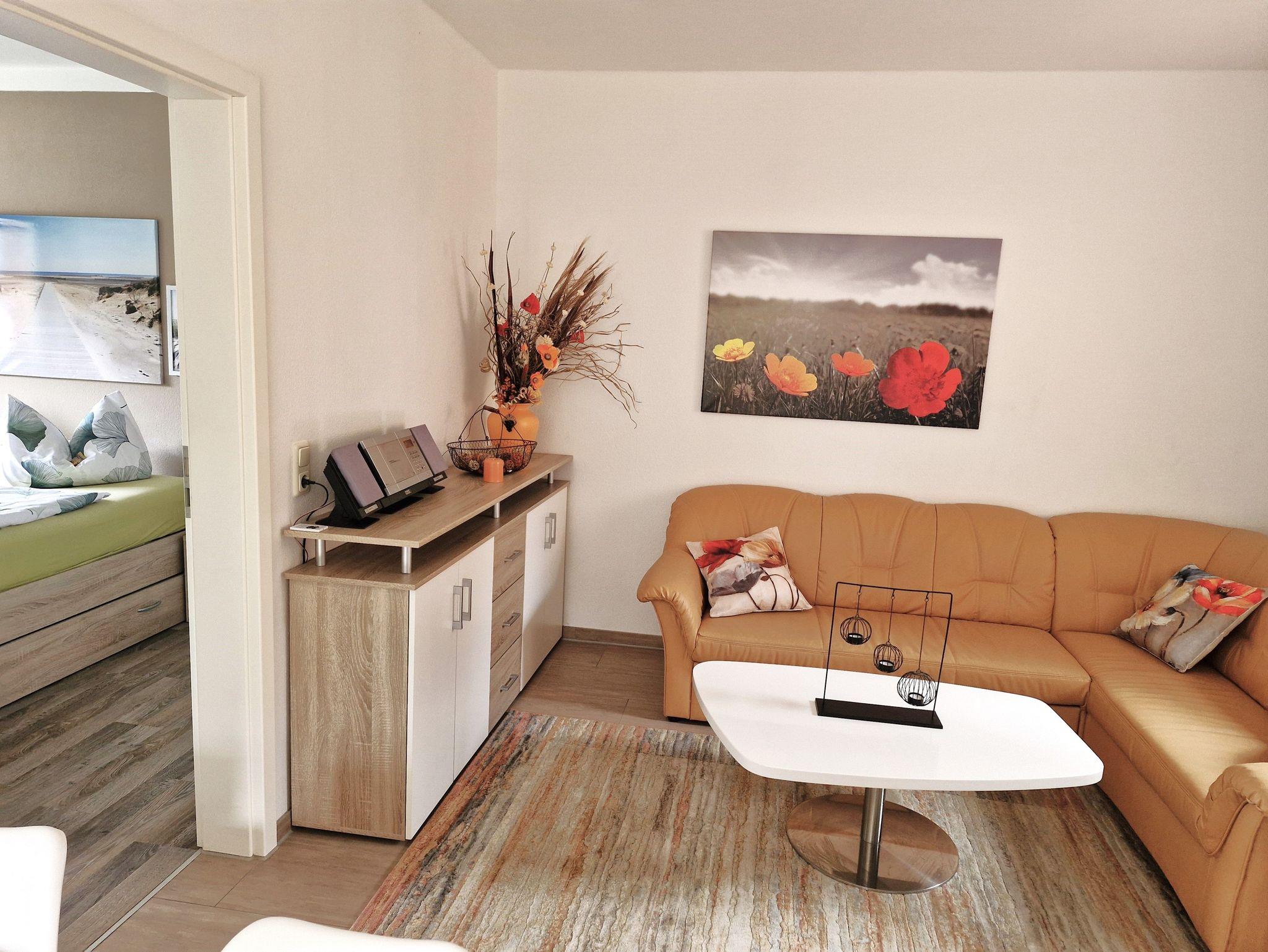 Das gemütliche Wohnzimmer verfügt über eine Couchecke, welche ausziehbar ist, TV und Radio. Von hier und dem Essbereich aus schauen Sie auf Ihre große Terrasse und das Grundstück.
