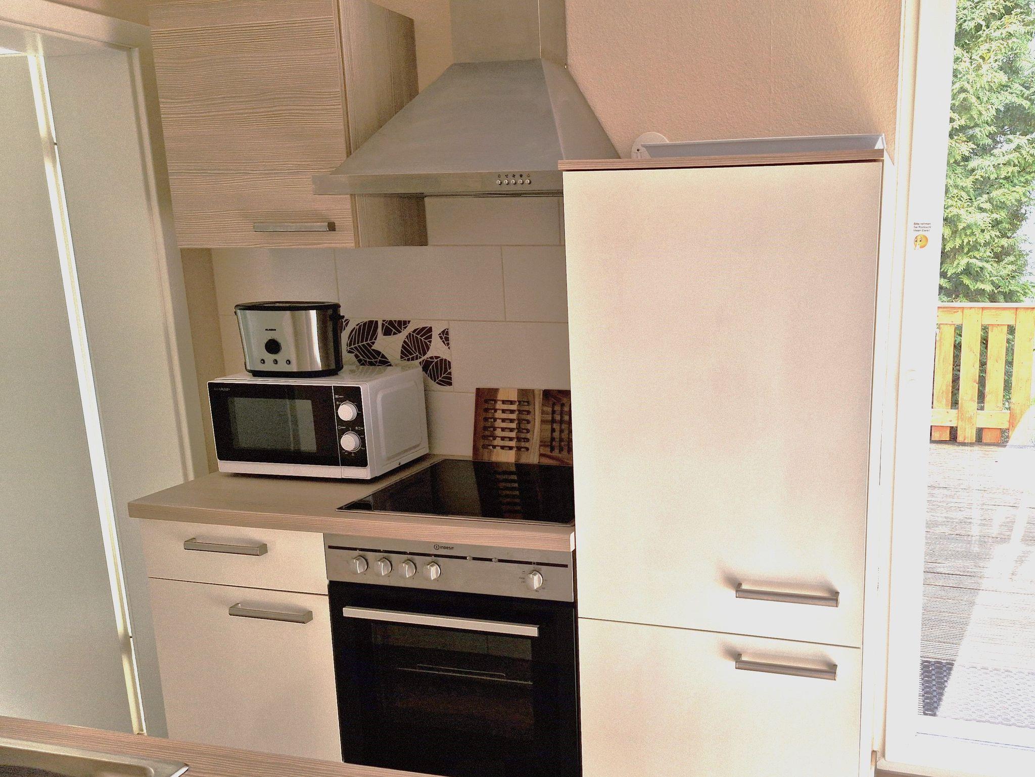 Die offene komfortable Küche ist ausgestattet mit allem, was gebraucht wird (Toaster, Kaffeemaschine, Herd mit Backofen und Abzugshaube, Mikrowelle und Geschirrspüler).